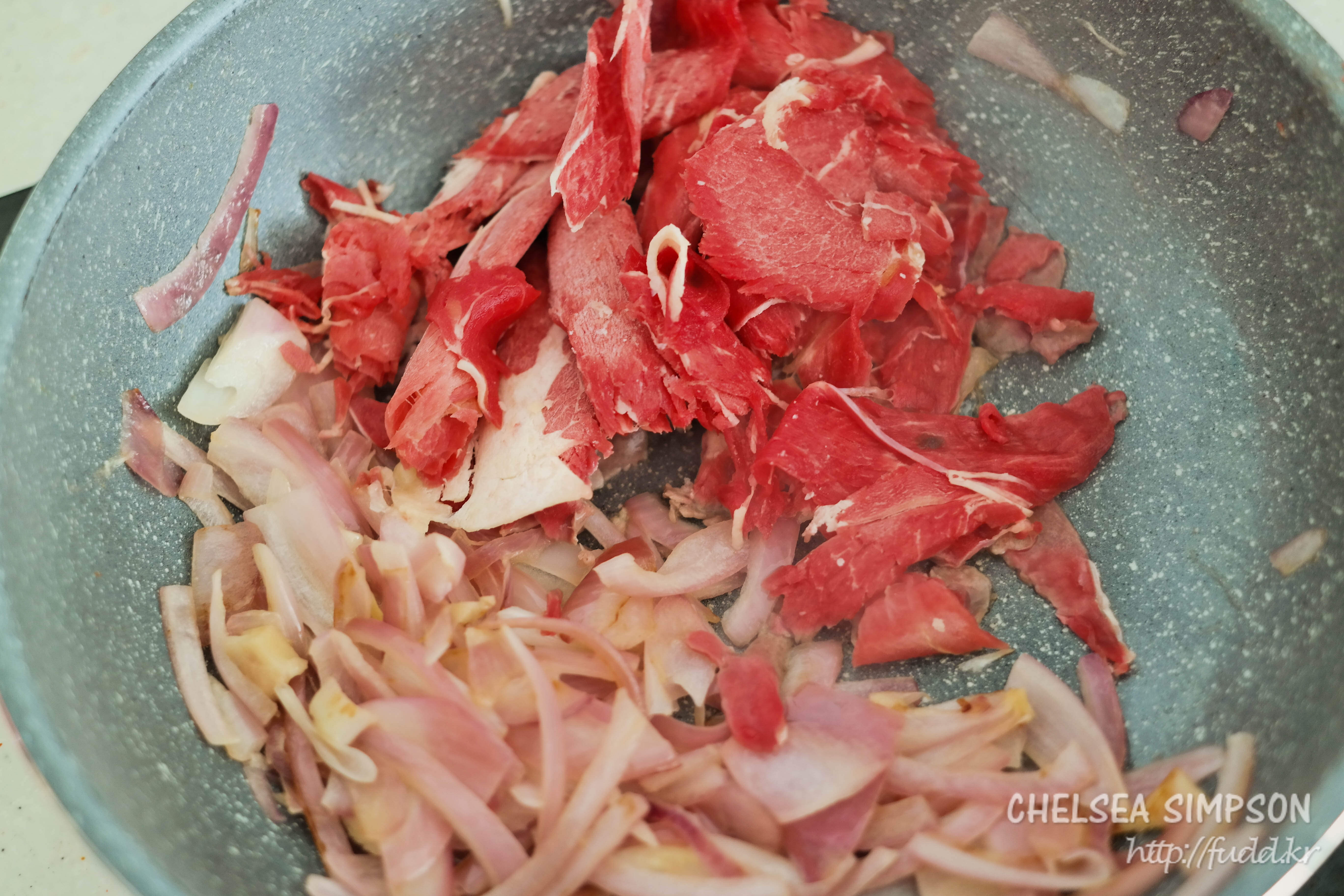 양파가 캐러멜라이즈되면 소고기를 넣어 5분 정도 더 볶아준다.