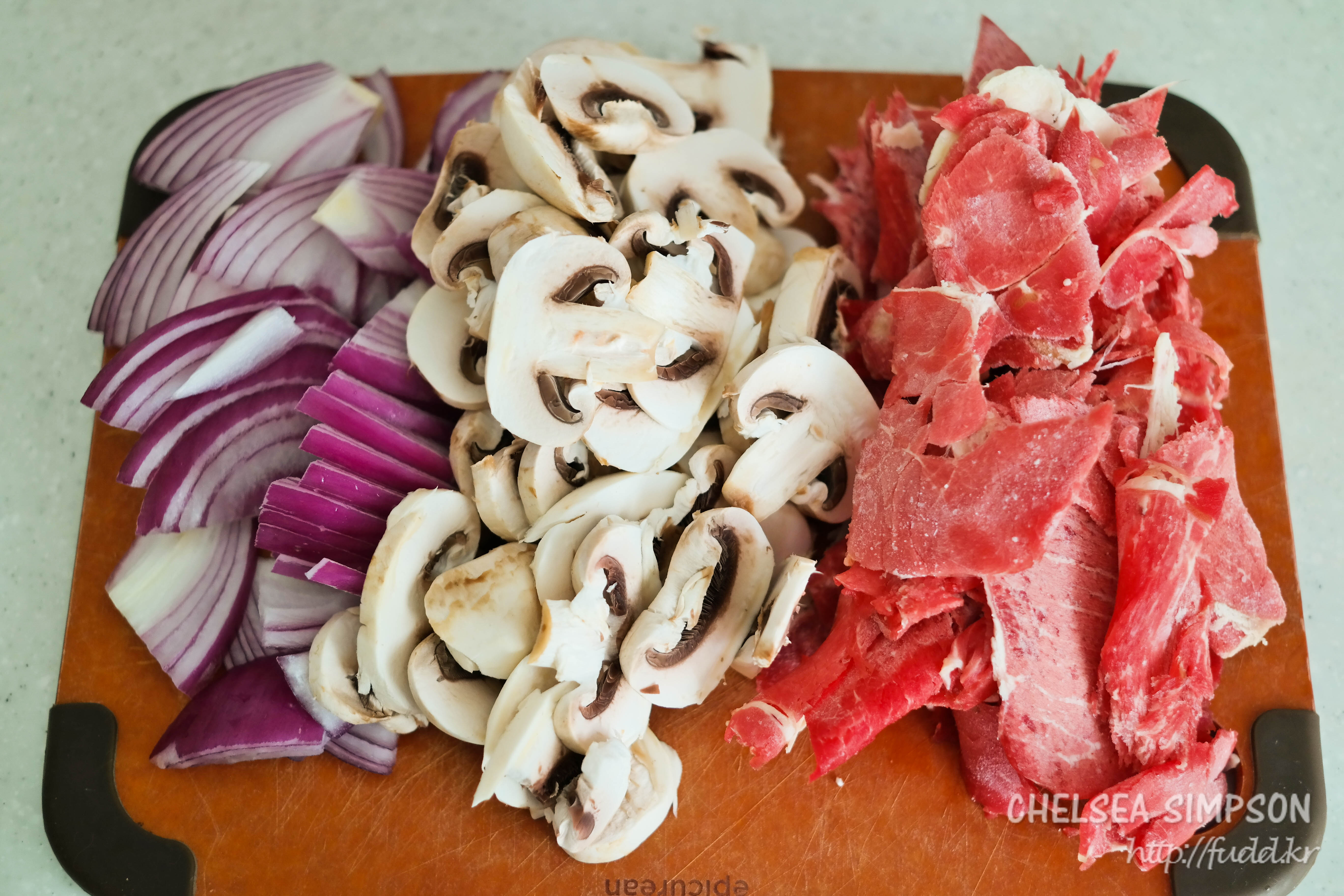 ①양파는 가늘게 채썰고, 양송이는 얇게 저미고, 소고기는 대충 찢어놓는다.