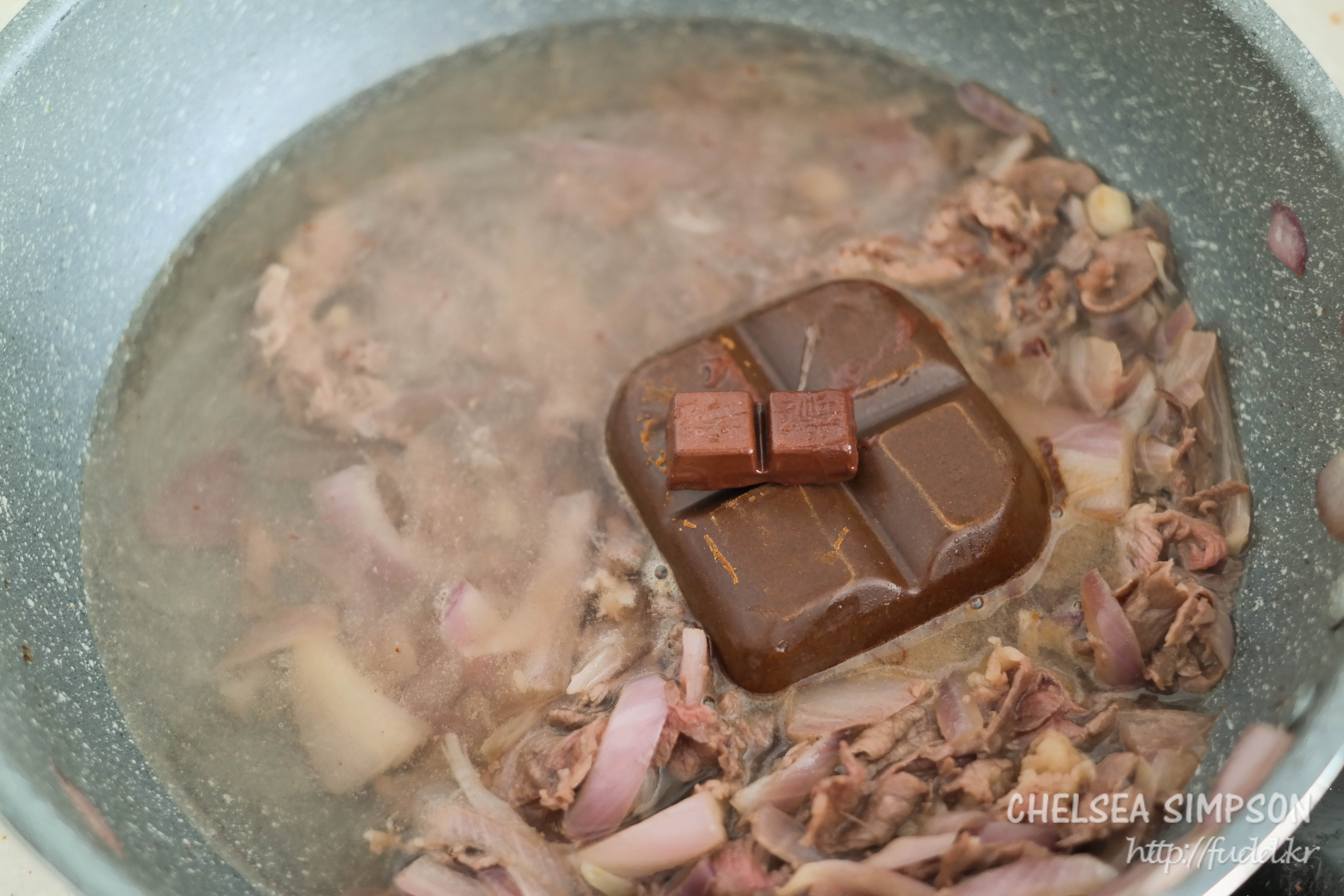 소고기가 익으면 불을 중간으로 줄이고 물과 고형 하이라이스, 다크 초콜릿을 넣어 잘 녹도록 섞는다.