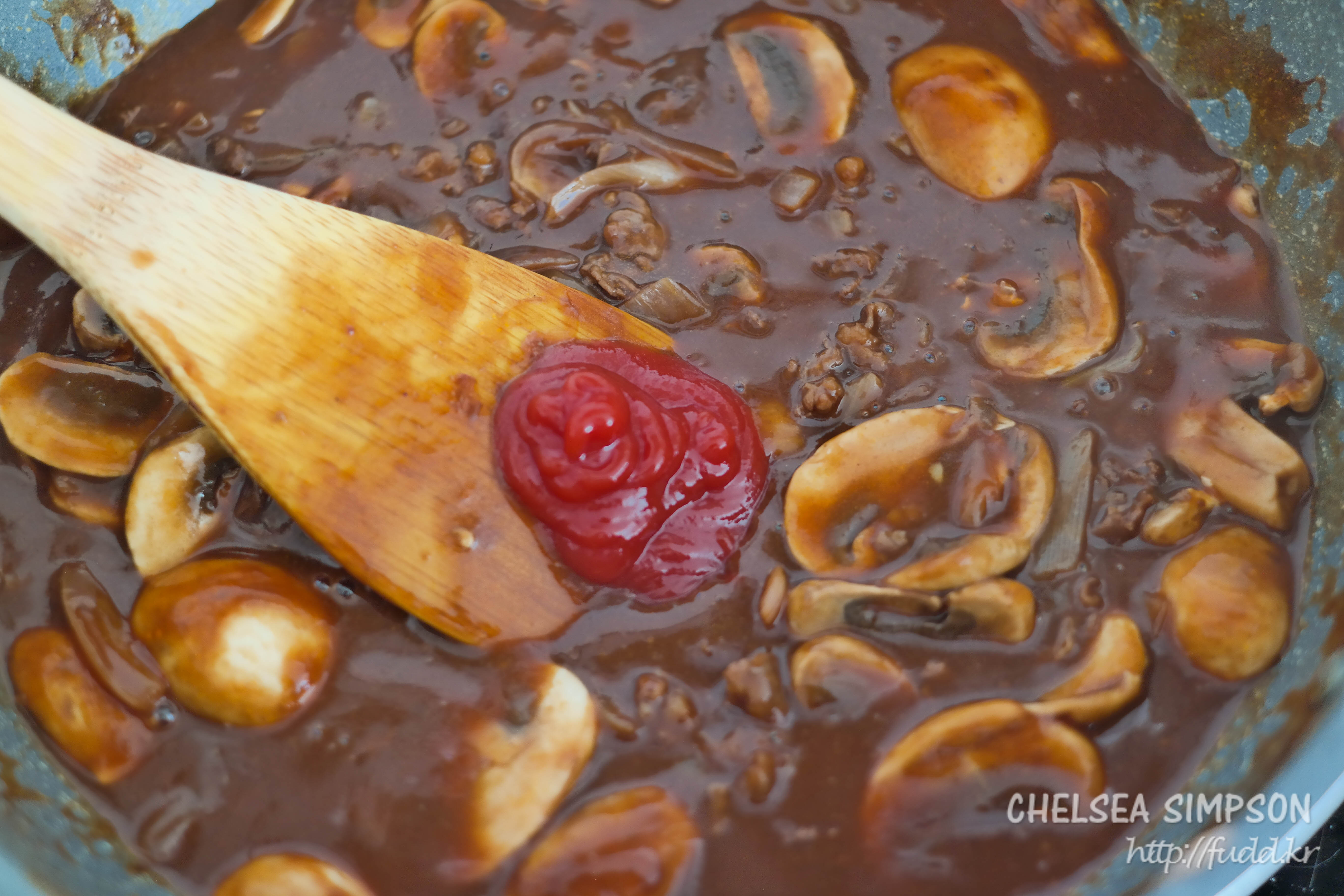 ⑤양송이를 넣고 1분 정도 뒤적거려 재료들끼리 고루 어우러지게 한 뒤, 케첩을 넣고 섞는다.