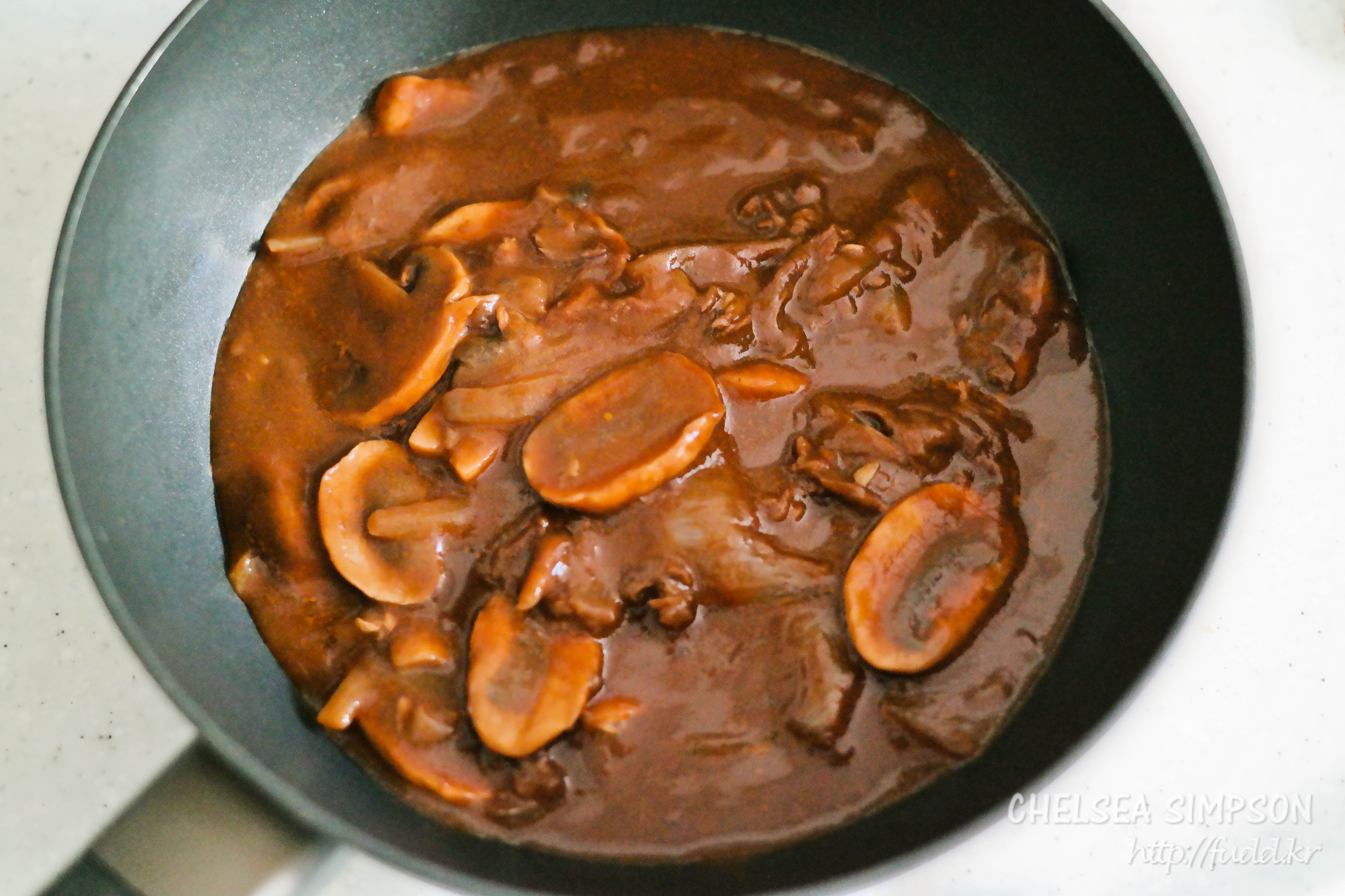 하이라이스와 초콜릿이 잘 녹아서 걸쭉해지면 저민 양송이를 넣는다.