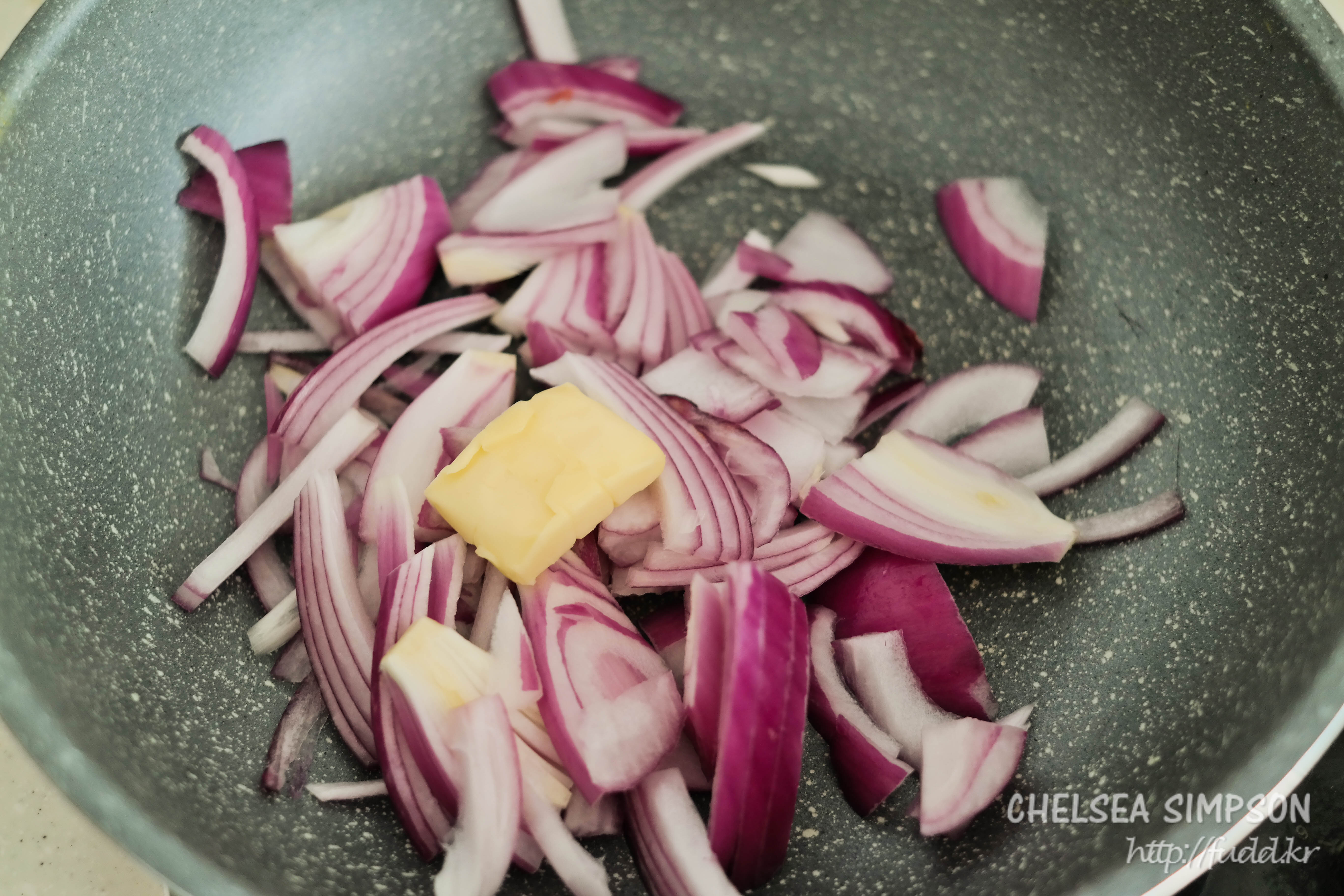 팬을 센불로 달군 뒤 버터와 채썬 양파를 넣어 볶는다.