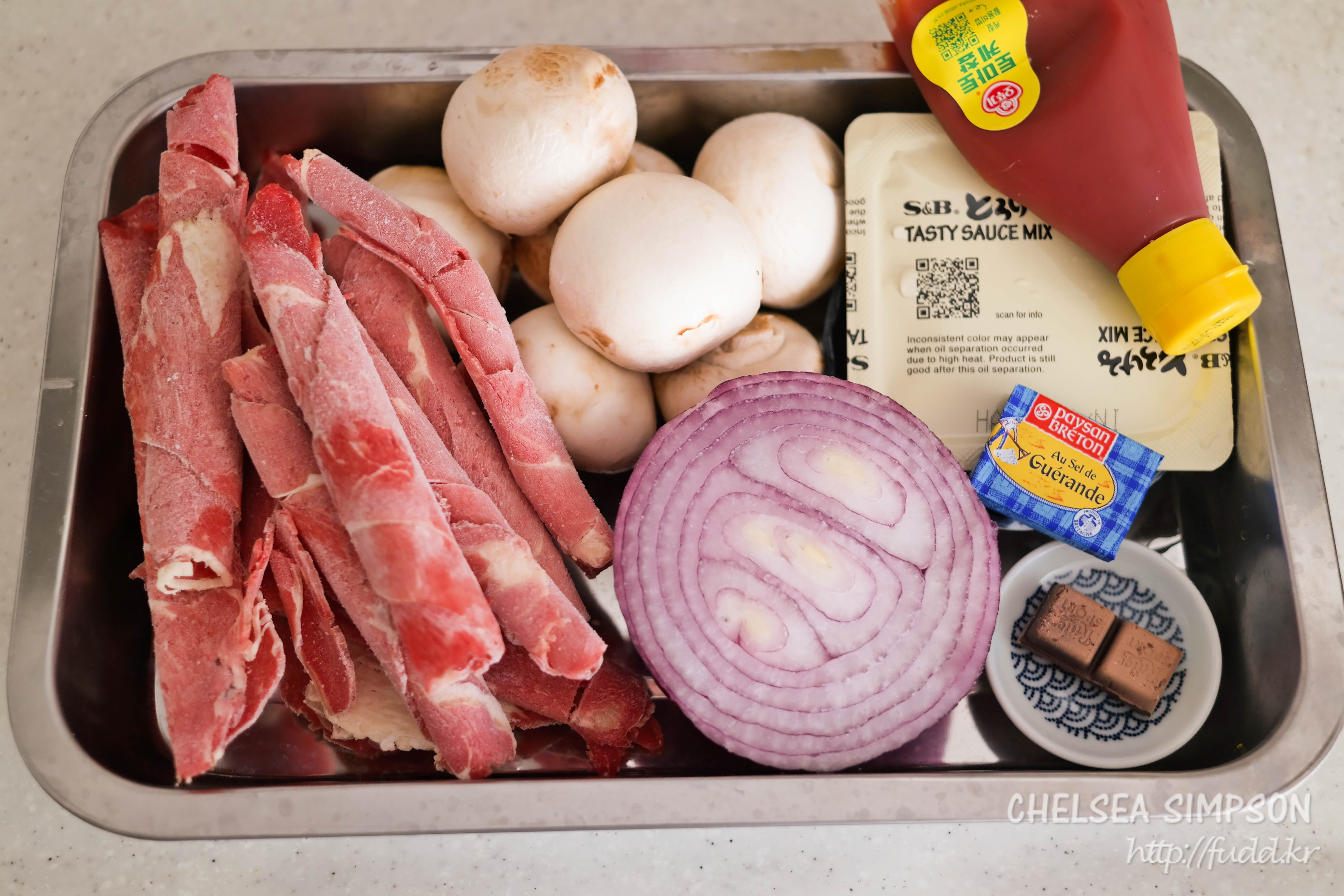 버터 10g, 양파 1/2개(150g), 샤브샤브용 소고기(150g), 양송이 7~8개(150g),