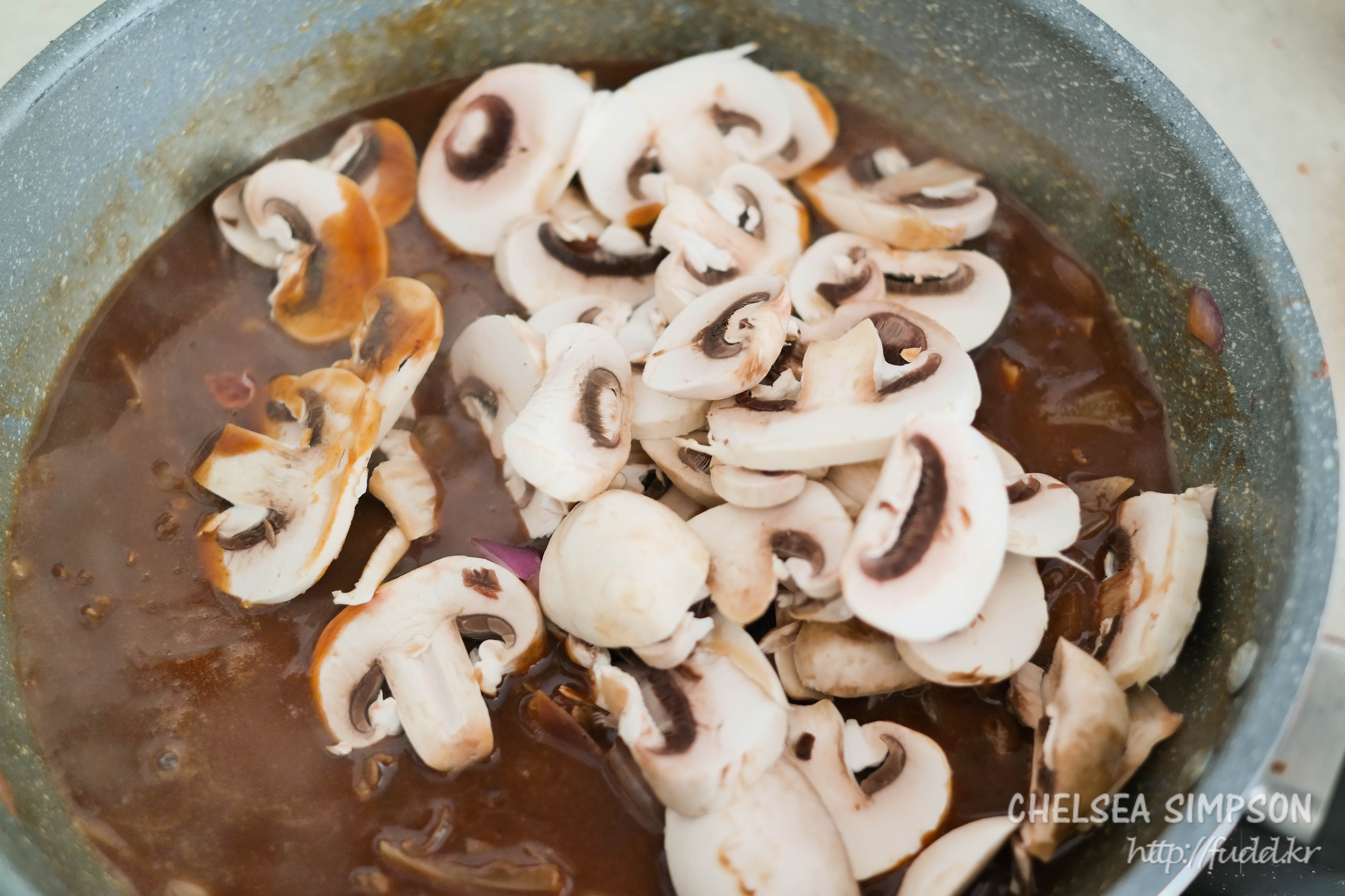 하이라이스와 초콜릿이 잘 녹아서 걸쭉해지면 저민 양송이를 넣는다.