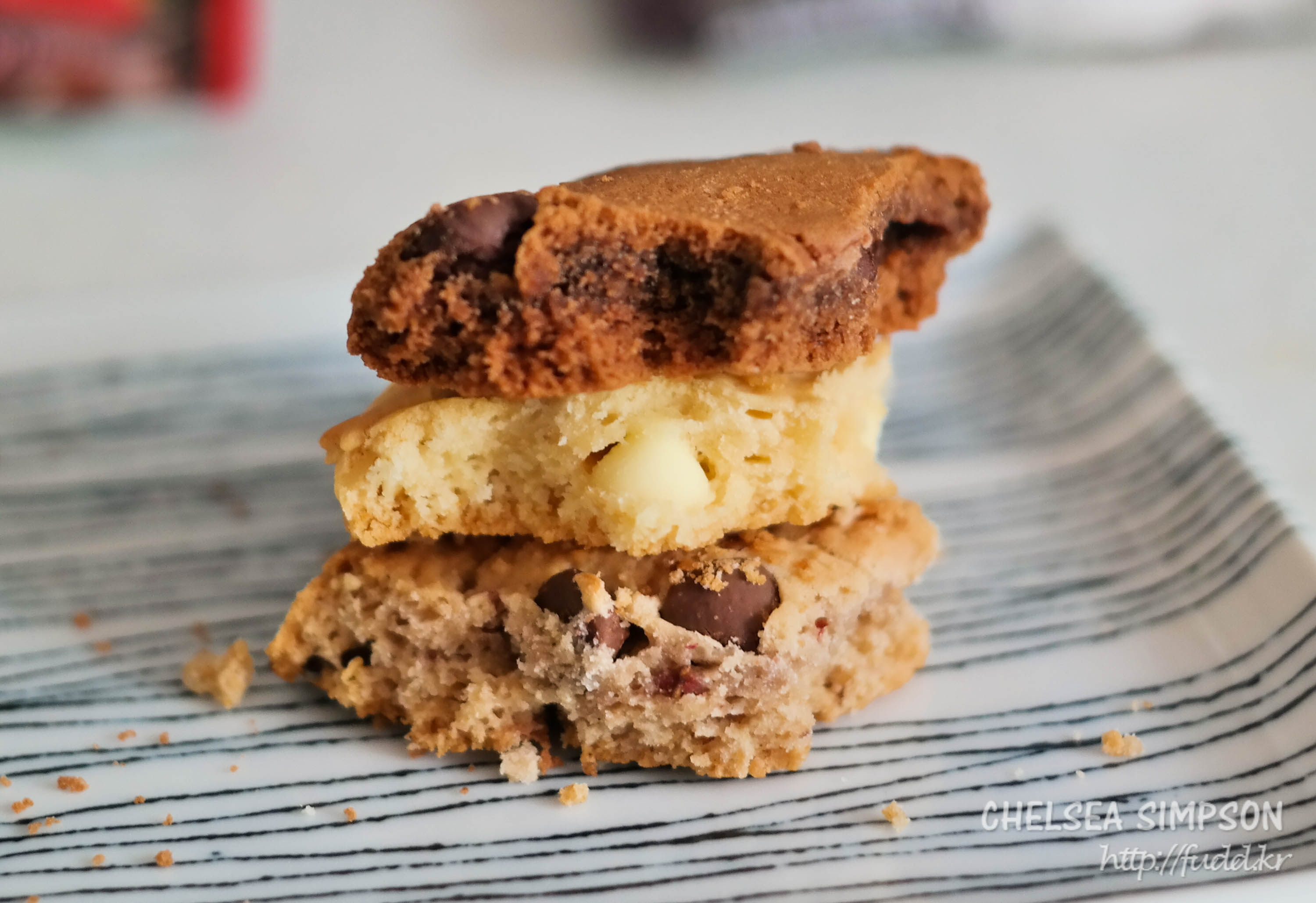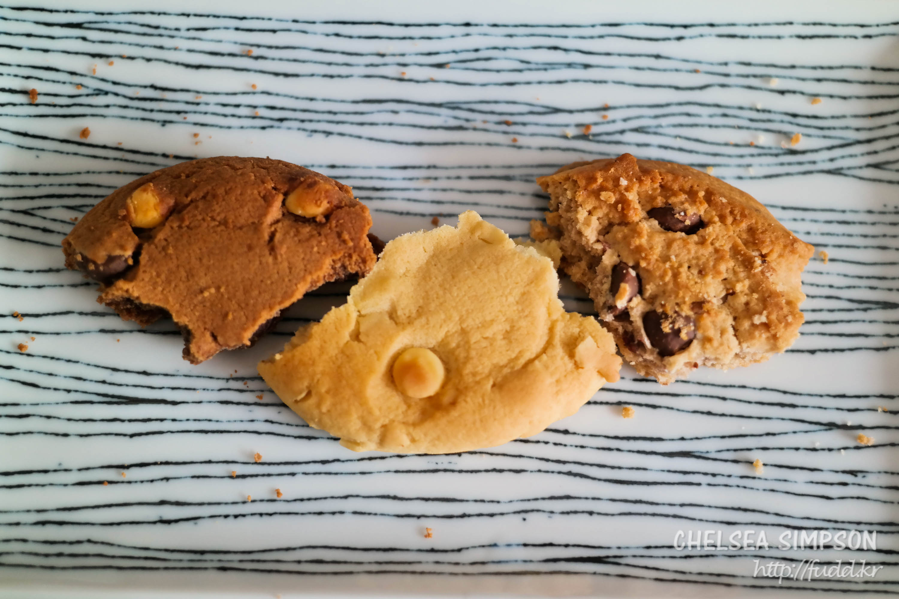 왼쪽부터 허쉬 다크앤화이트, 화이트칩위드아몬드, 초콜릿칩 베리 쿠키.