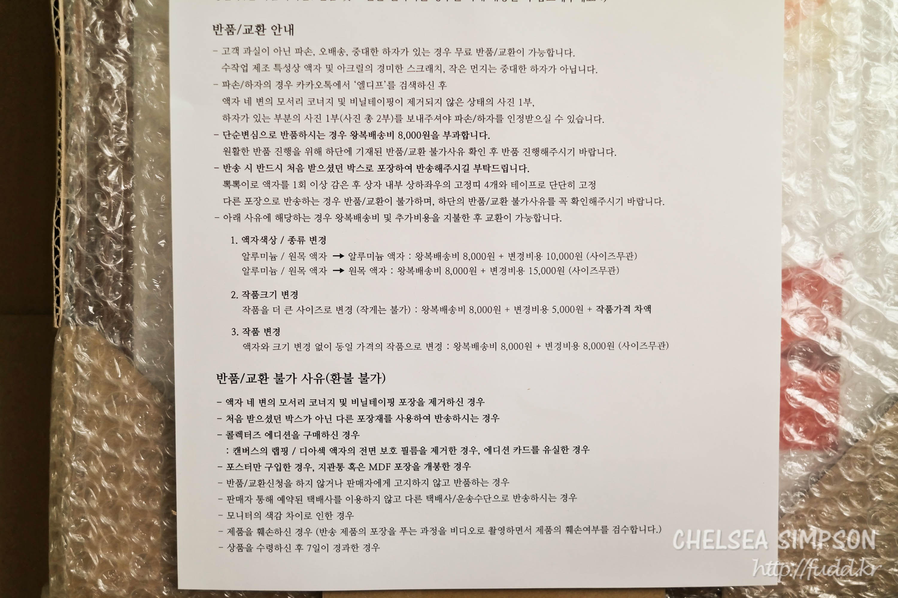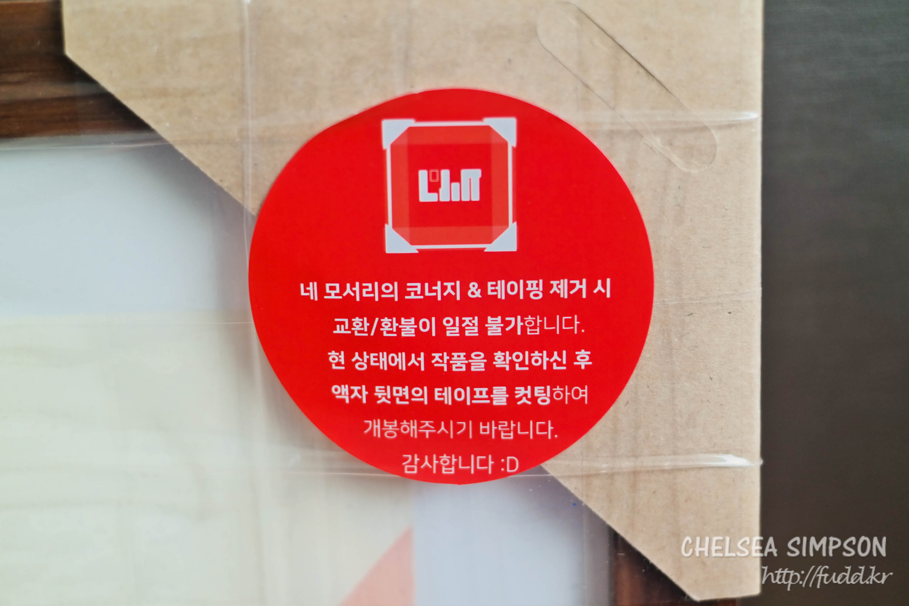 코너지와 테이핑을 제거하면 교환/환불이 불가하기 때문에 꼭 이 상태에서 그림에 하자가 없는지 확인해야 한다.