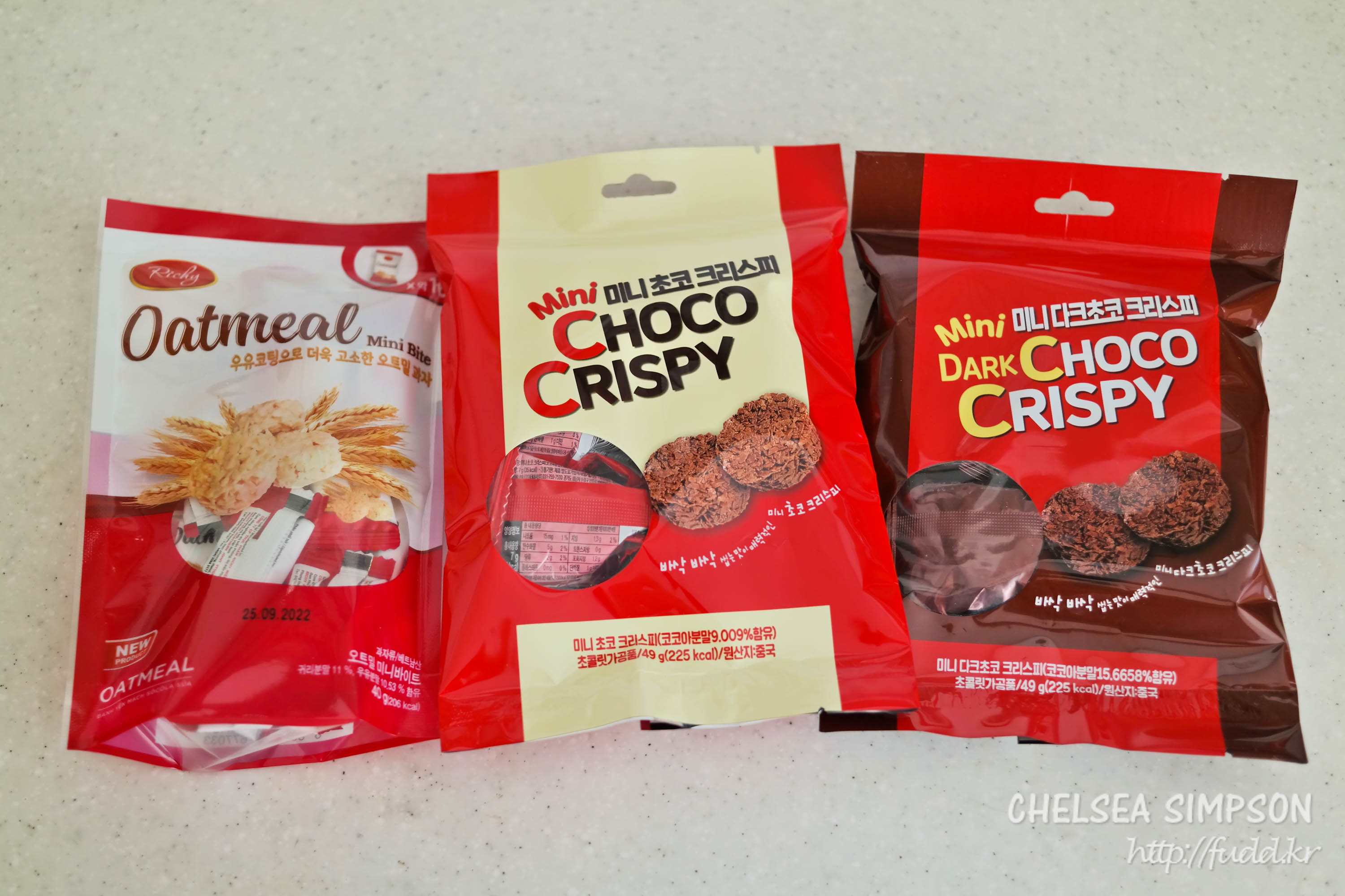 왼쪽부터 오트밀 미니바이트(17개), 니코 미니 초코 크리스피(7개), 니코 미니 다크초코 크리스피(7개).