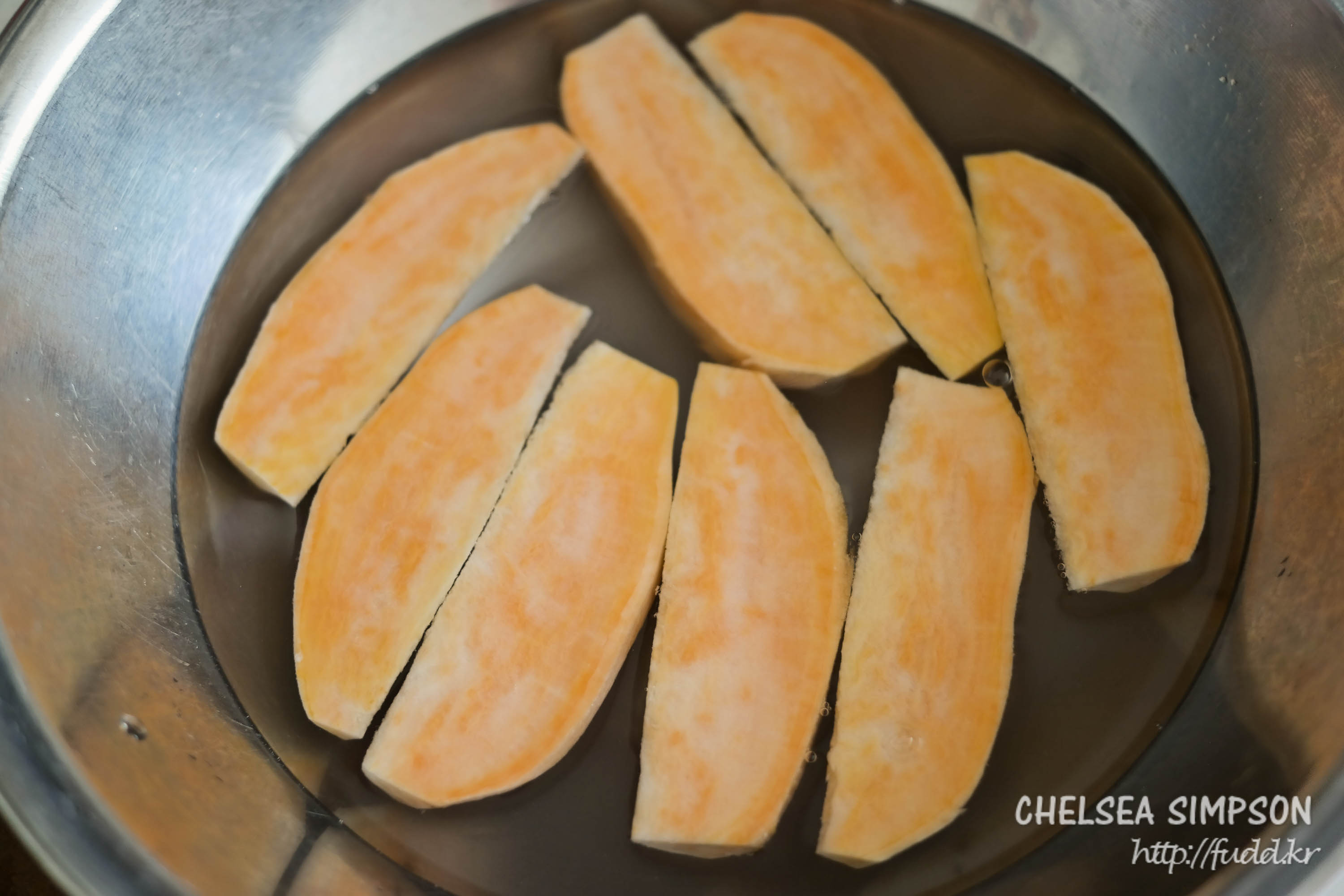 ①고구마 껍질을 깎아낸 뒤, 반달 모양으로 8등분해서 물에 10분 정도 담가둔다.