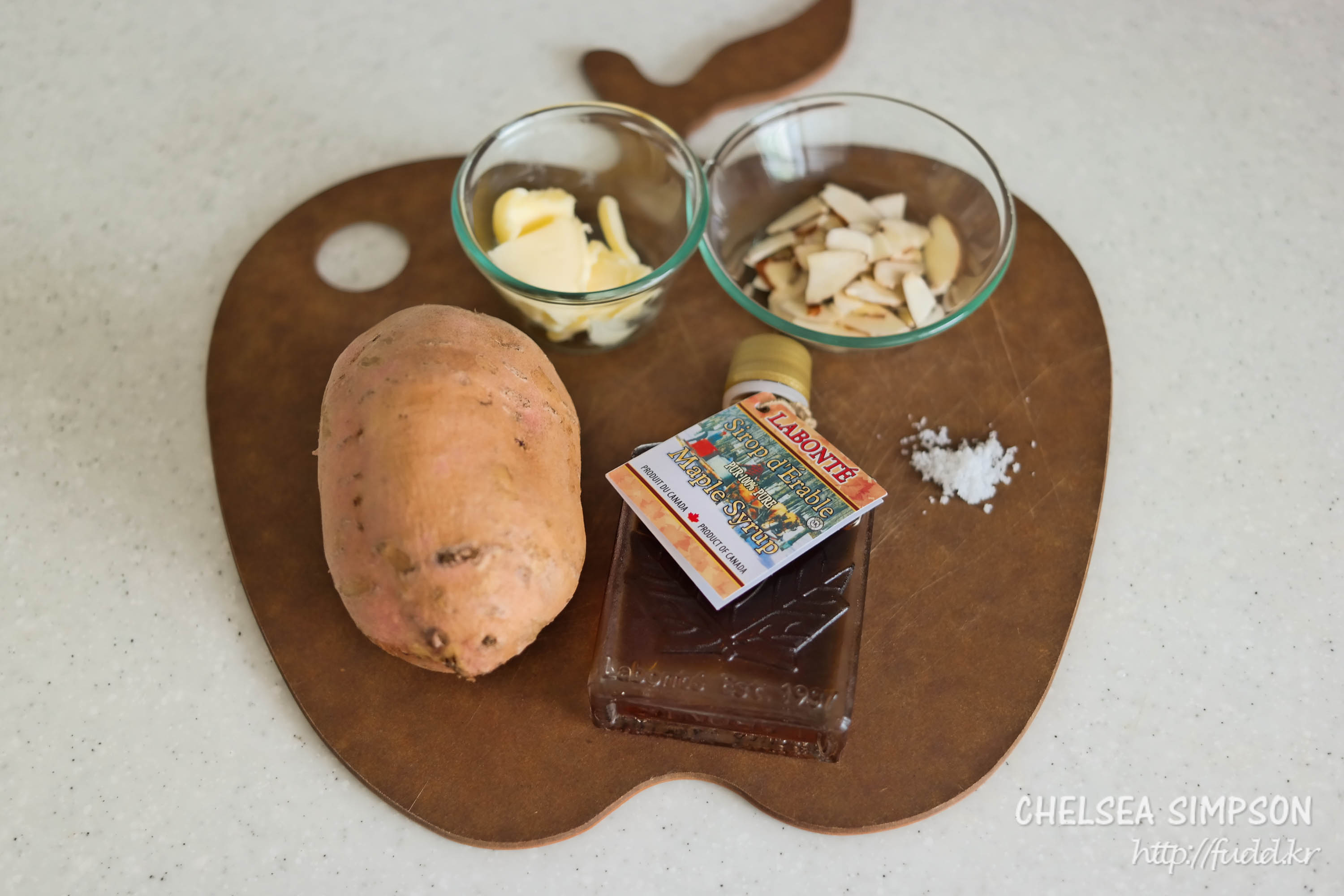 고구마 1개(200g), 메이플시럽 30~40g, 버터 10g, 소금 한 꼬집, 아몬드 슬라이스, 계피분말