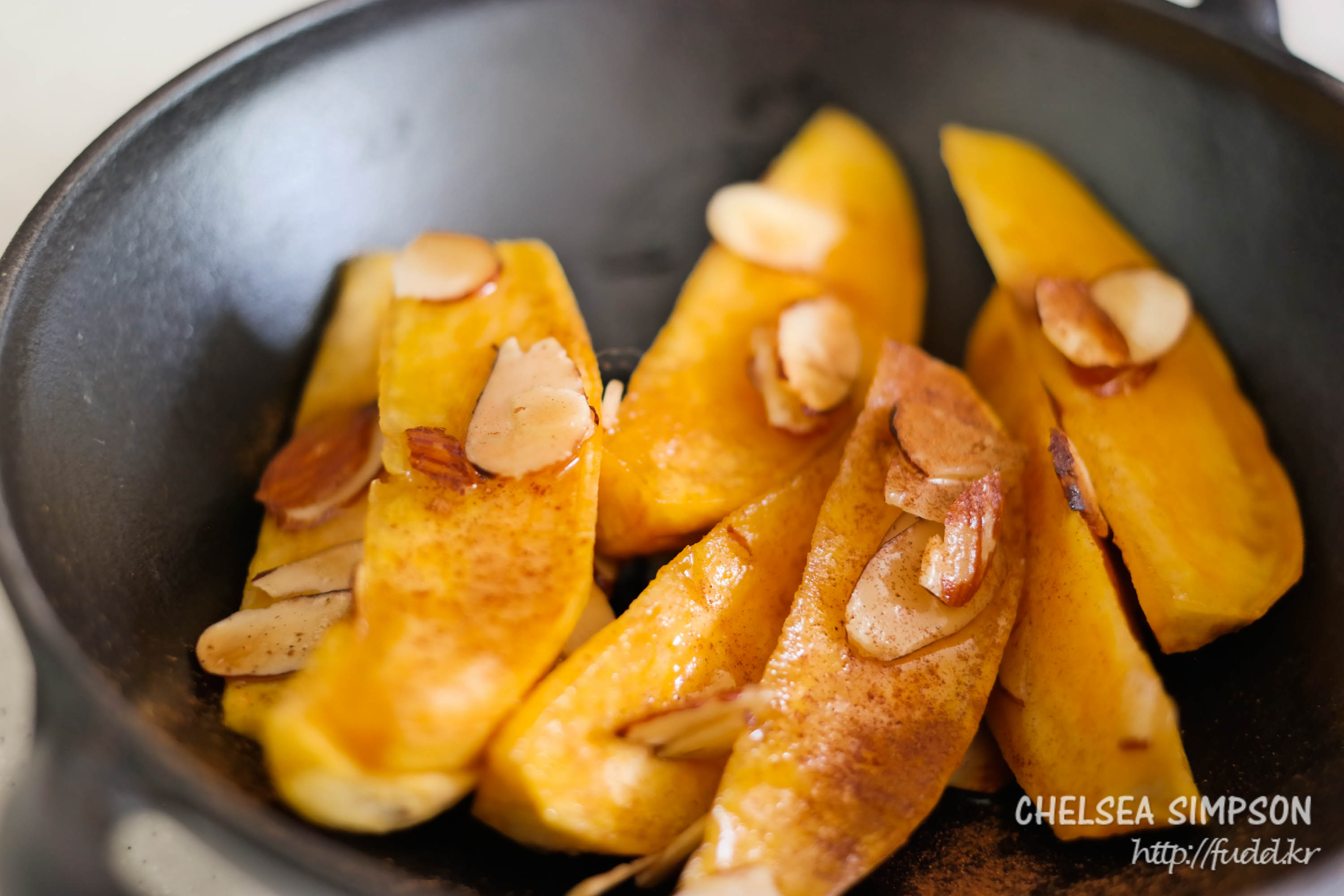 재료 단호박 1/2개, 메이플시럽 5T, 버터 1T, 소금 한두 꼬집, 아몬드 슬라이스 적당량