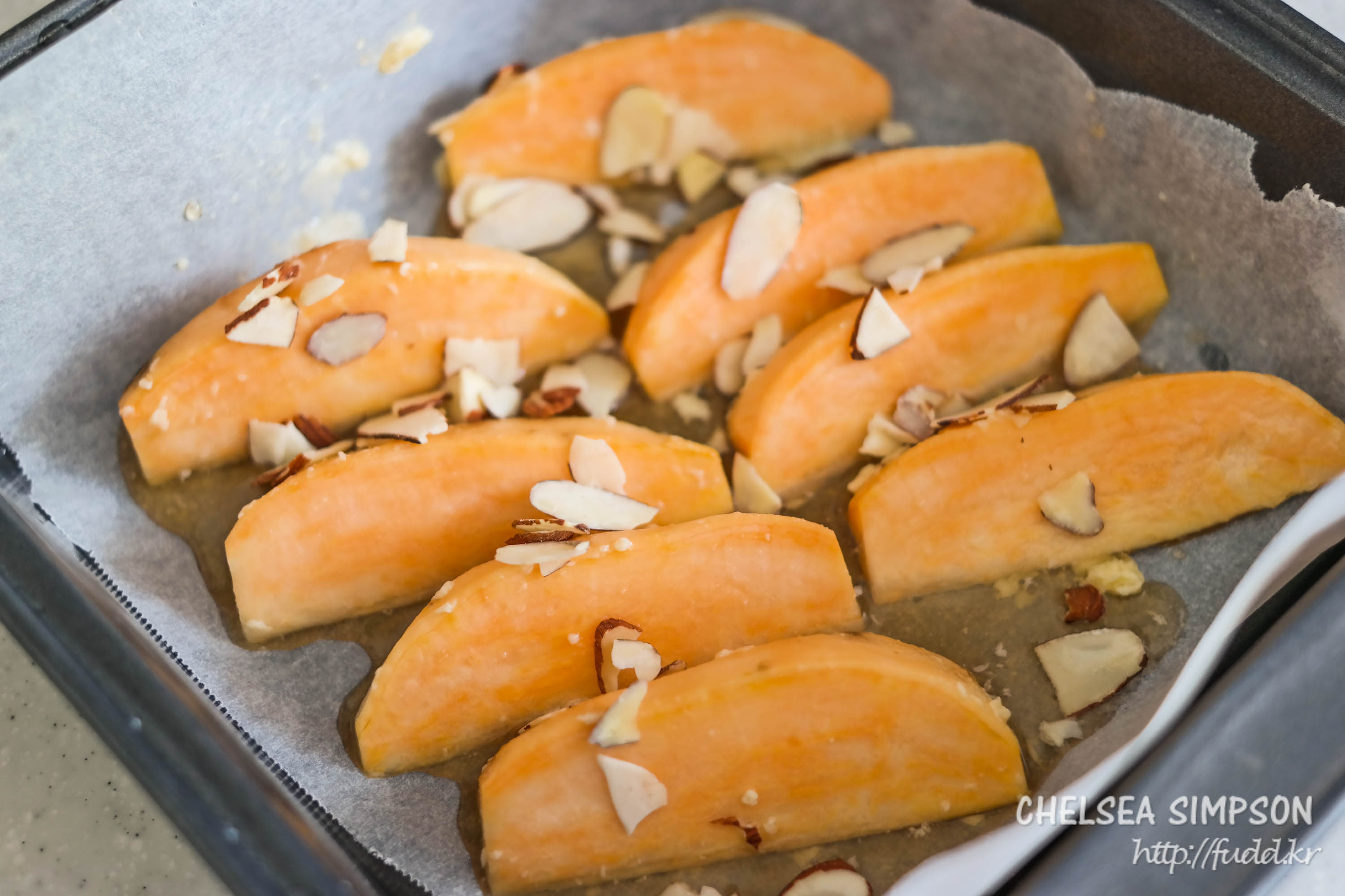 고구마 위에 슬라이스 아몬드를 뿌린 뒤 예열한 오븐에서 180℃-20~25분 정도 구워준다.