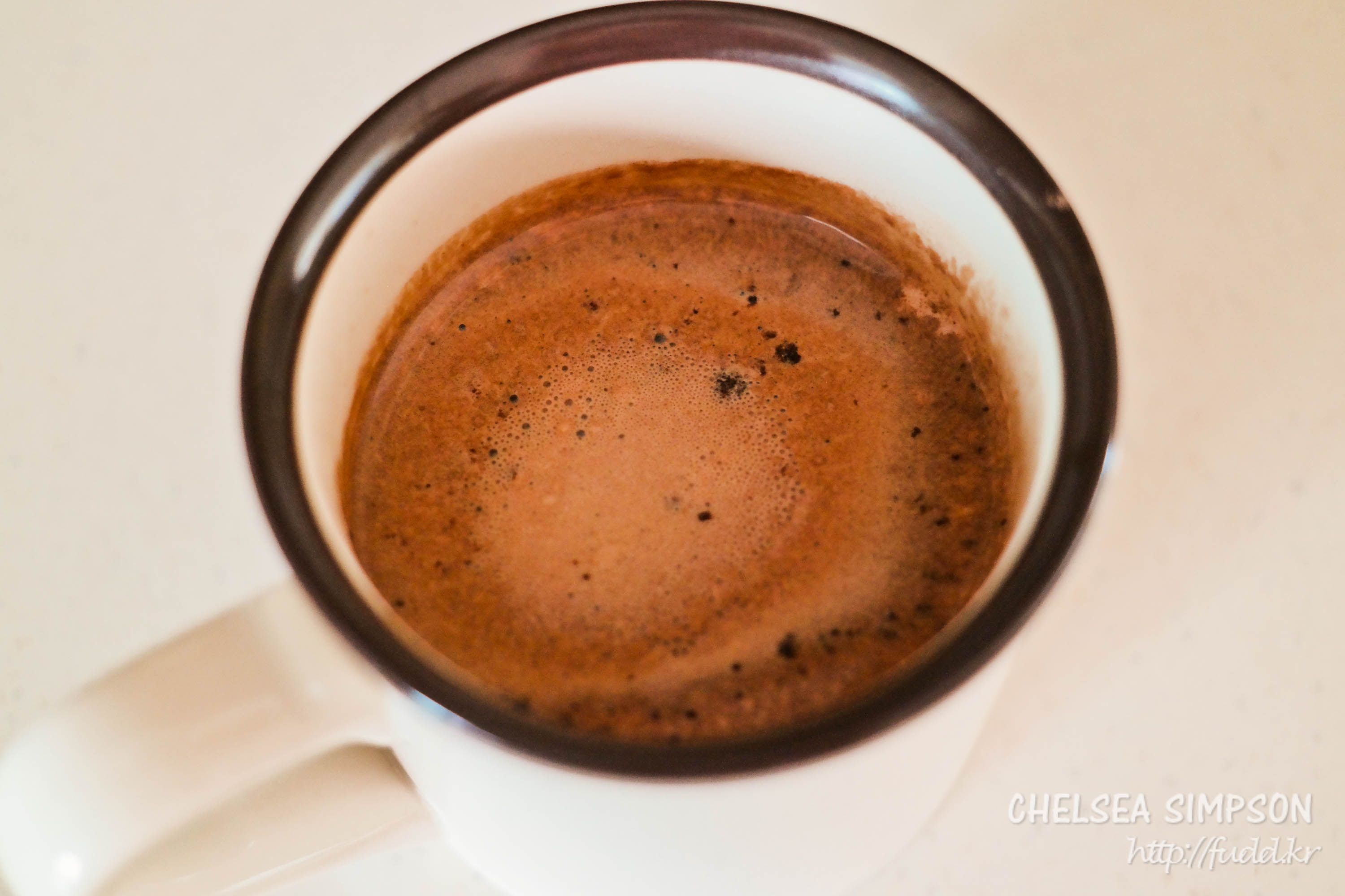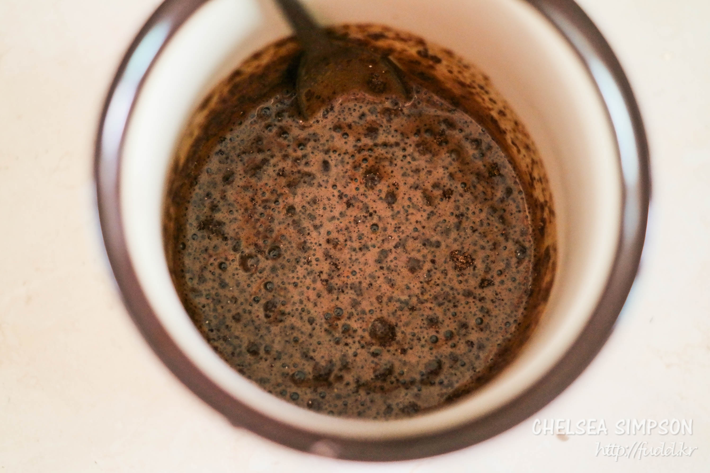 뜨거운 물 대신 에스프레소 한 샷 뽑아서 내린 다음에 마구 저었다.