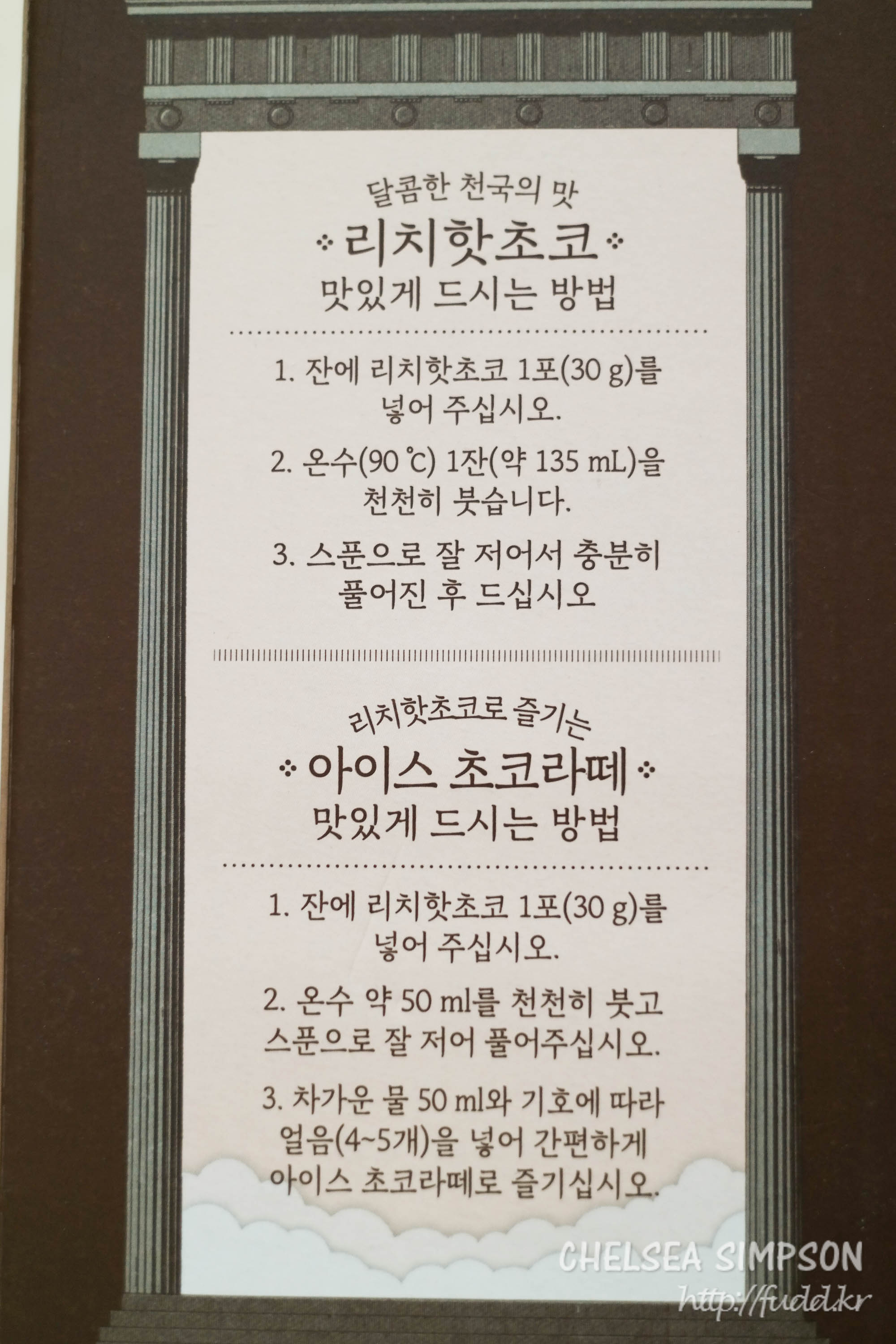 내가 구입한 리치핫초코는 초콜릿분말과 초콜릿칩을 더해 진하고 달콤한 맛을 즐길 수 있다고 한다.