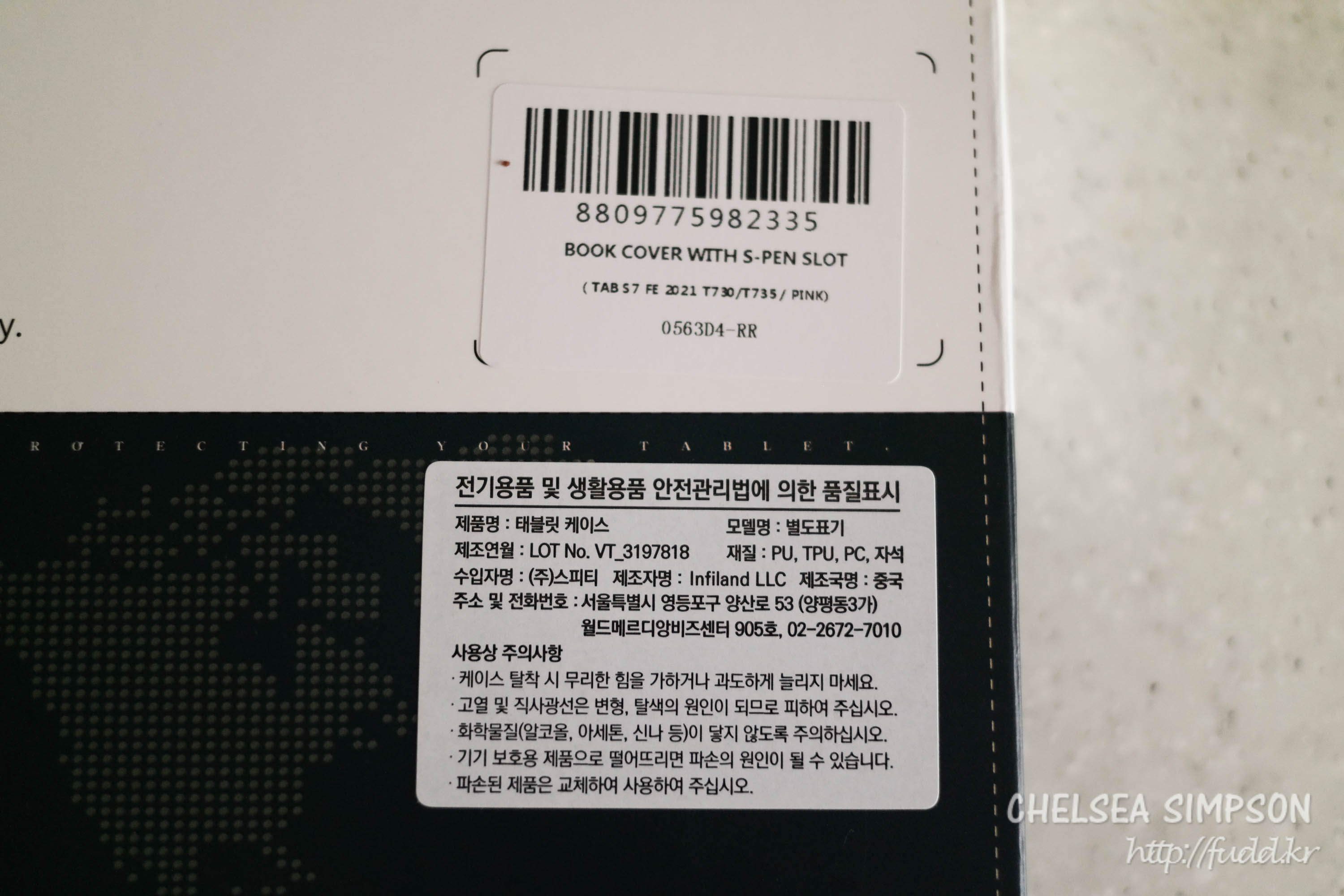 제조국은 중국이고, 고열, 직사광선, 화학물질(알코올, 아세톤, 신나 등)이 닿으면 변형·탈색될 수 있으니 주의해야 한다.