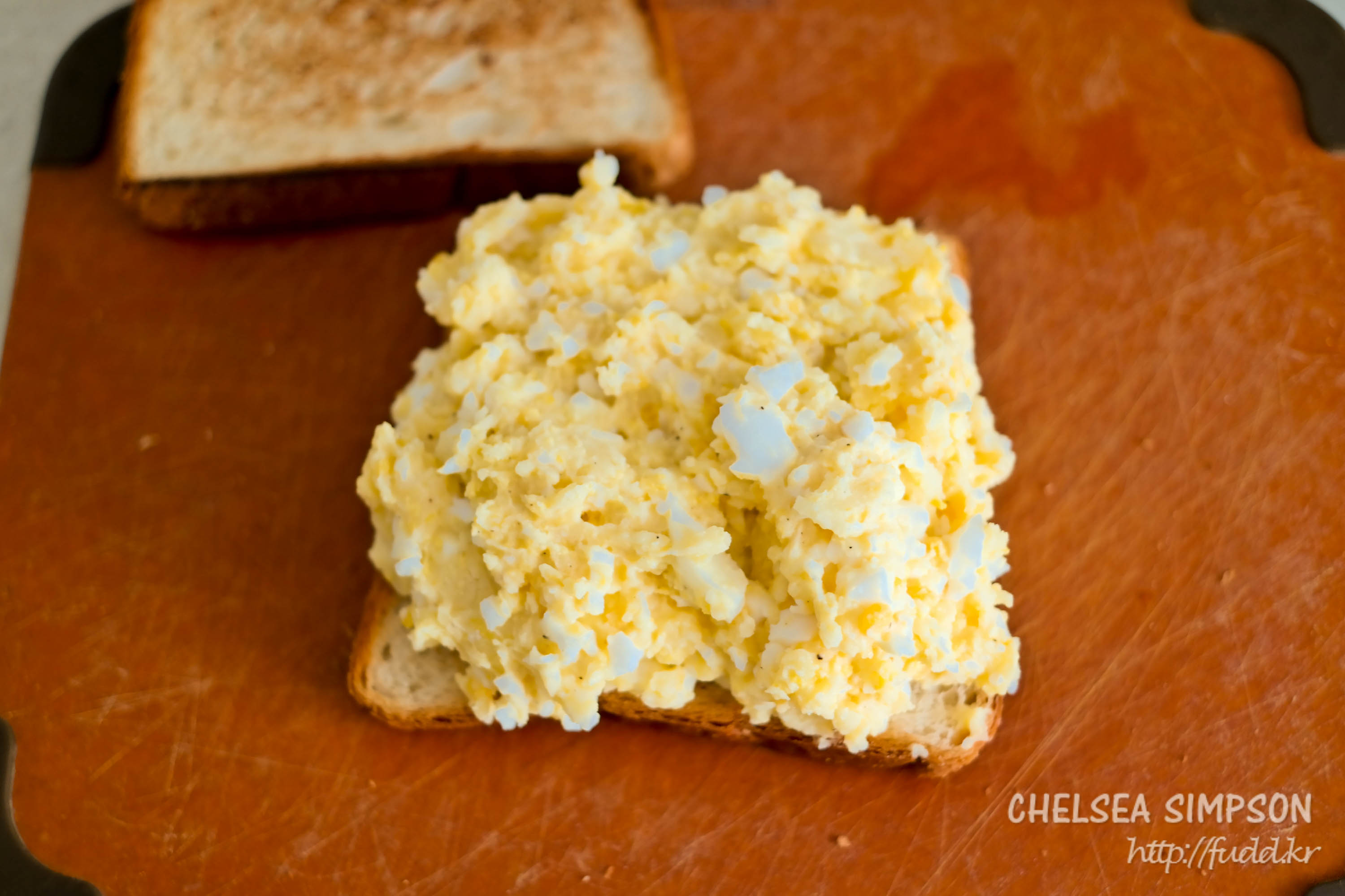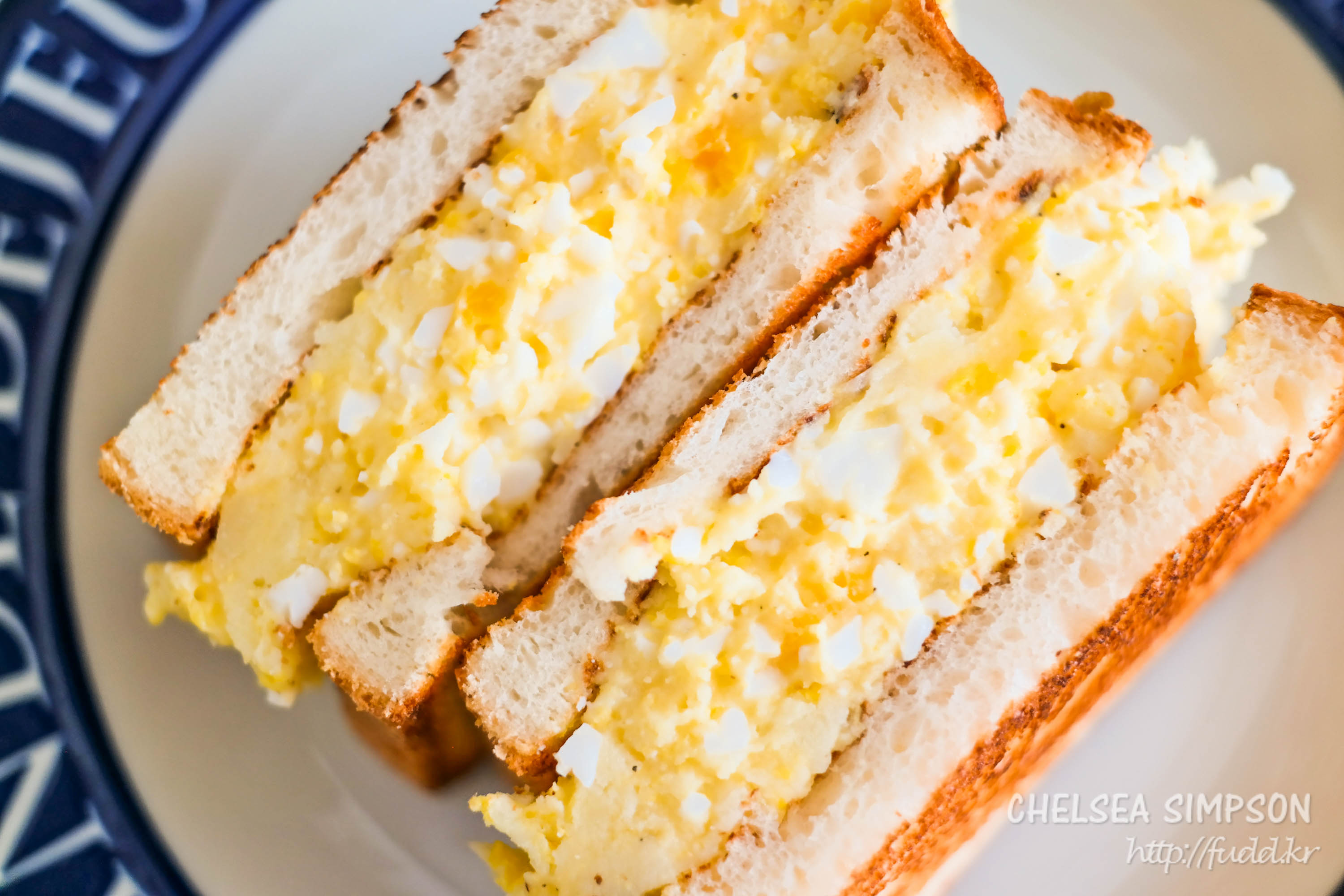 ⑤구운 빵 한 쪽에 으깬 달걀과 감자를 듬뿍 얹고 나머지 빵을 덮어 마무리한다.