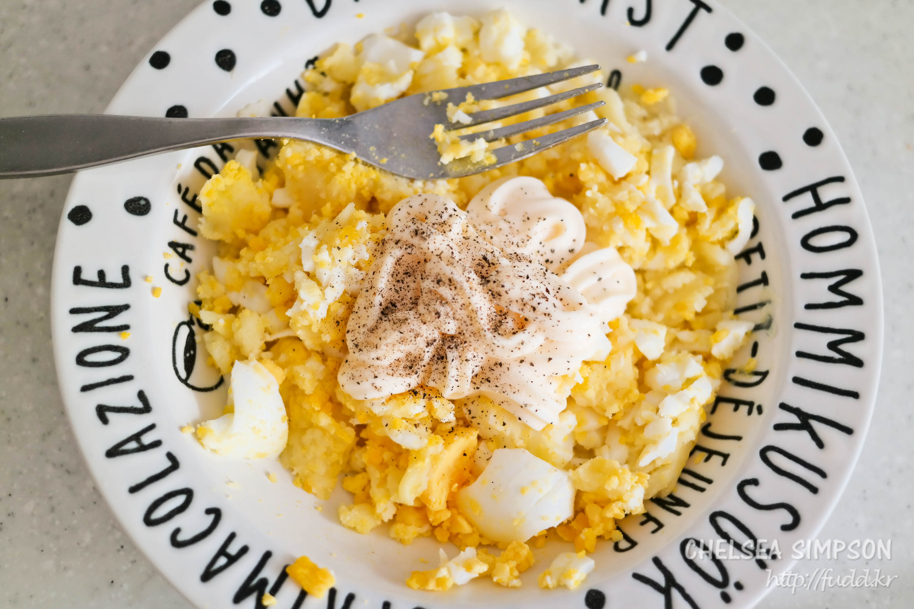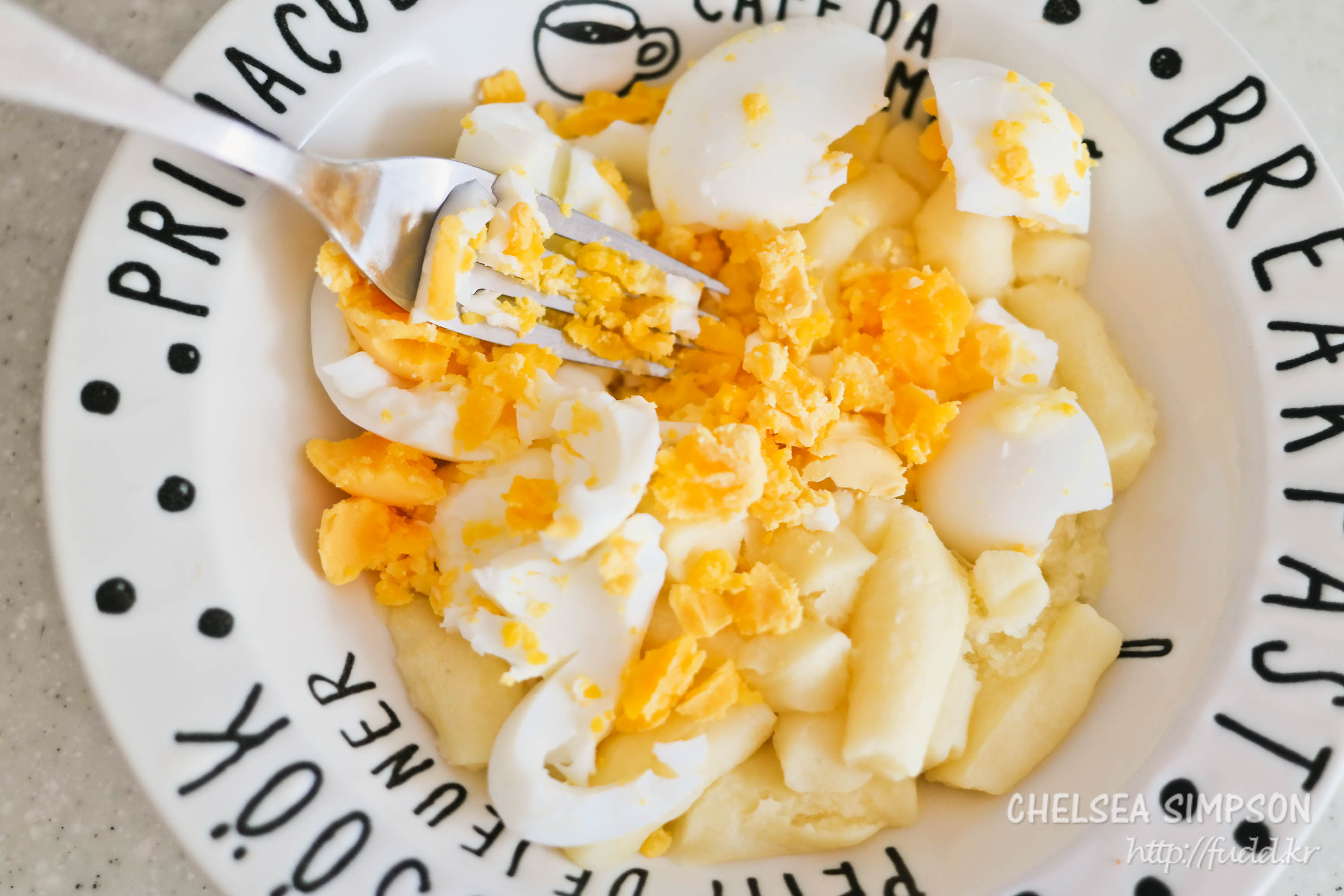 ③삶은 달걀과 매쉬드 포테이토를 포크 등으로 눌러 으깨며 섞는다.