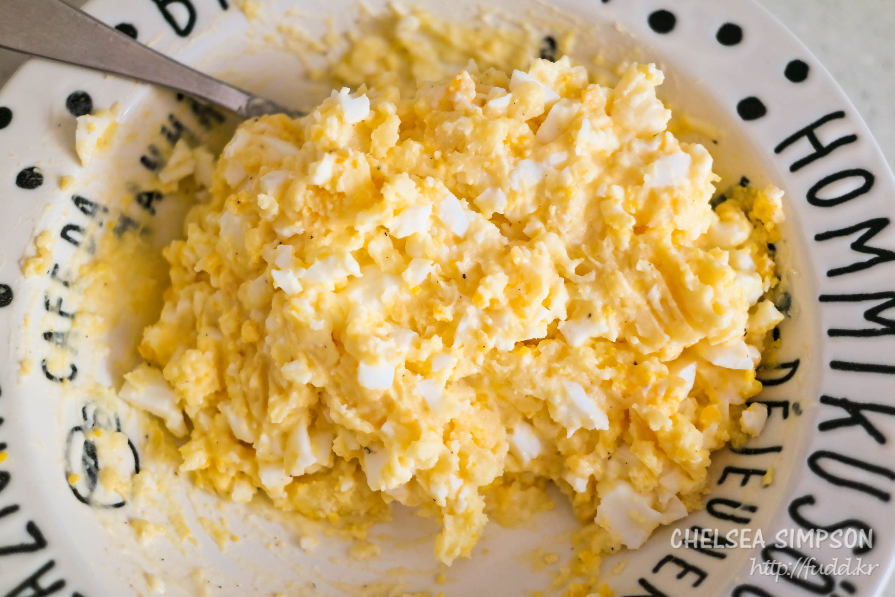 ③삶은 달걀과 매쉬드 포테이토를 포크 등으로 눌러 으깨며 섞는다.