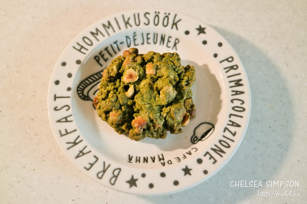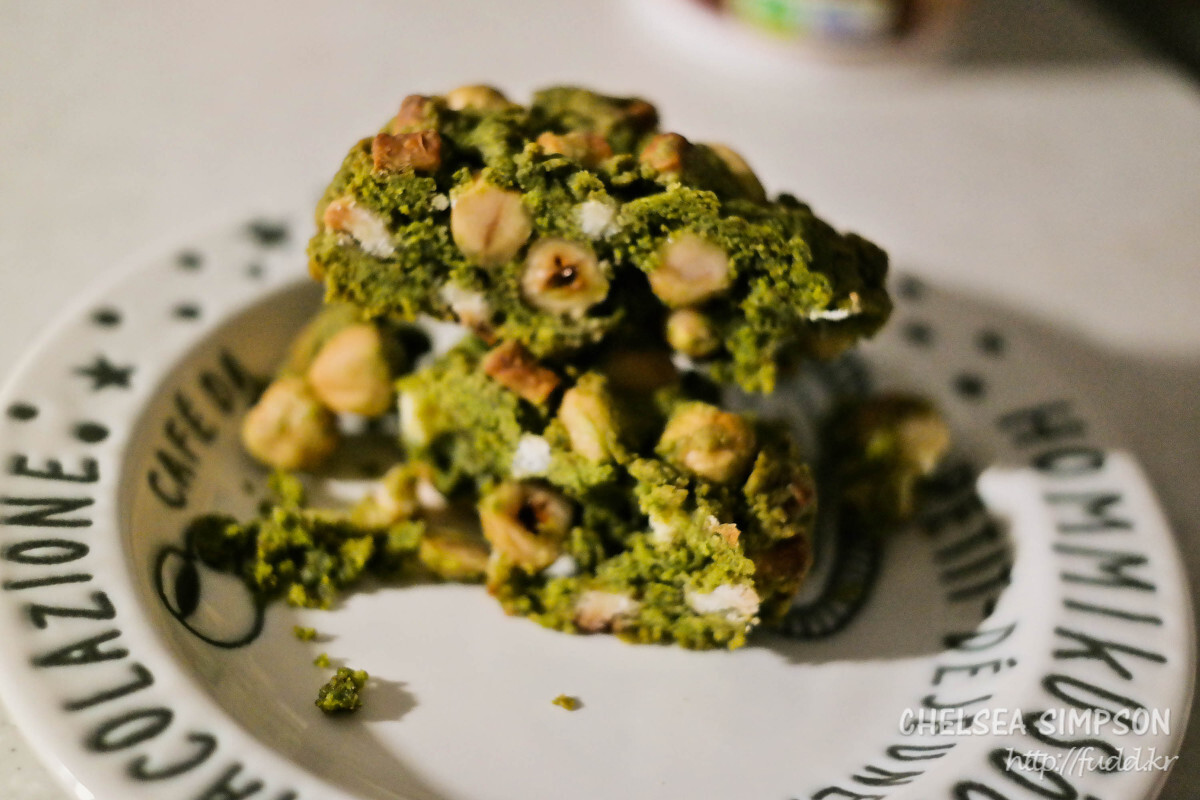 그린티 헤이즐넛 쿠키 헤이즐넛 가득, 화이트초콜릿은 적당히 들어있어서 헤이즐넛이 꽈둑꽈둑 씹히는 맛이 좋다.