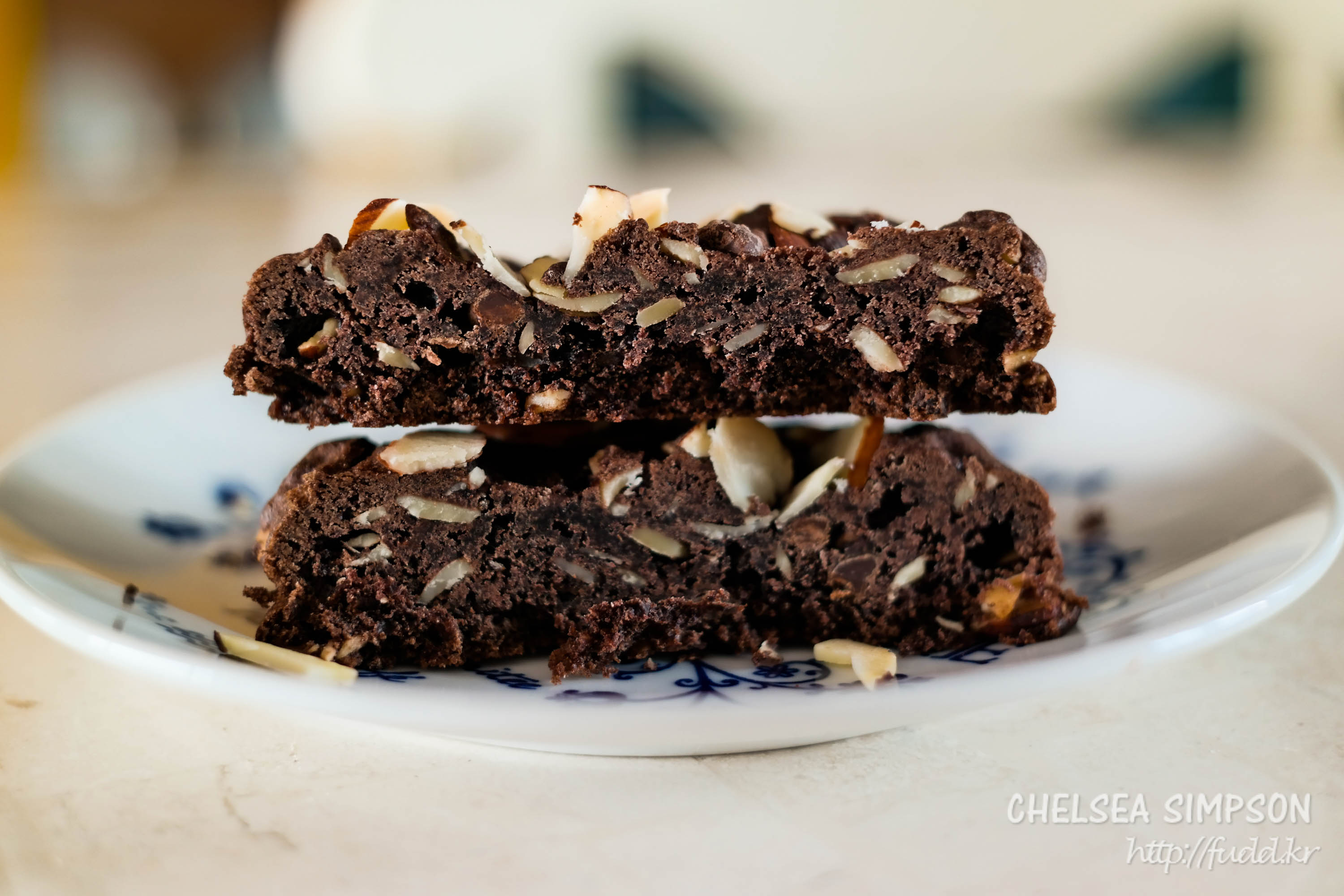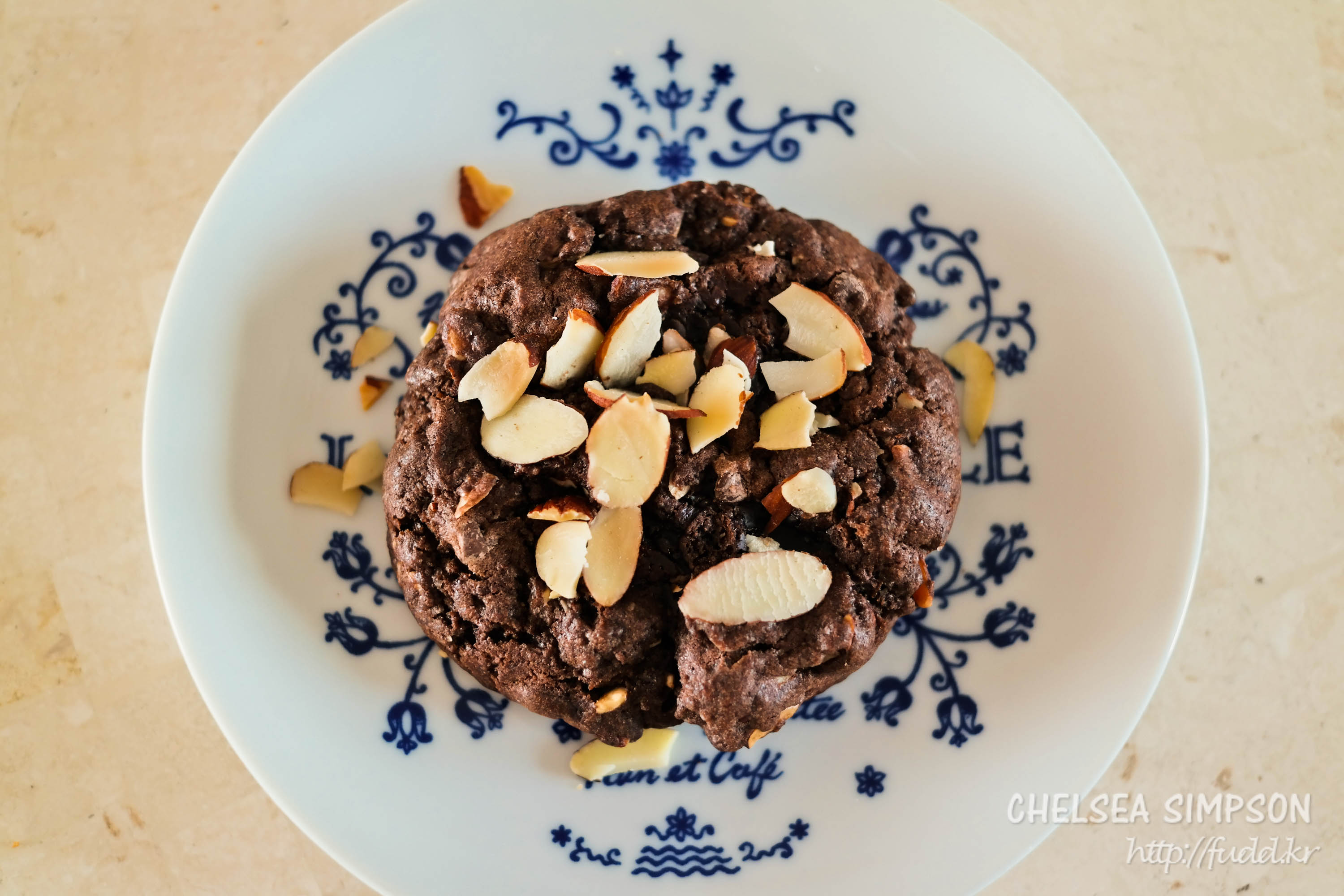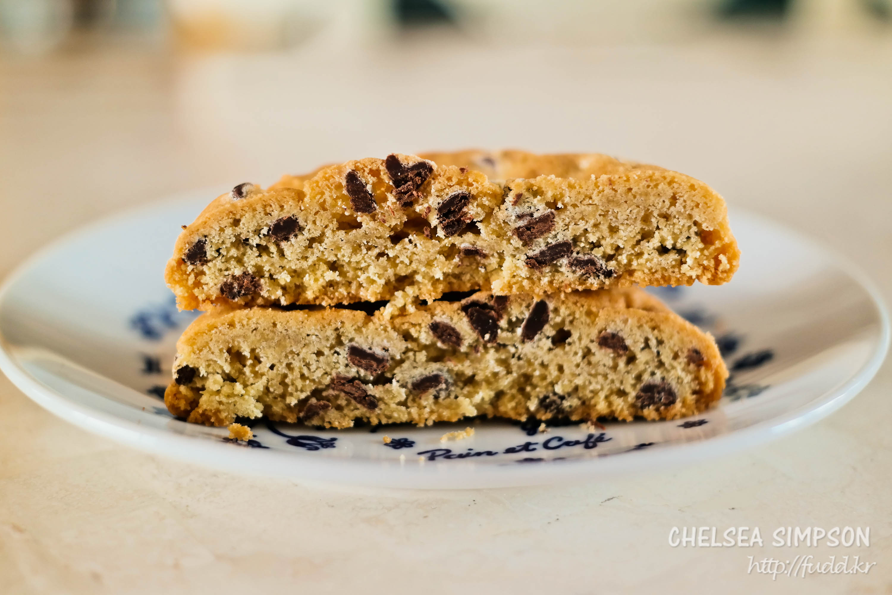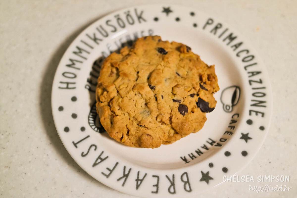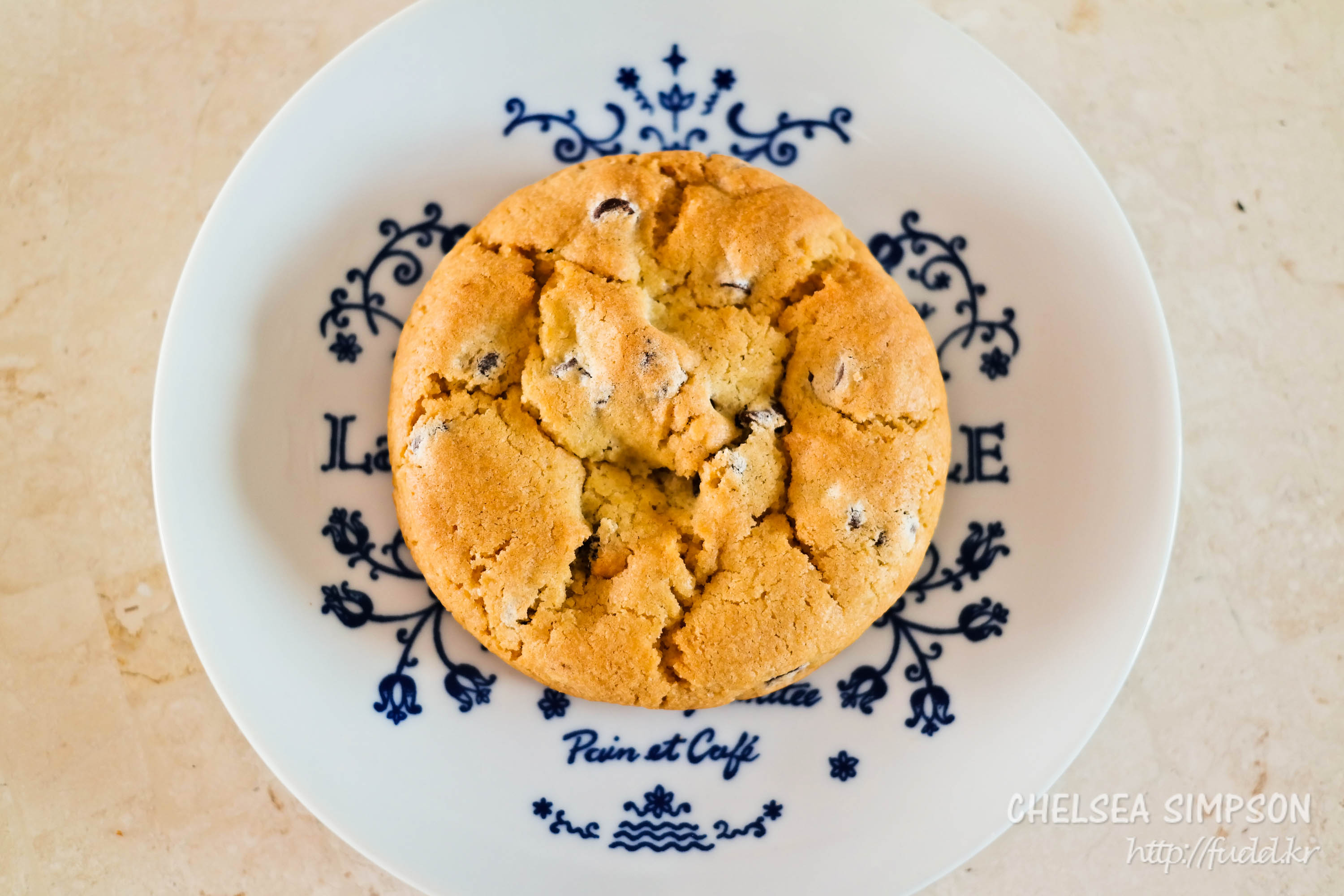 씹을 때 약간 가볍게 바스라지는 질감이고 쿠키 반죽 자체의 단맛이 적당하니 초콜릿 풍미가 더욱 돋보인다.