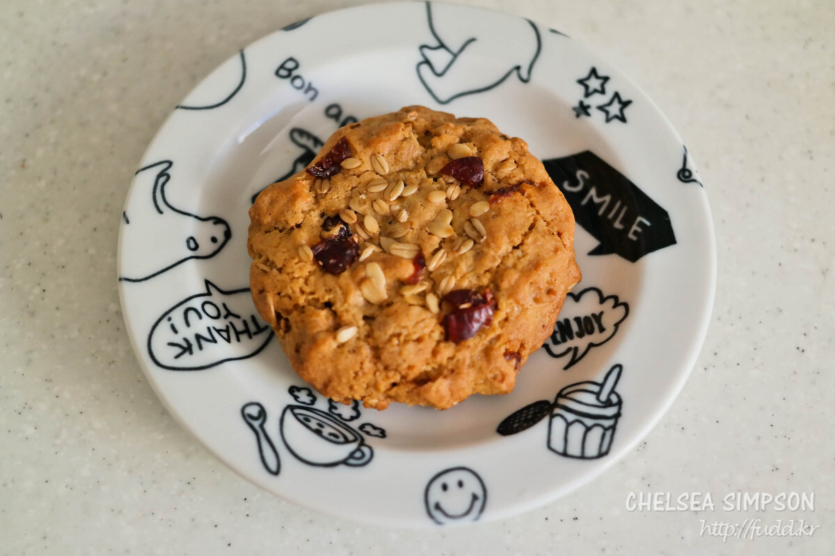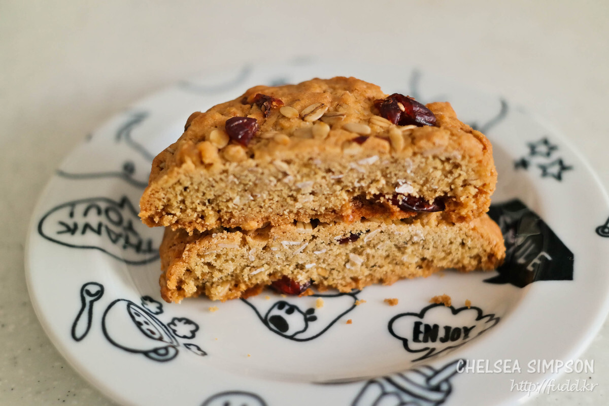 크랜베리 오트 쿠키 아주 연한 계피향과 함께 고소한 오트밀, 새콤달콤한 크랜베리가 씹히는 게 별미이다.