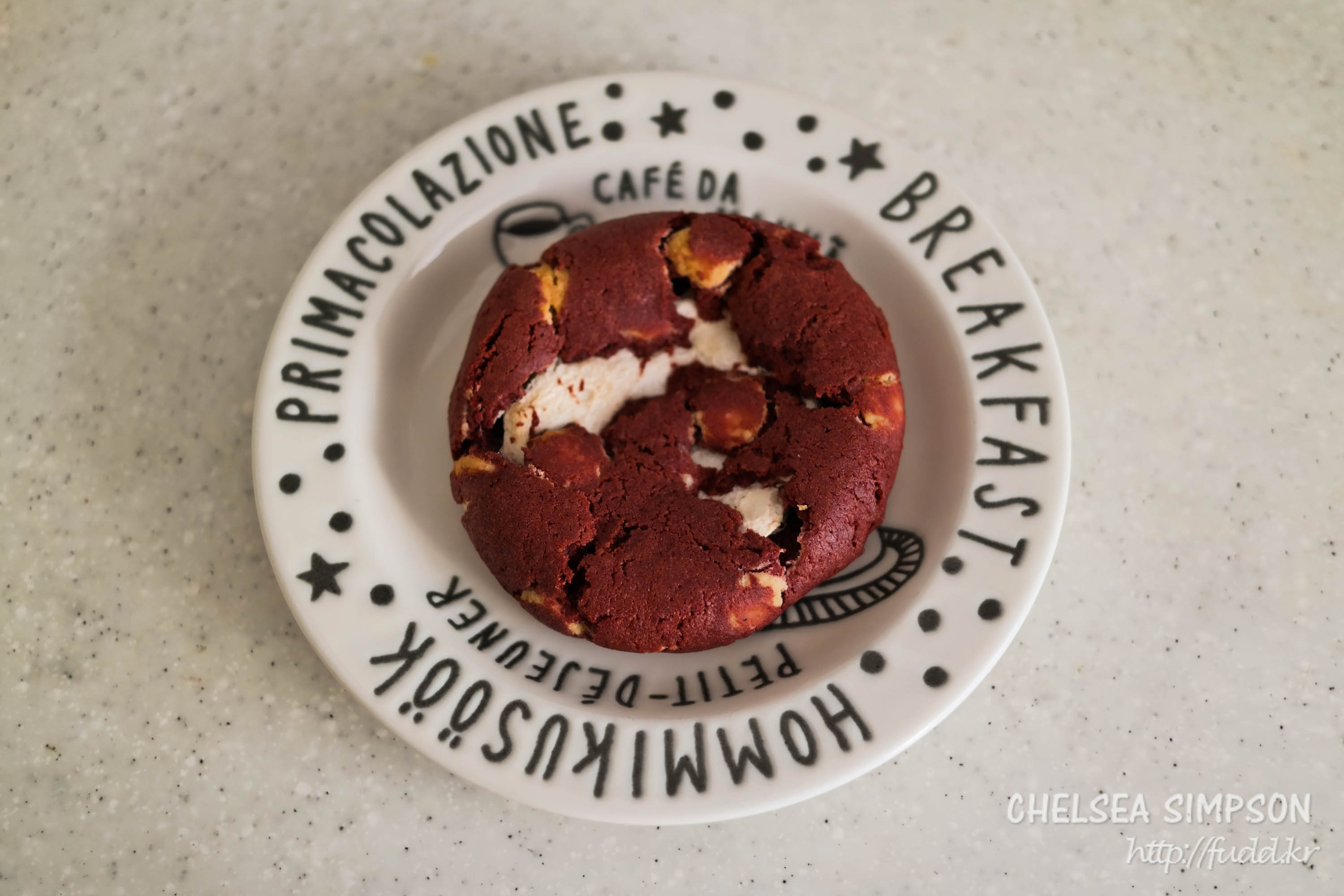 루비 스모어 쿠키 와인빛 반죽에 몰랑몰랑 폭신한 마시멜로와 우유맛 진한 화이트 커버춰가 고급스러운 단맛을 더한다.