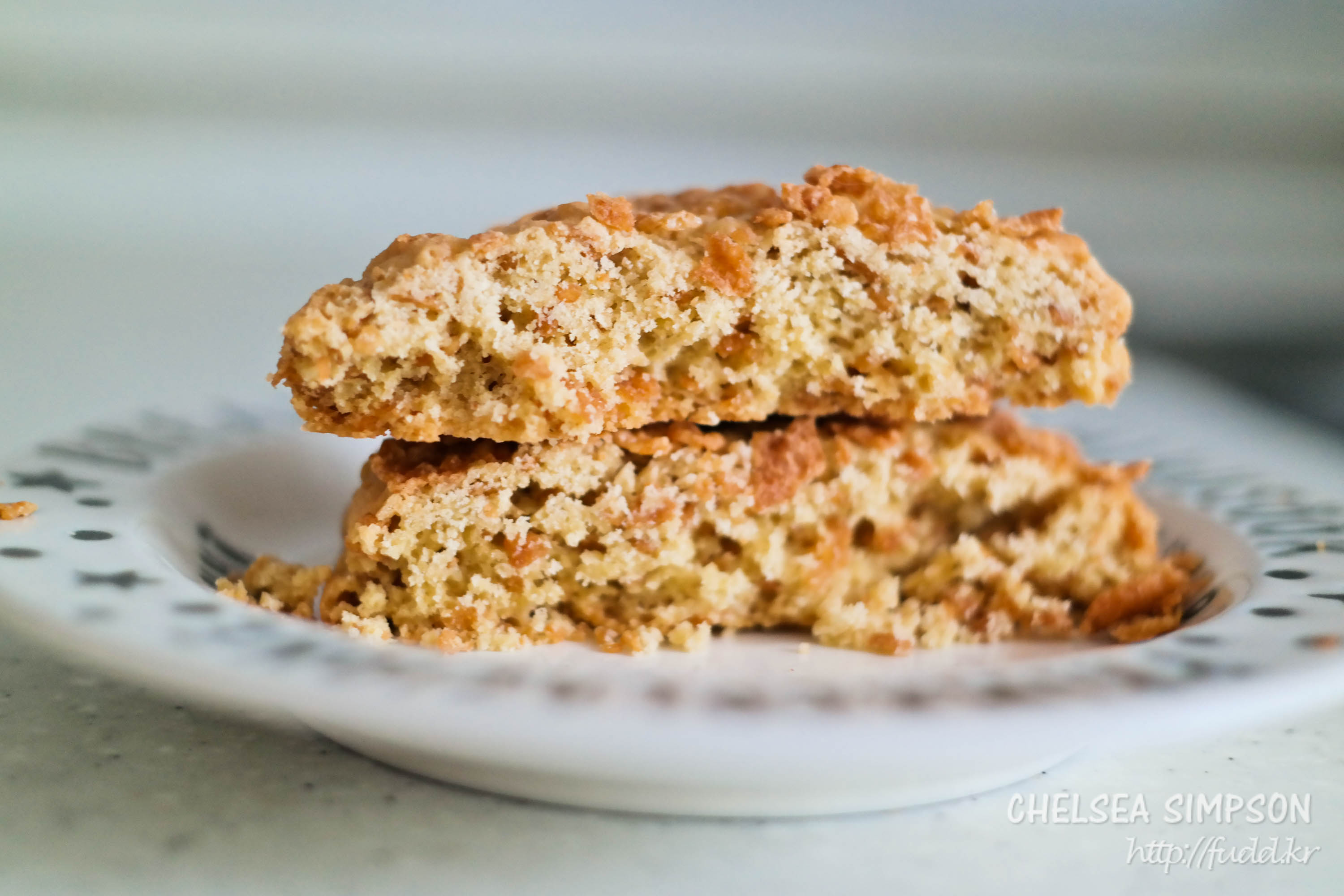 누룽지처럼 구수하고 담백한 맛이 나고 약간 꾸덕하면서 촘촘한 쿠키이다.