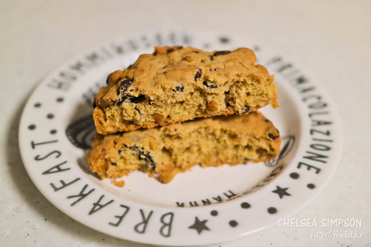 - 데치고 구워 고소함을 살린 호두와 진한 초콜릿이 어우러져 견과류 초코 쿠키의 정석 같은 맛이다.