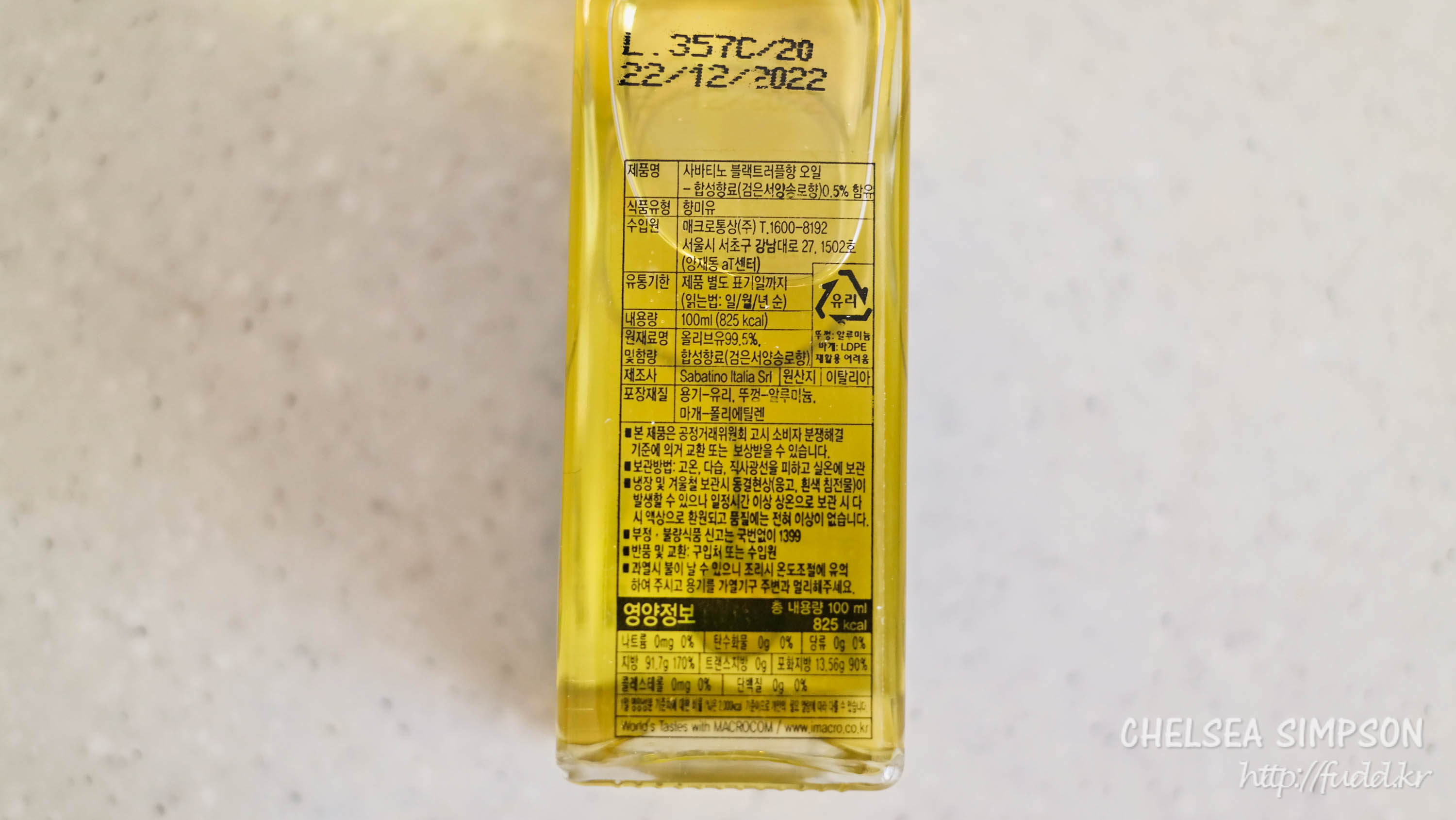 올리브유 99.5%에 합성 향료(검은서양송로향)이 첨가돼있다.