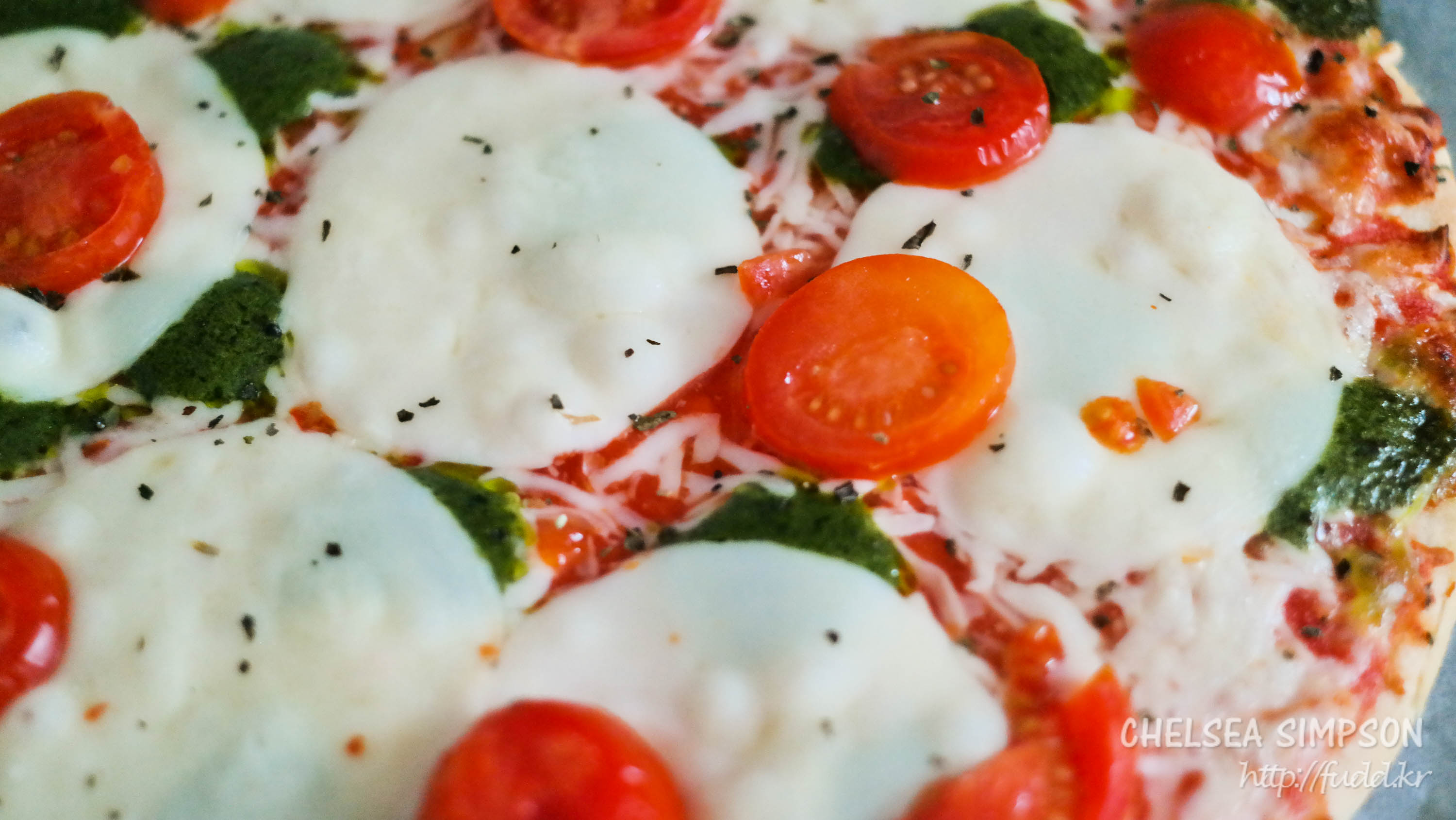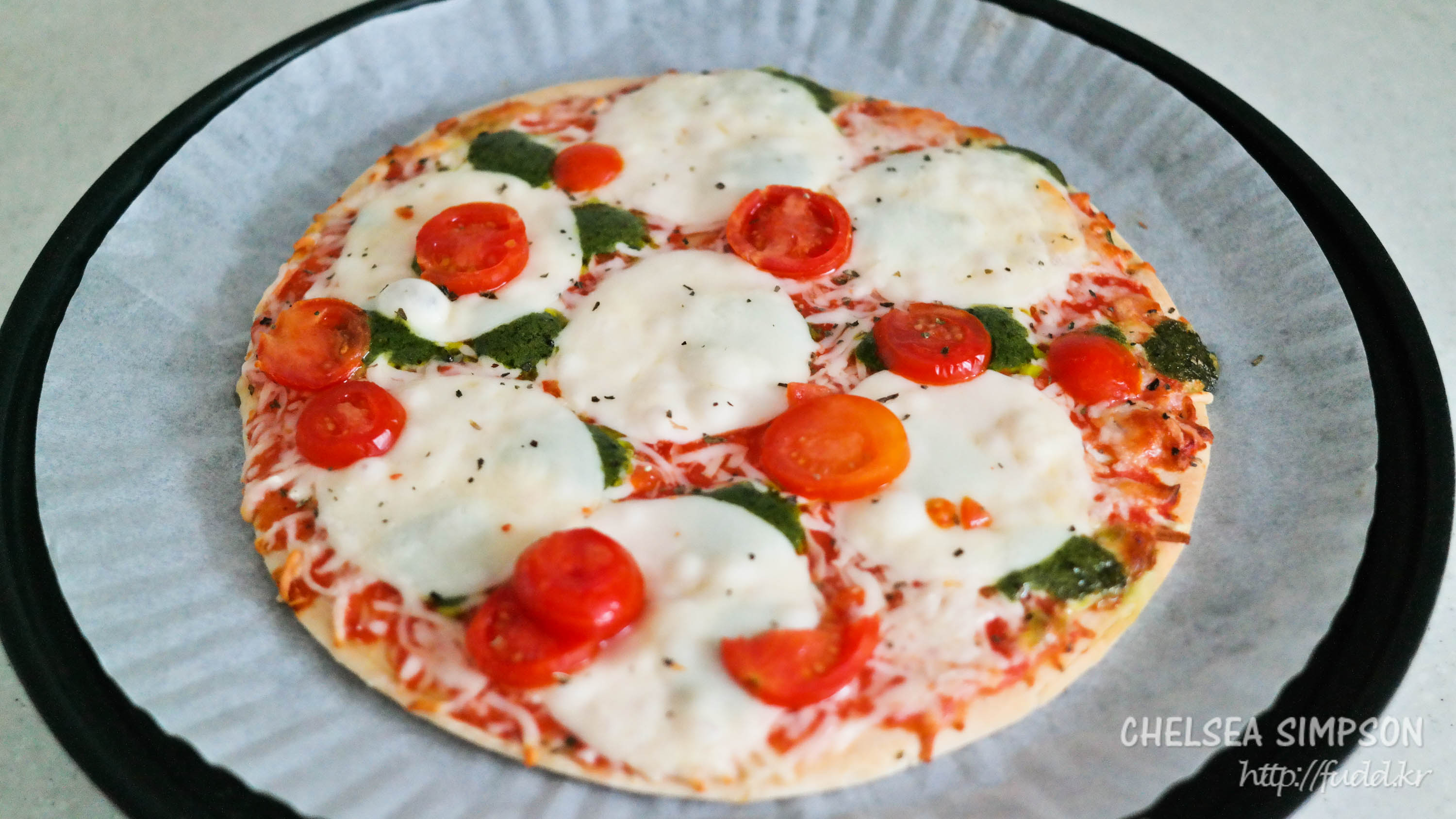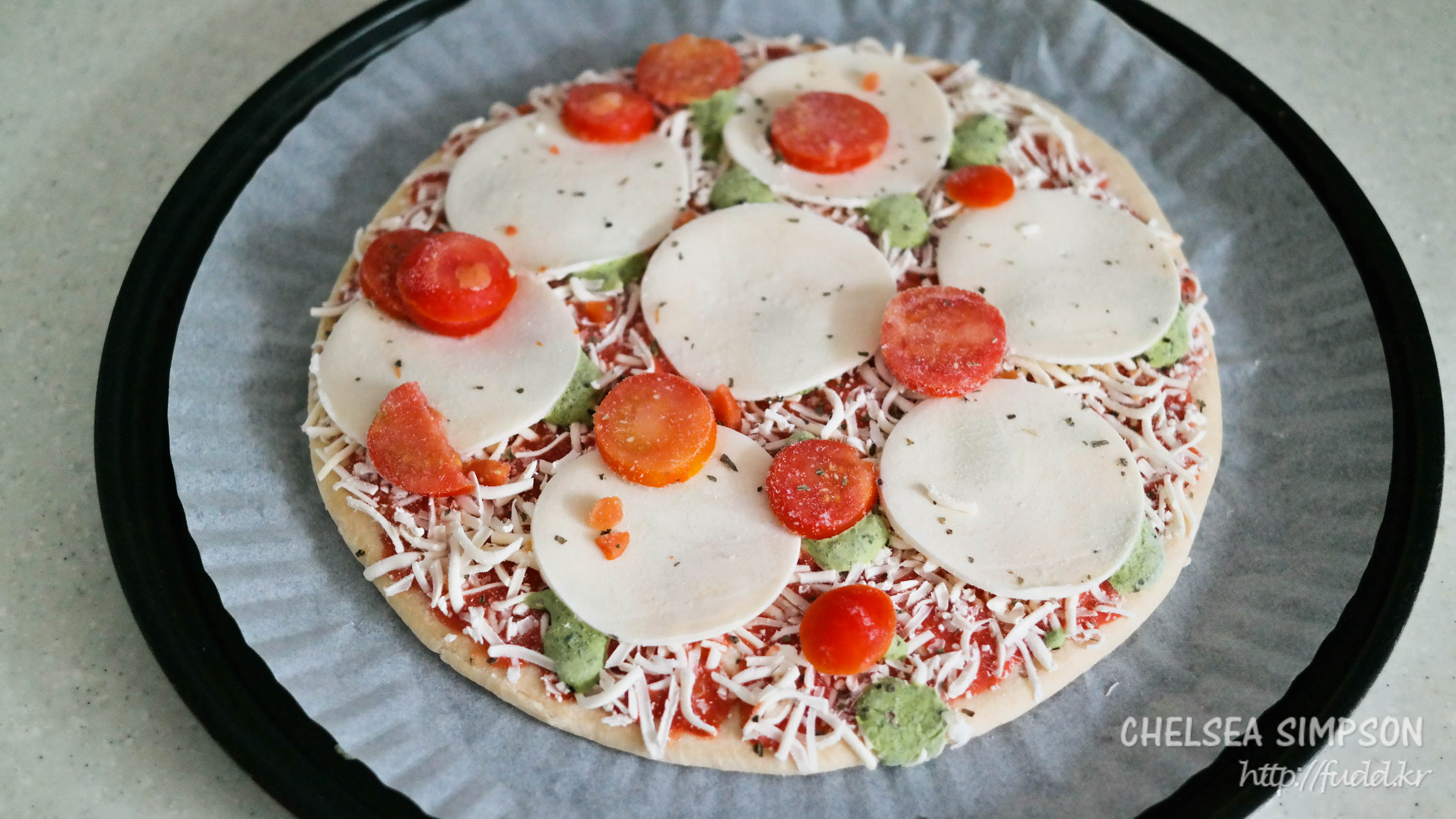 토핑으로 동그란 모짜렐라 치즈, 도톰하게 썬 방울토마토, 슈레드 치즈, 바질 소스 등이 빼곡히 올라가있다.