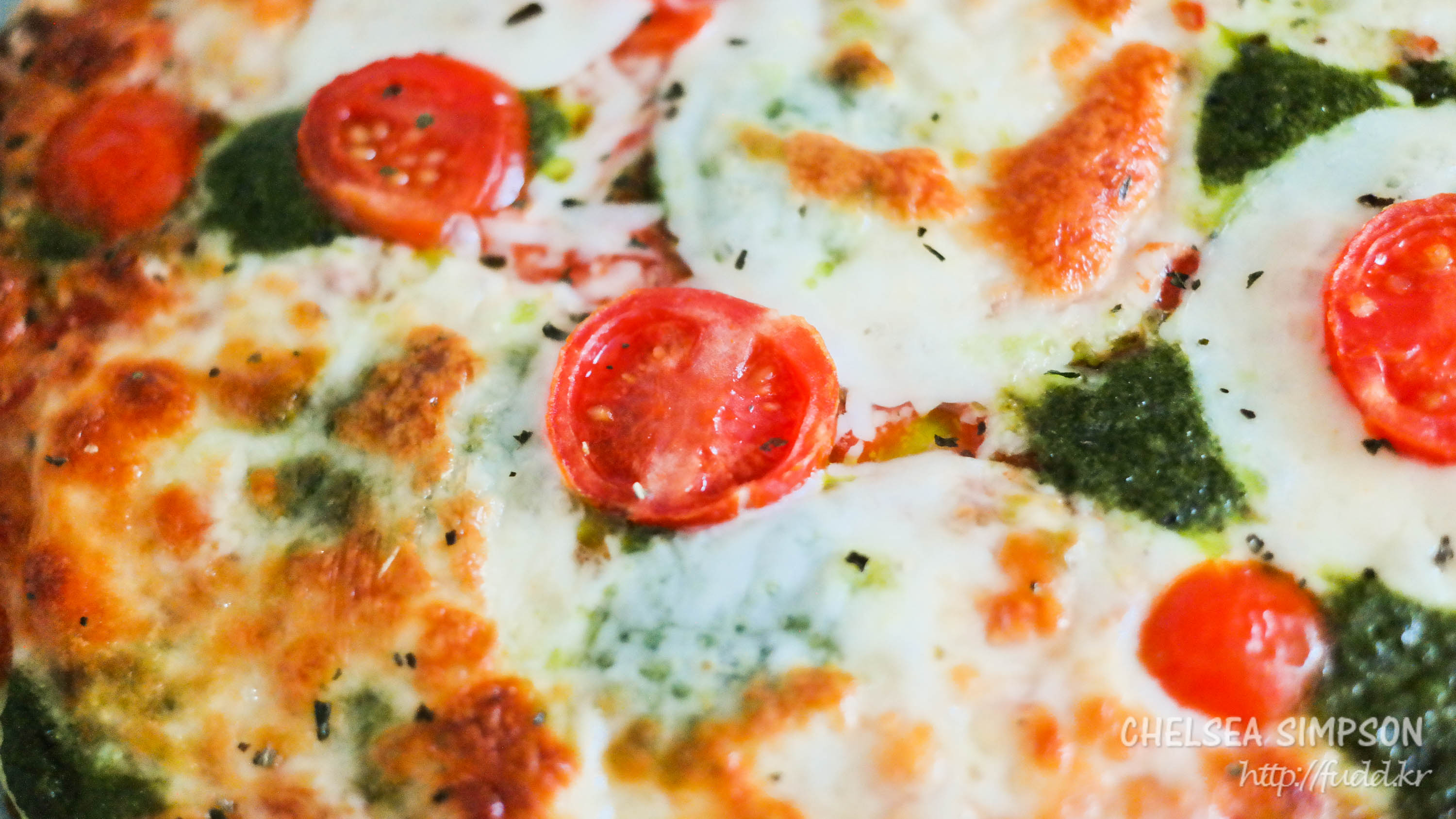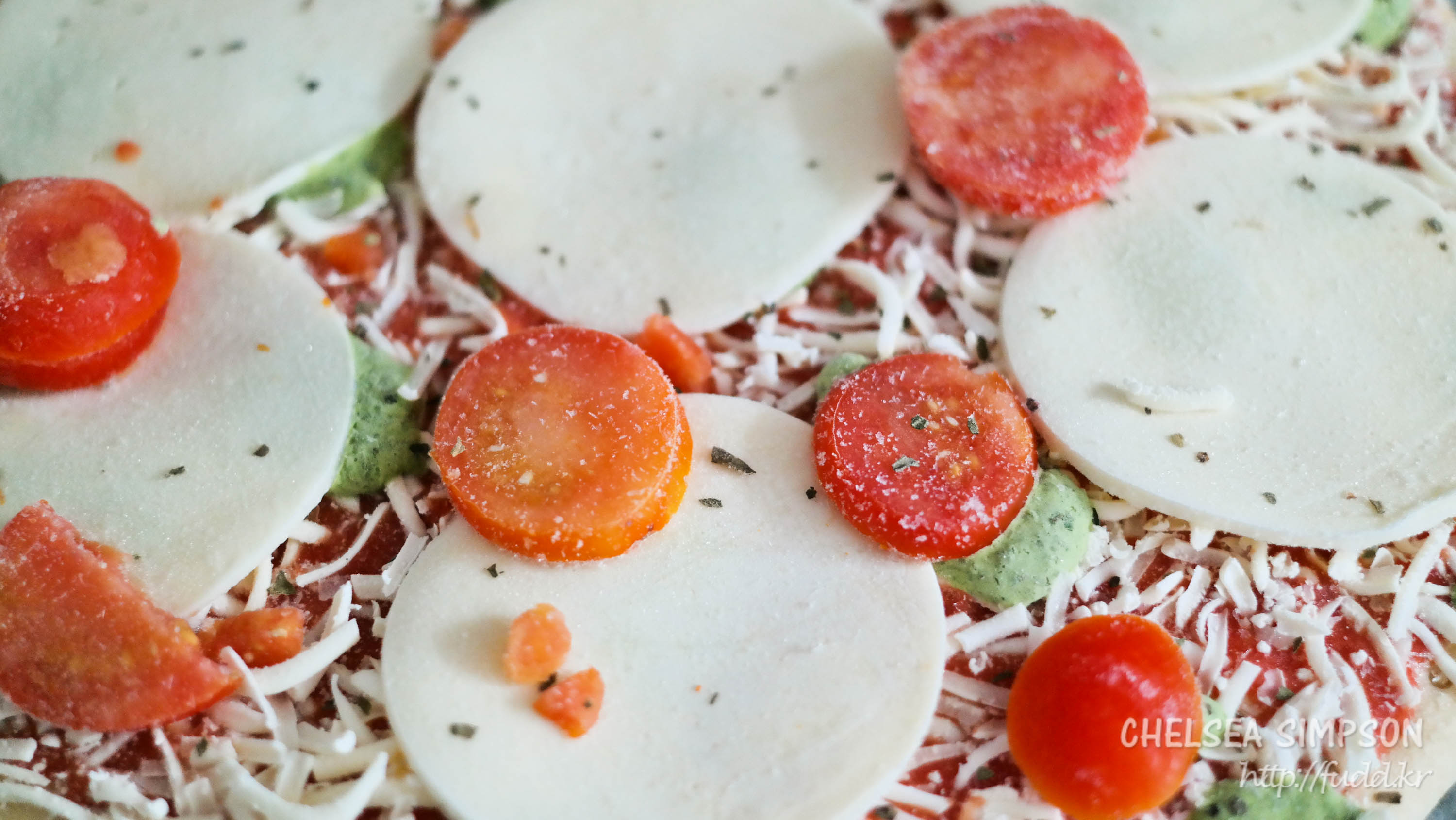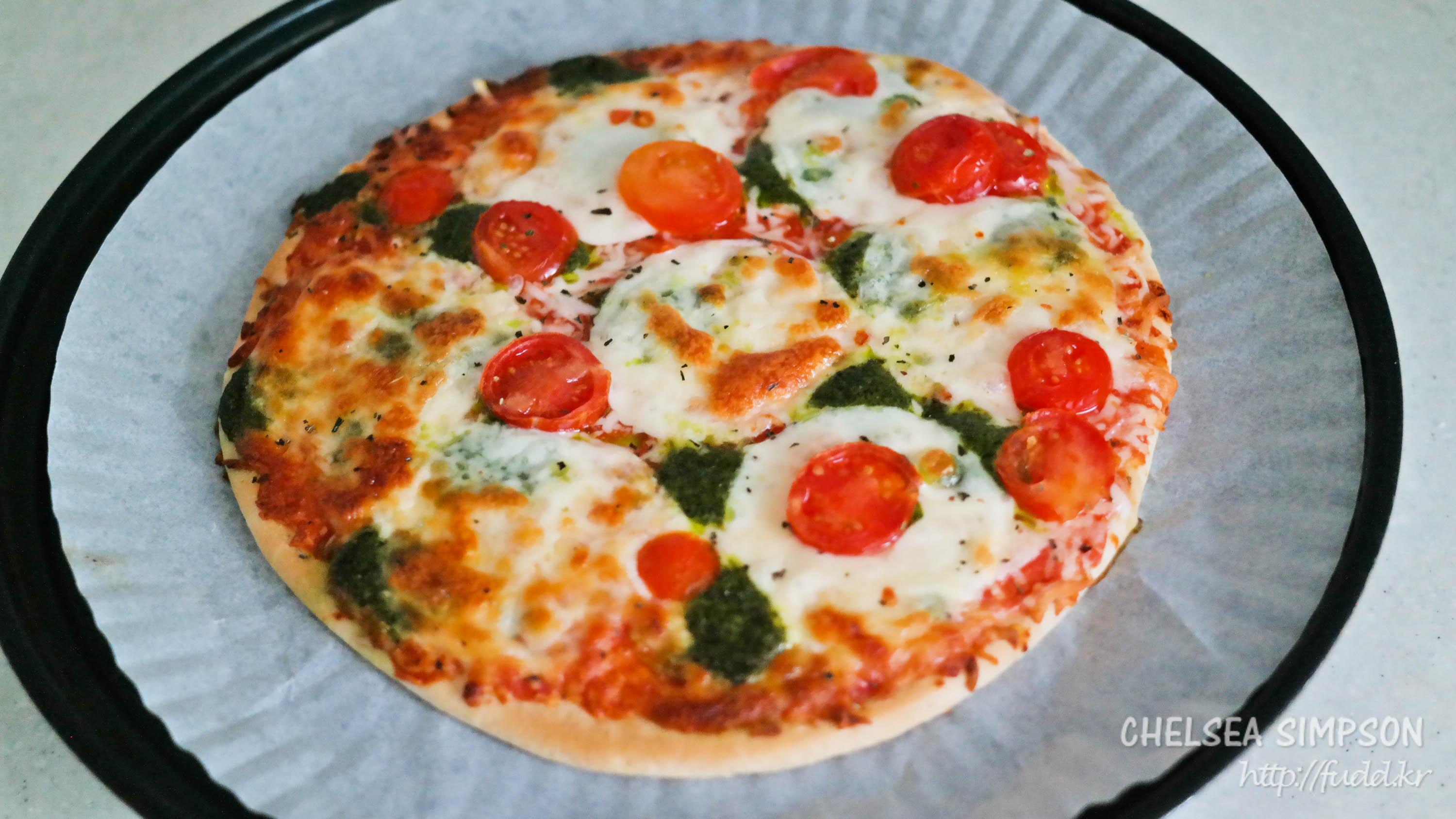 토핑으로 동그란 모짜렐라 치즈, 도톰하게 썬 방울토마토, 슈레드 치즈, 바질 소스 등이 빼곡히 올라가있다.