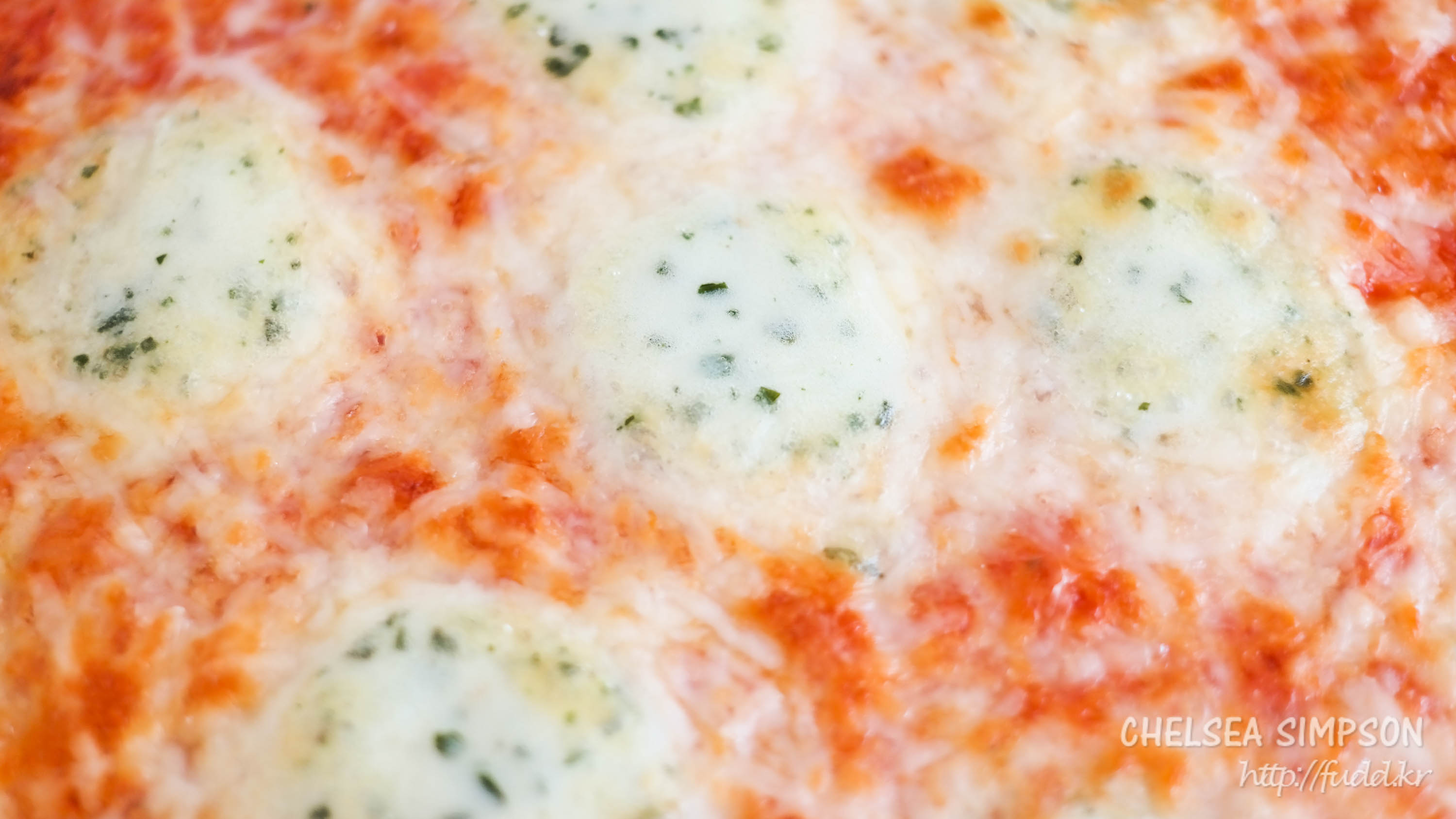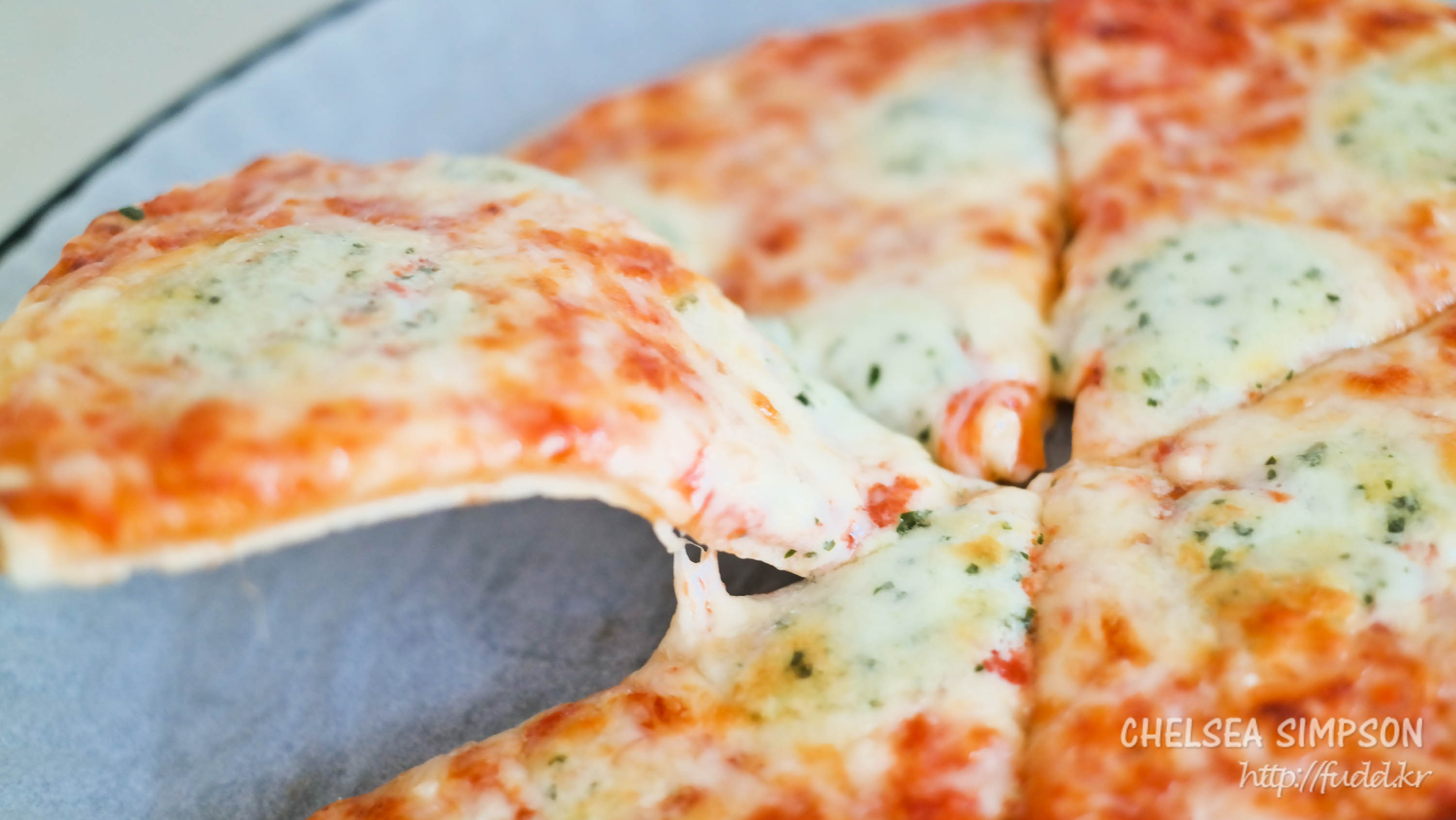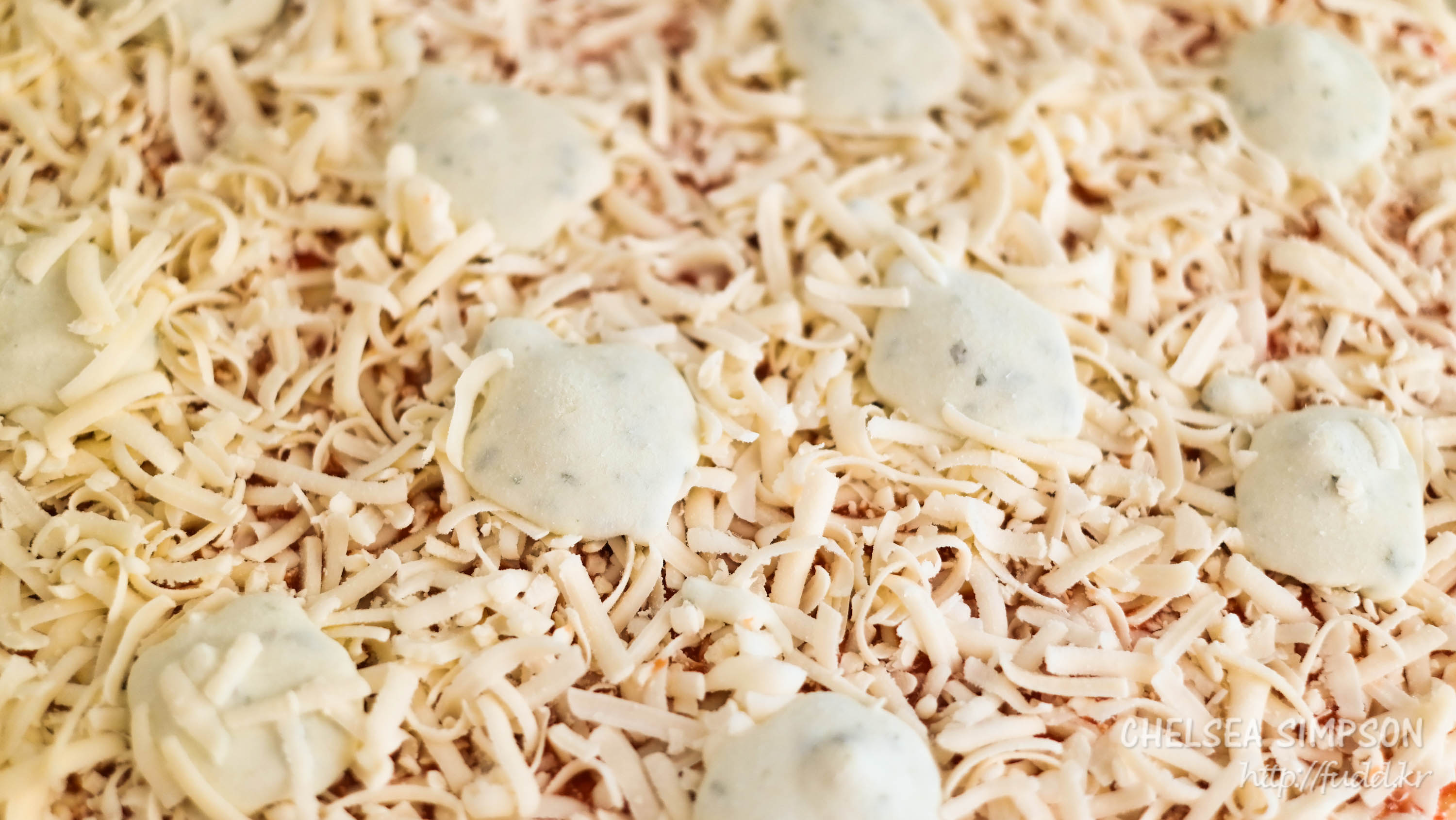토핑으로 슈레드 모짜렐라치즈, 에담치즈, 에멘탈치즈, 블루치즈 등이 빼곡히 올라가있다.