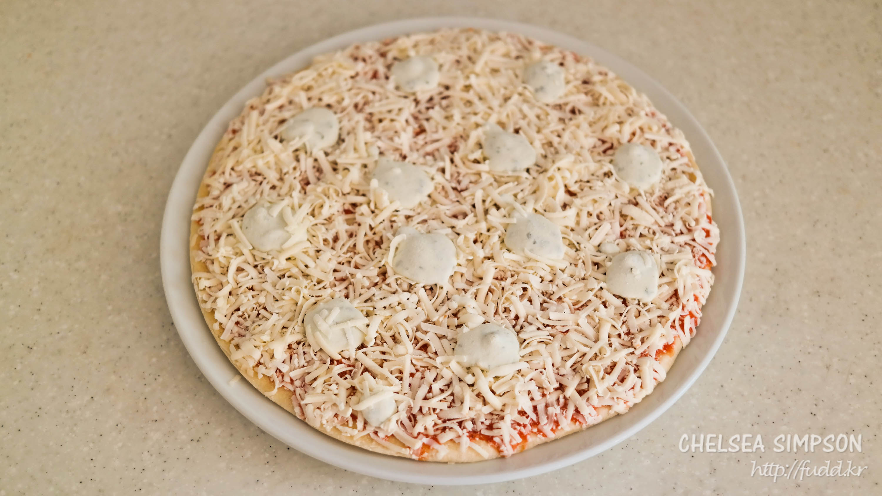 추천 추가 토핑은 슈레드 피자치즈(50-70g 정도), 스위트콘, 저민 버섯, 굽고 난 뒤 뿌리는 트러플오일 등.