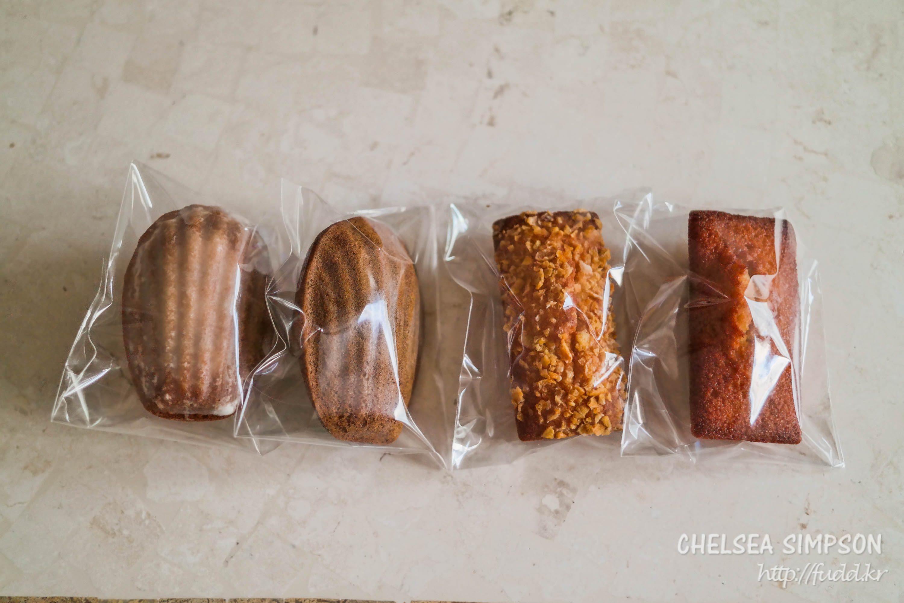 뒤집어 놓은 레몬 마들렌, 참쑥 마들렌, 플레인 휘낭시에, 옥수수 휘낭시에.