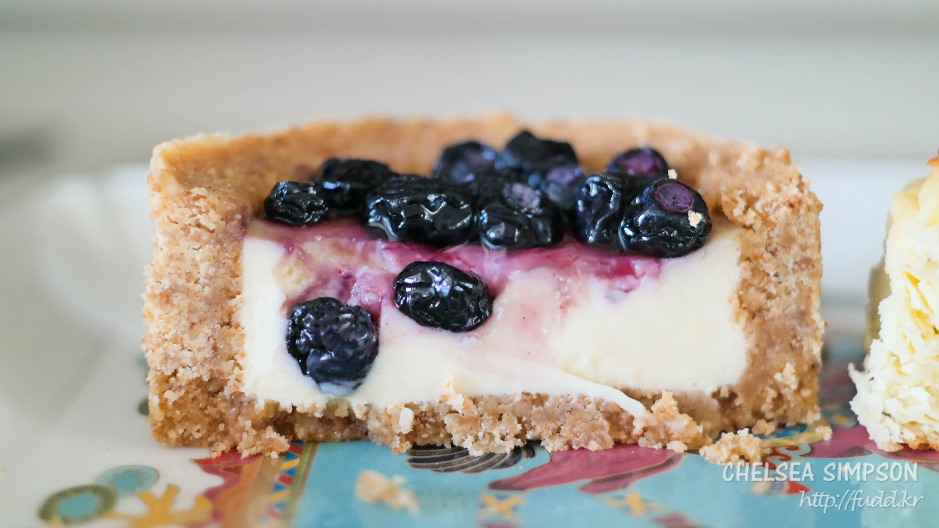 블루베리 쿠키 치즈케이크는 두툼한 쿠키로 만든 틀 안에 크림치즈 반죽을 넣어 구운 뒤 블루베리 토핑을 했다.