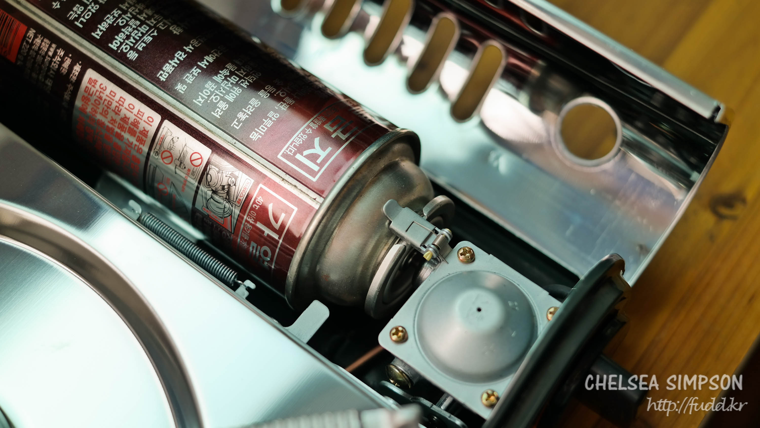 위 이미지처럼 ①가스 용기 장착 레버를 아래로 내려주고 ②점화 손잡이를 시계 반대 방향으로 돌려주면 된다.