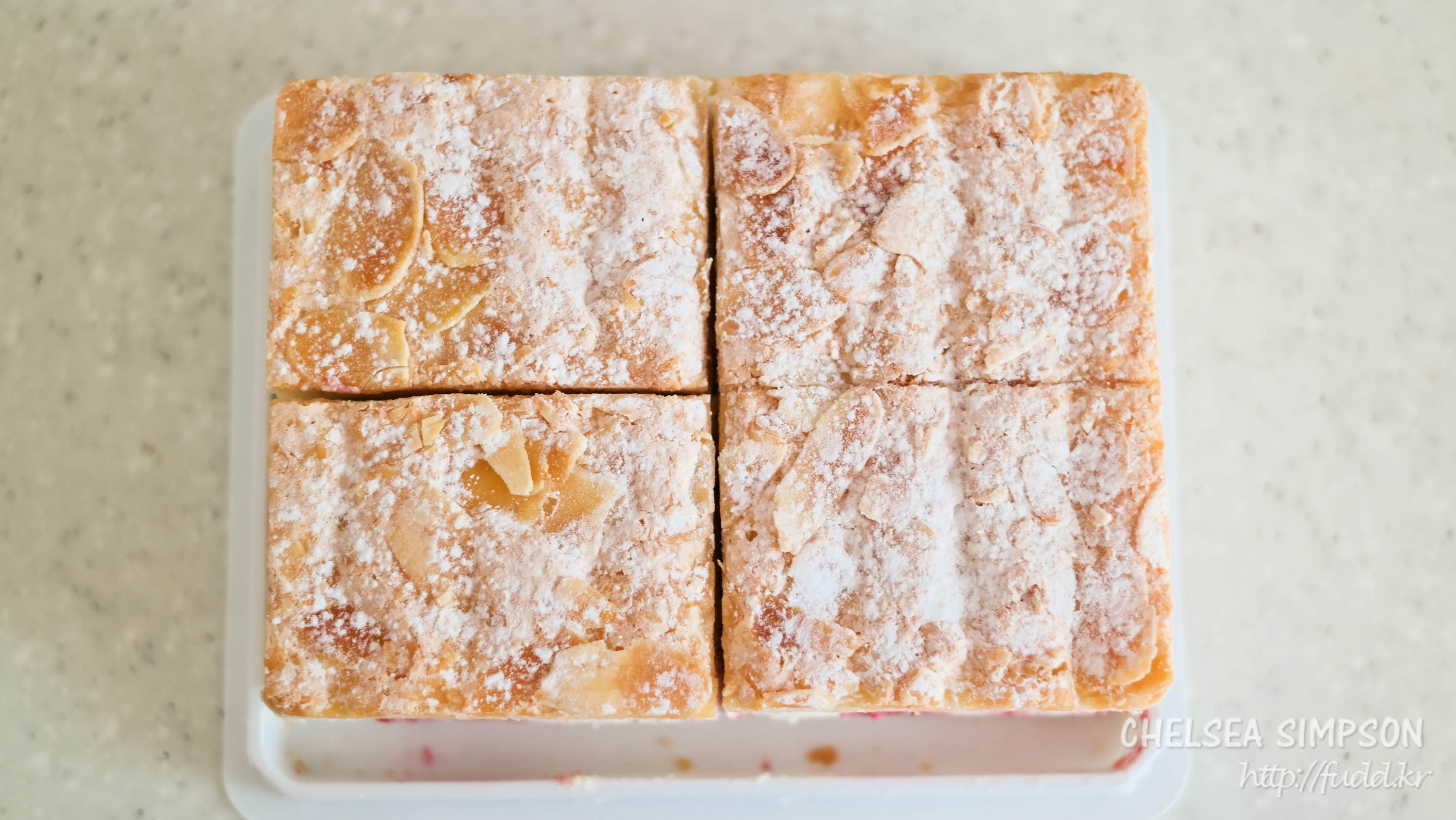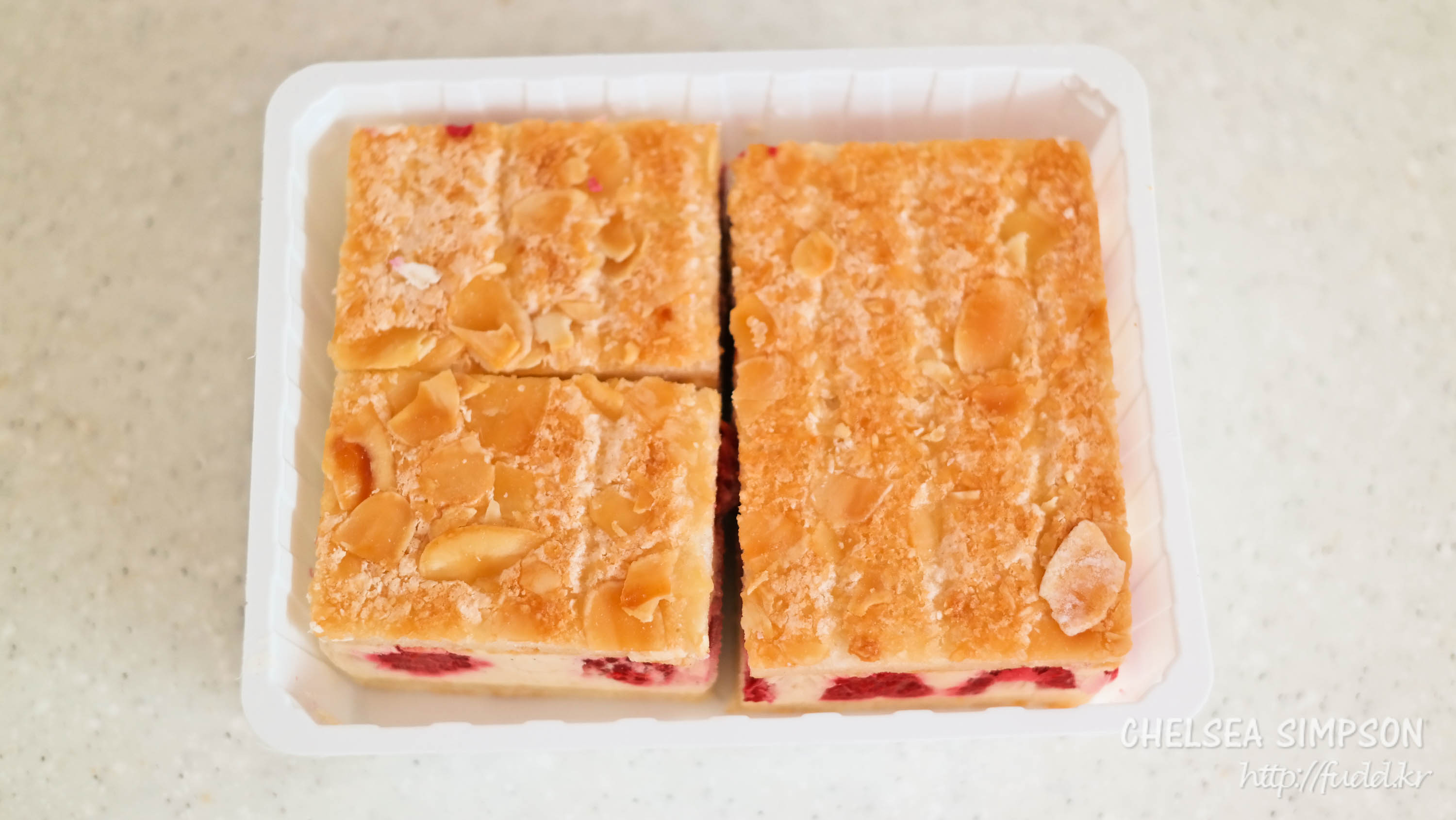케이크의 수분을 머금어서 아몬드 슬라이스가 좀 눅눅하긴 하지만 그래도 고소함이 있다.