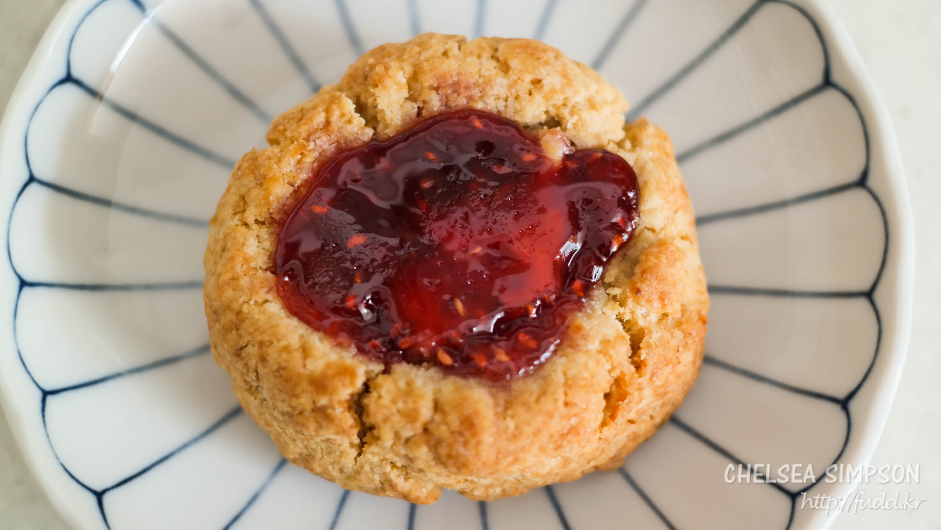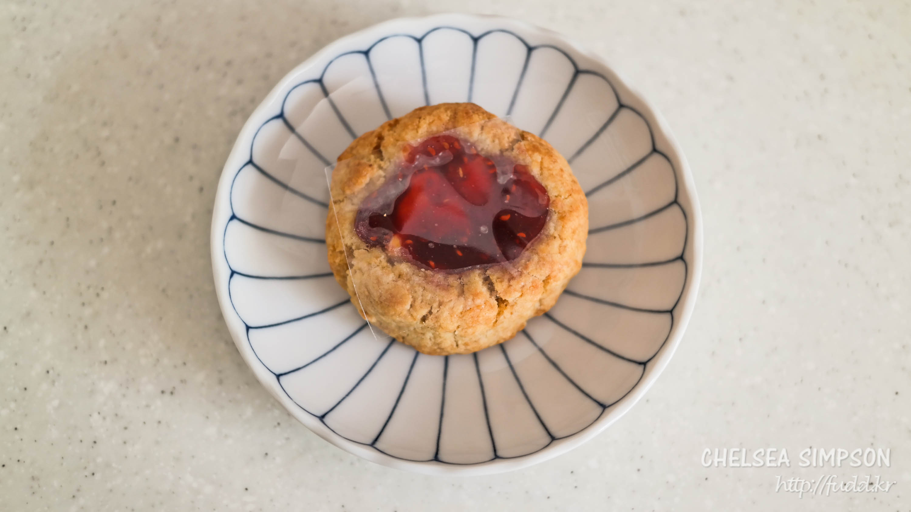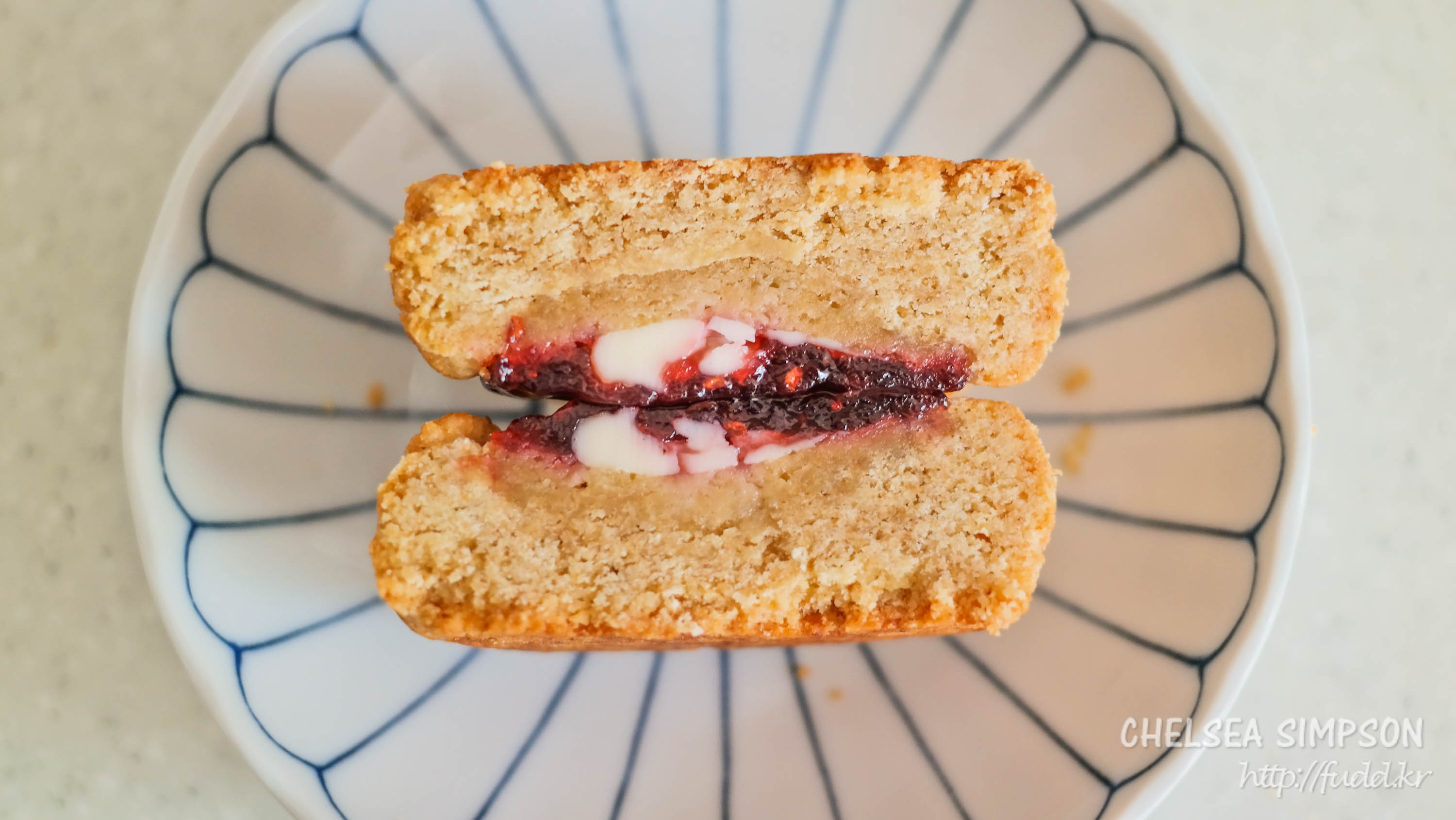 묵직한 쿠키 속에 크림치즈 필링이 들어있고 위에 라즈베리 잼이 덮여있다.