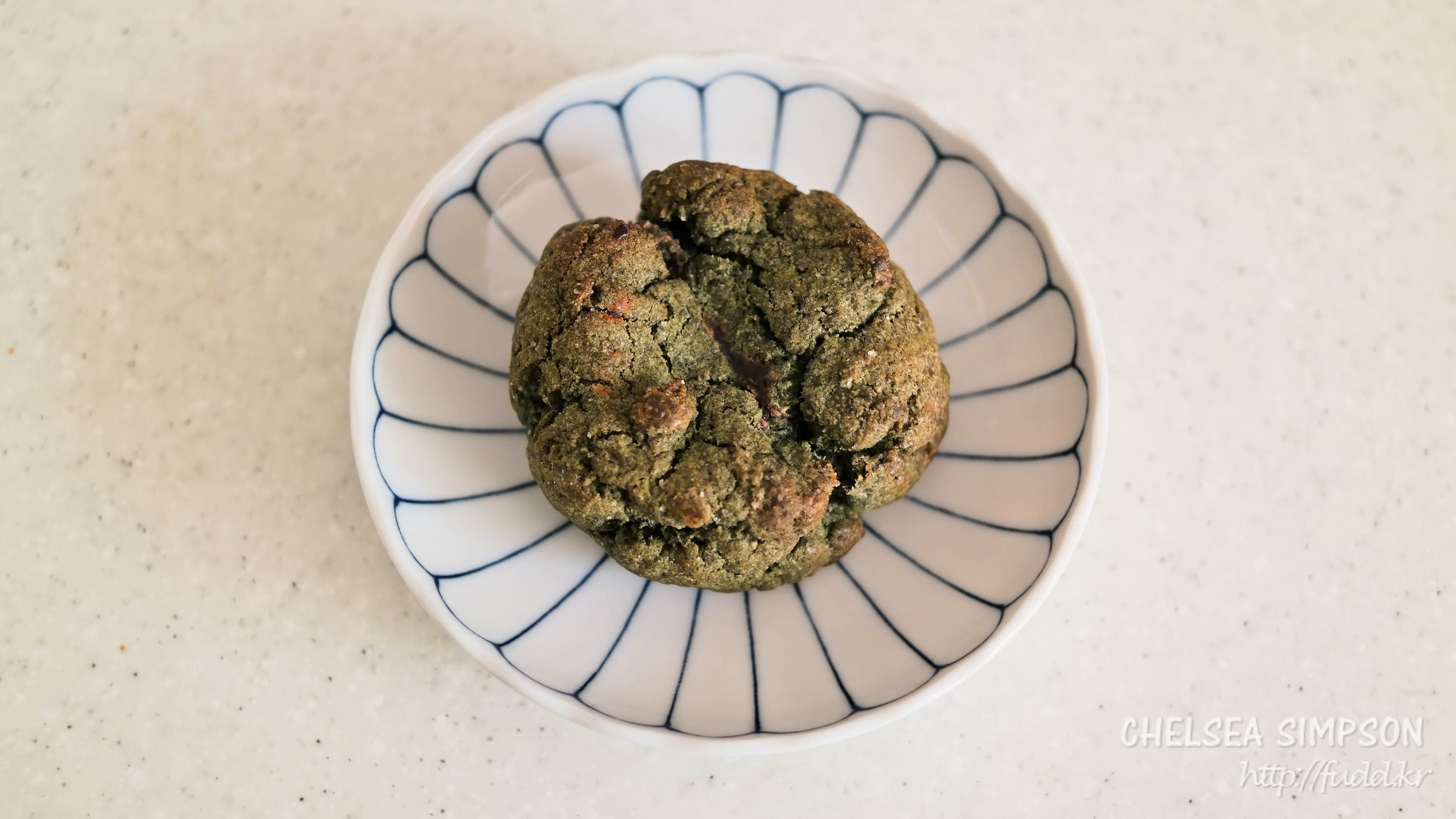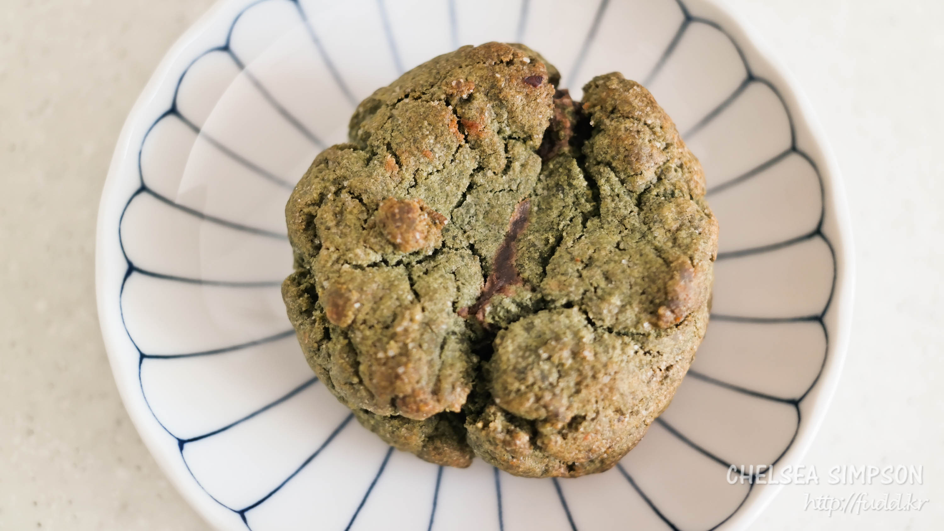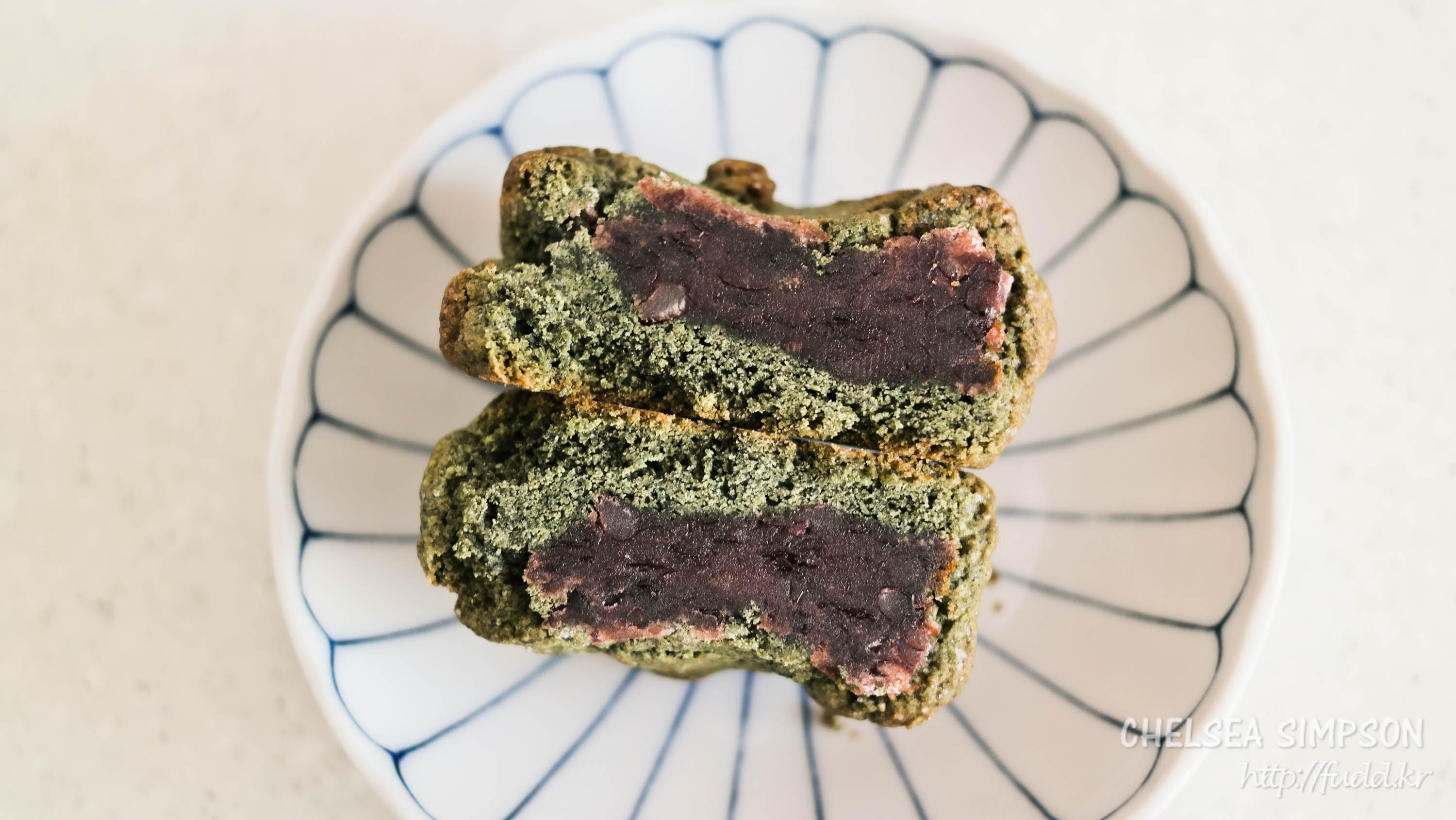 두툼한 쑥 쿠키 속에 팥앙금이 가득 들어있다.