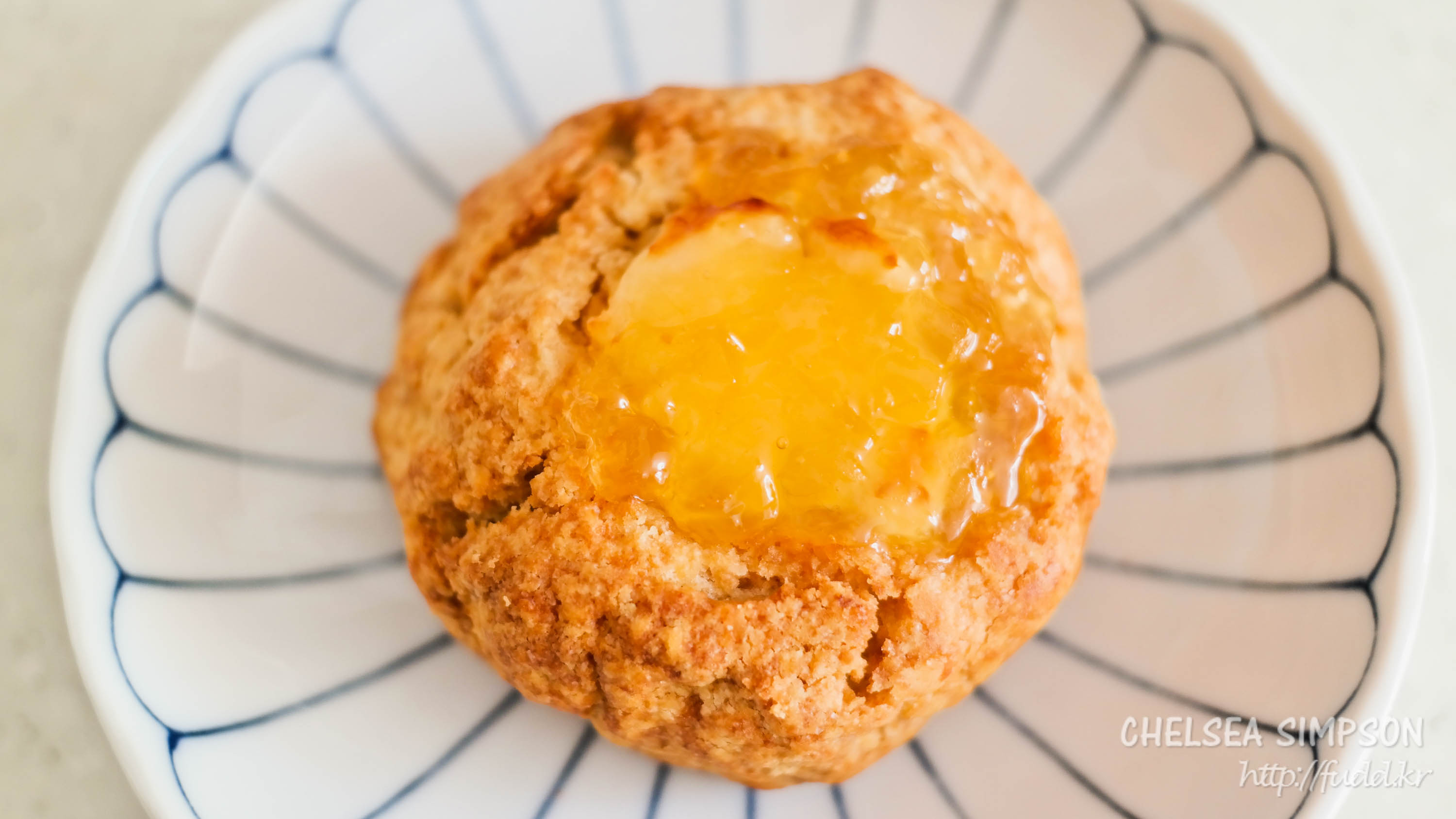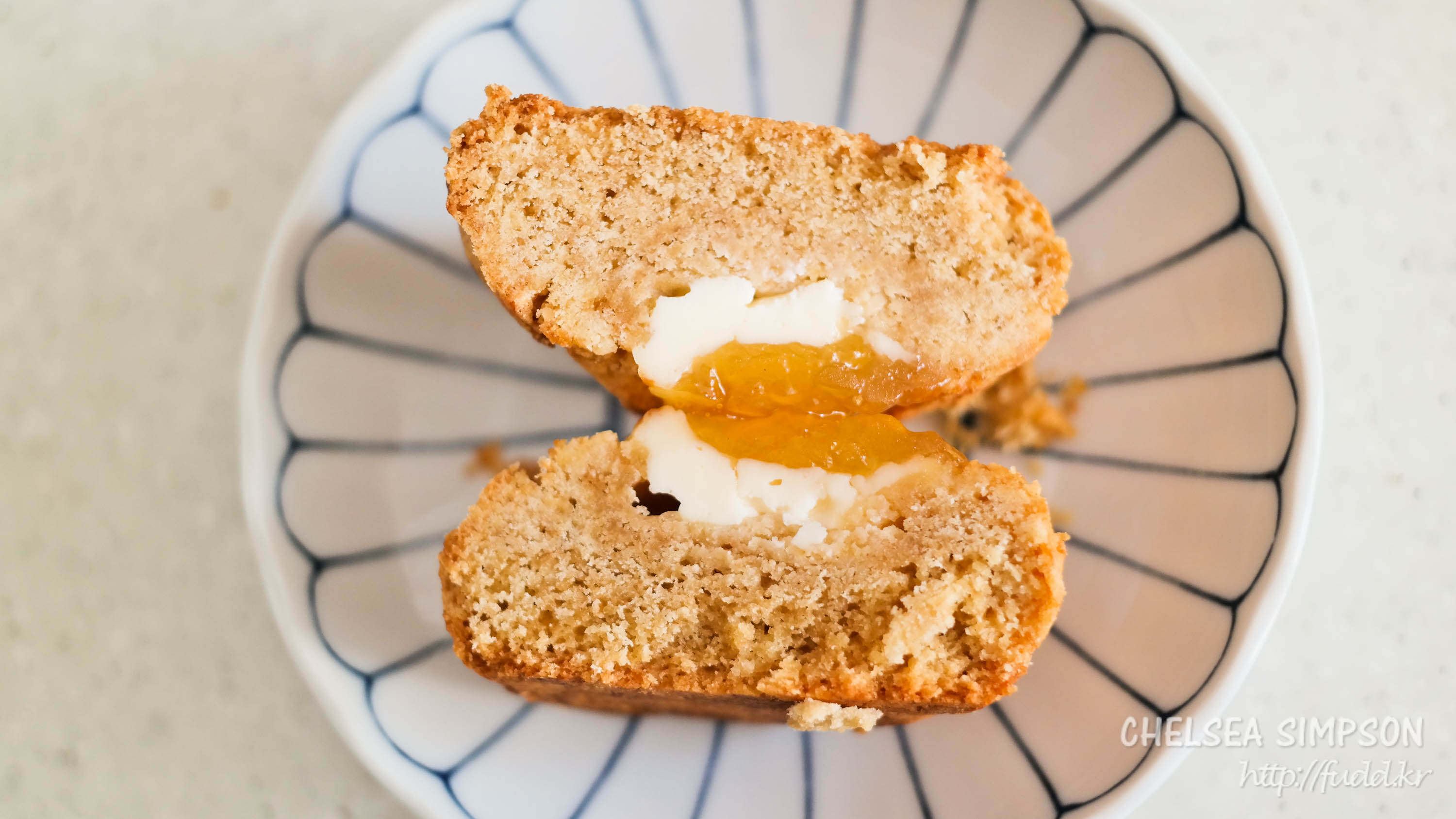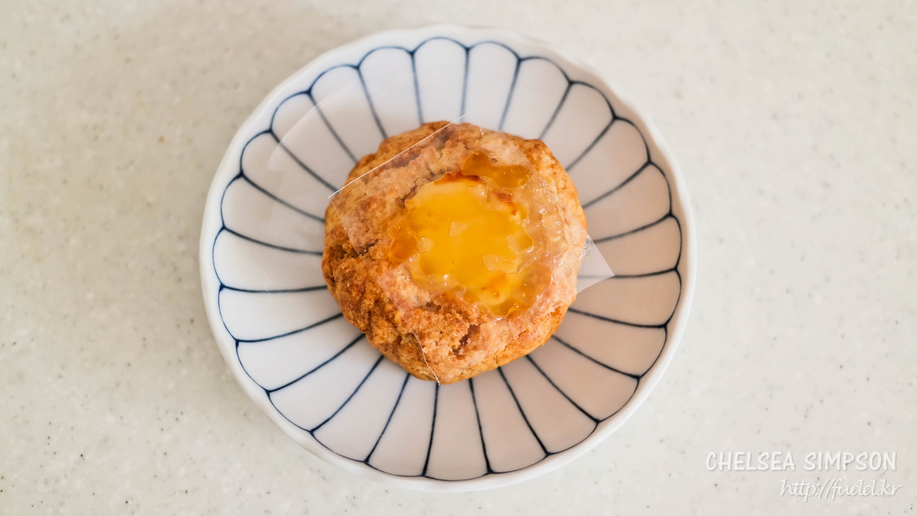 포슬포슬한 쿠키 속에 부드러운 크림치즈와 과육이 씹히는 사과잼이 어우러져서 잼 바른 스콘을 먹는 느낌이다.