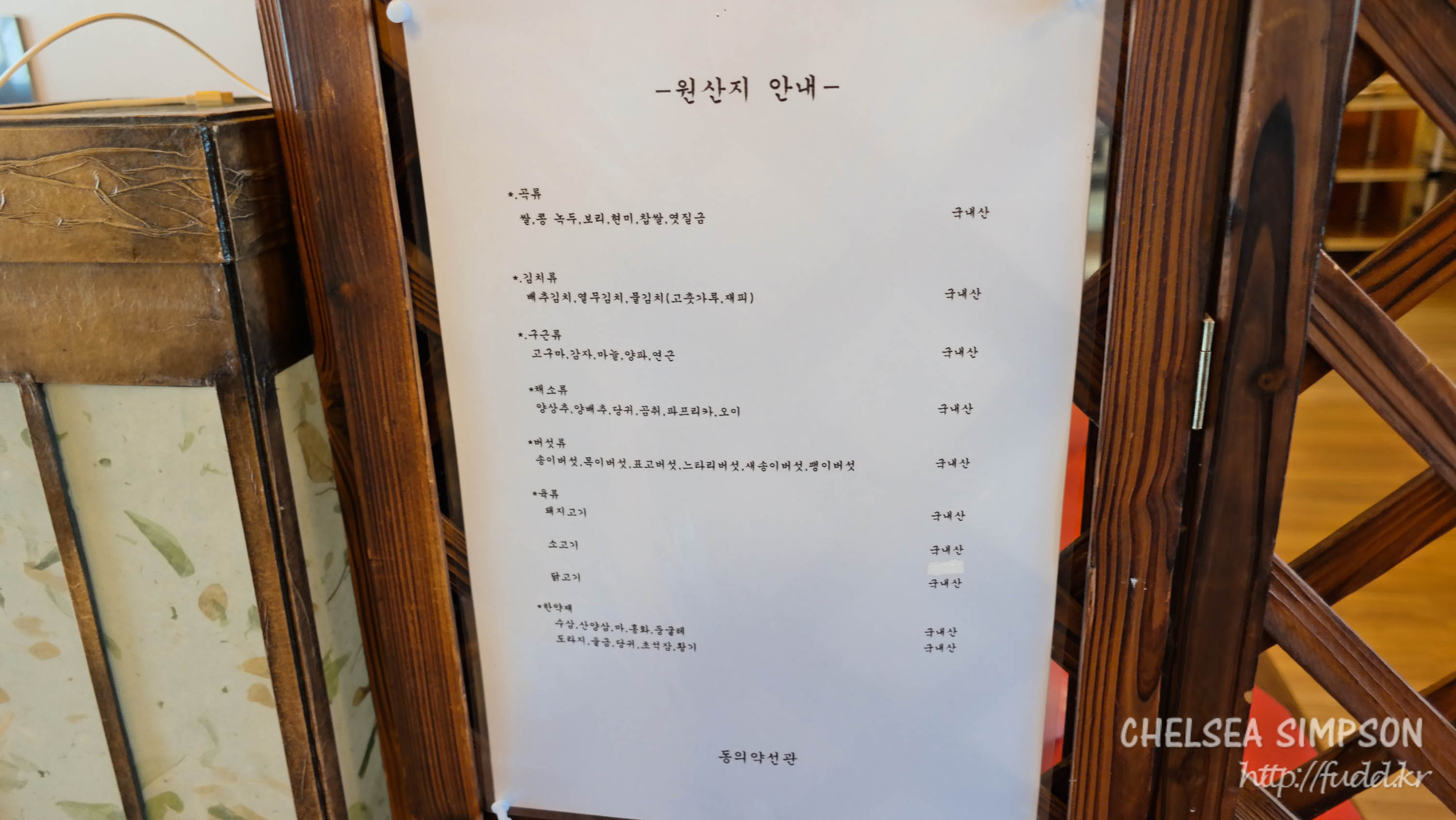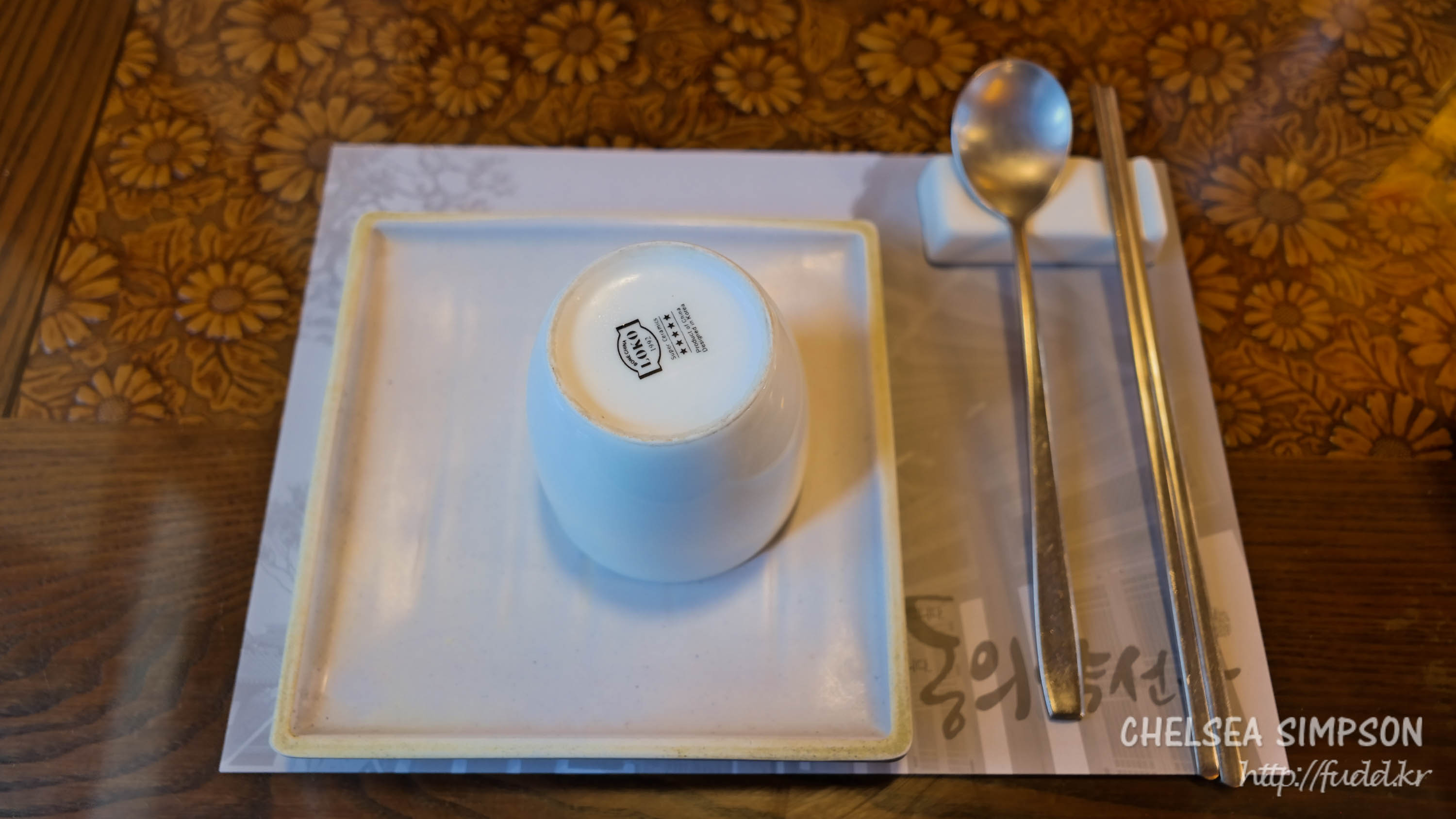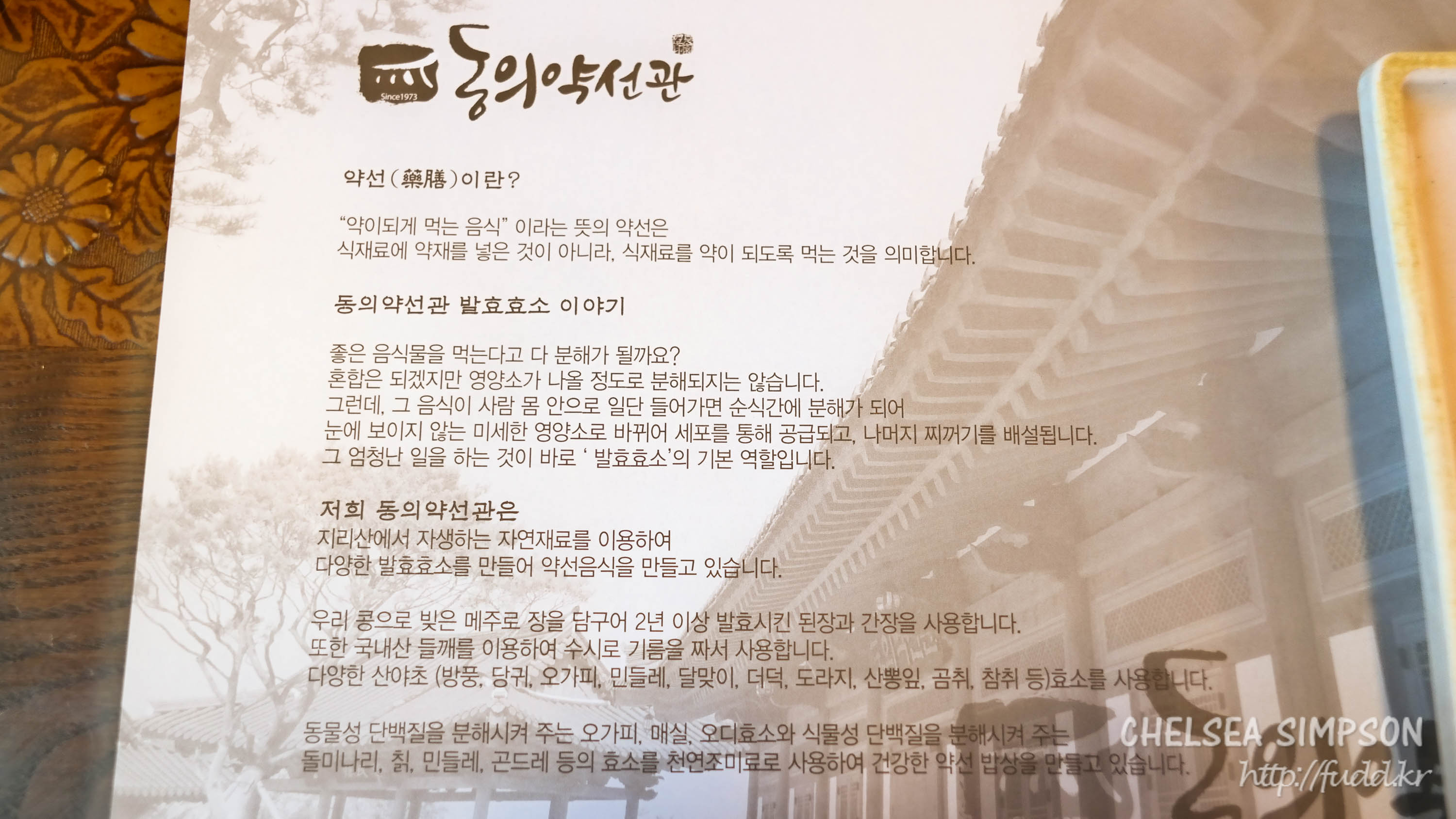 자리마다 종이 매트가 깔려있는데 동의약선관은 지리산에서 채취한 식재료를 발효시켜 음식맛을 더한다고 한다.