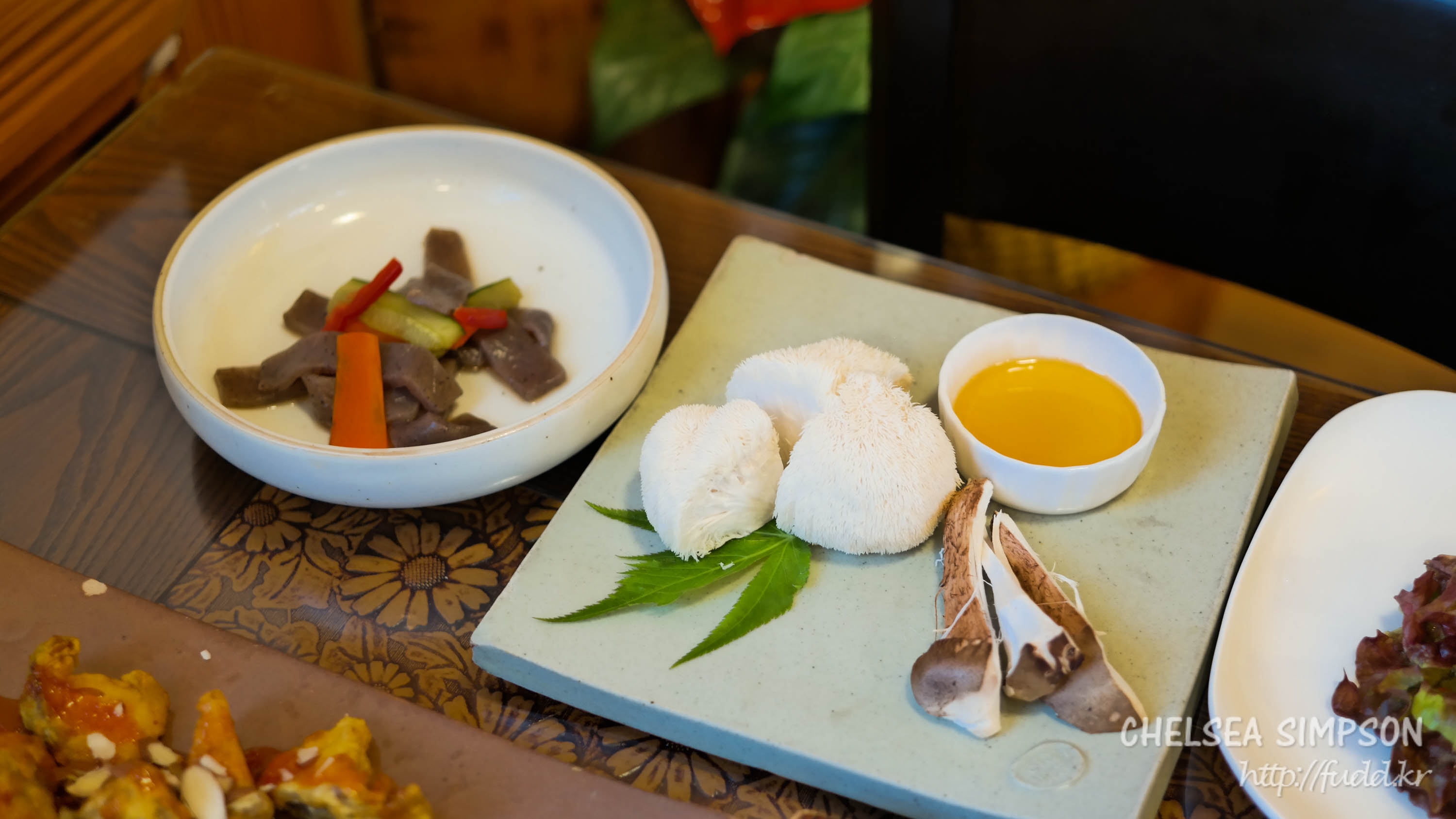 노루궁뎅이버섯은 겉이 부숭부숭한데 참기름에 콕 찍어먹으니 폭신하면서 약간 살캉한 느낌이 재밌었다.