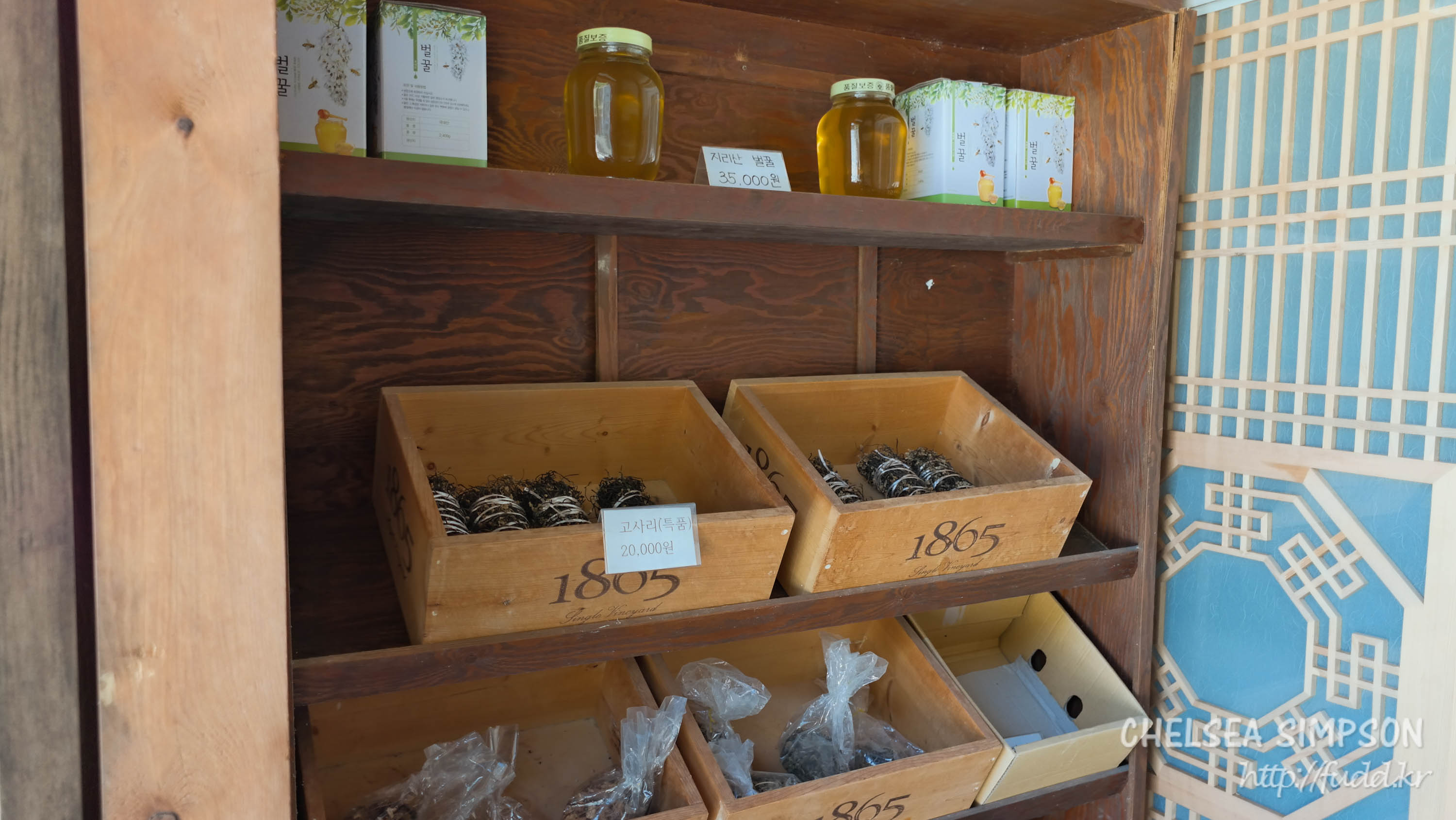 입구에서 꿀, 산나물 등도 판매하고 있다.
