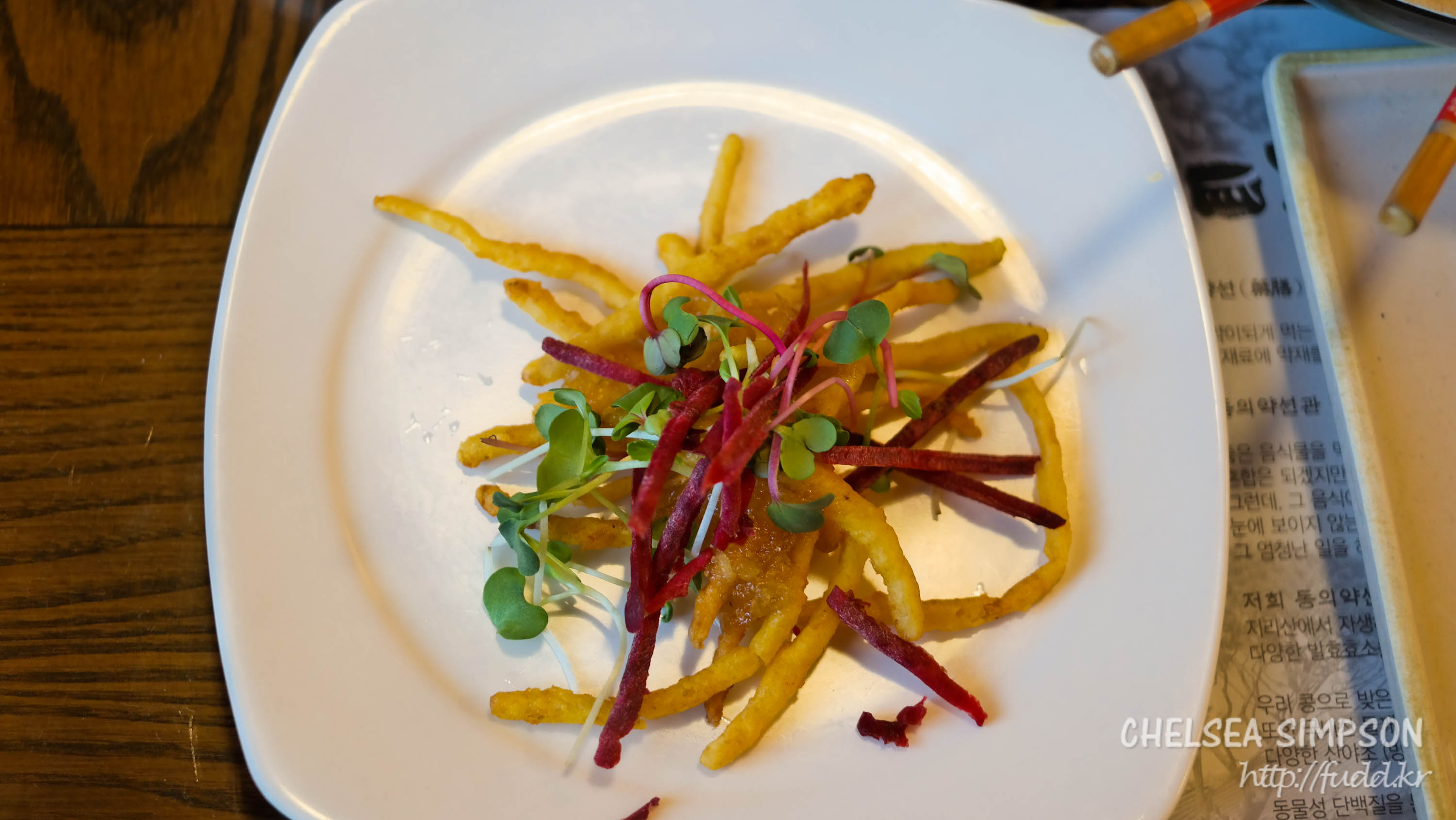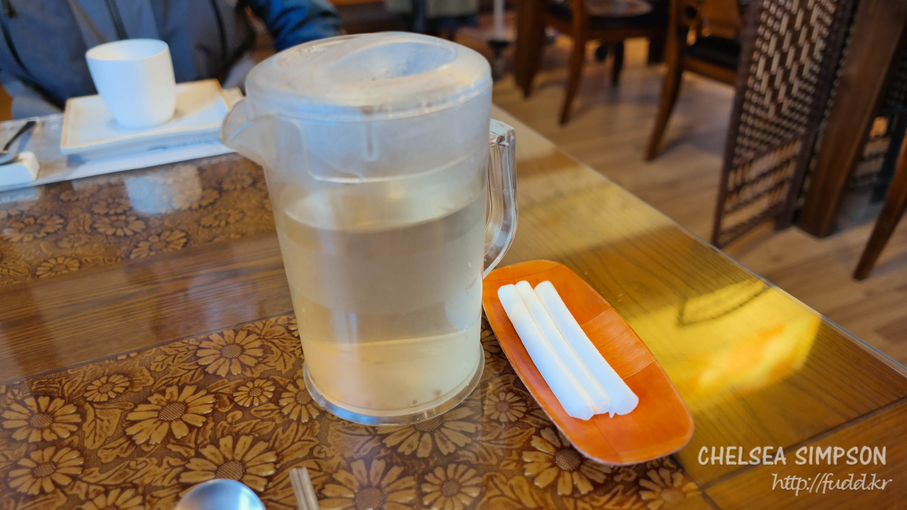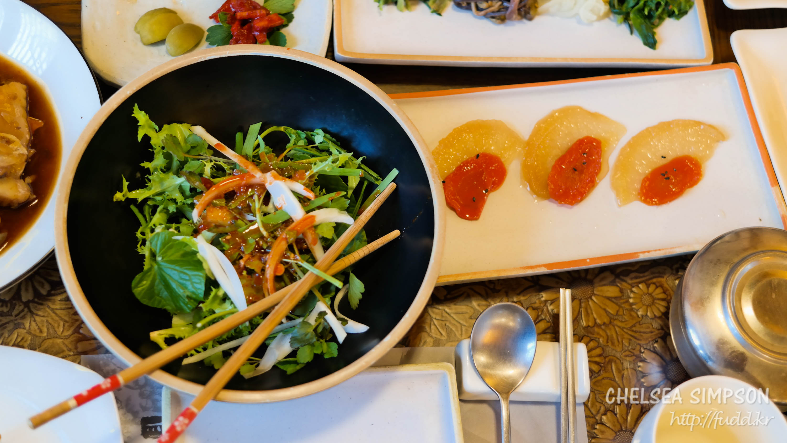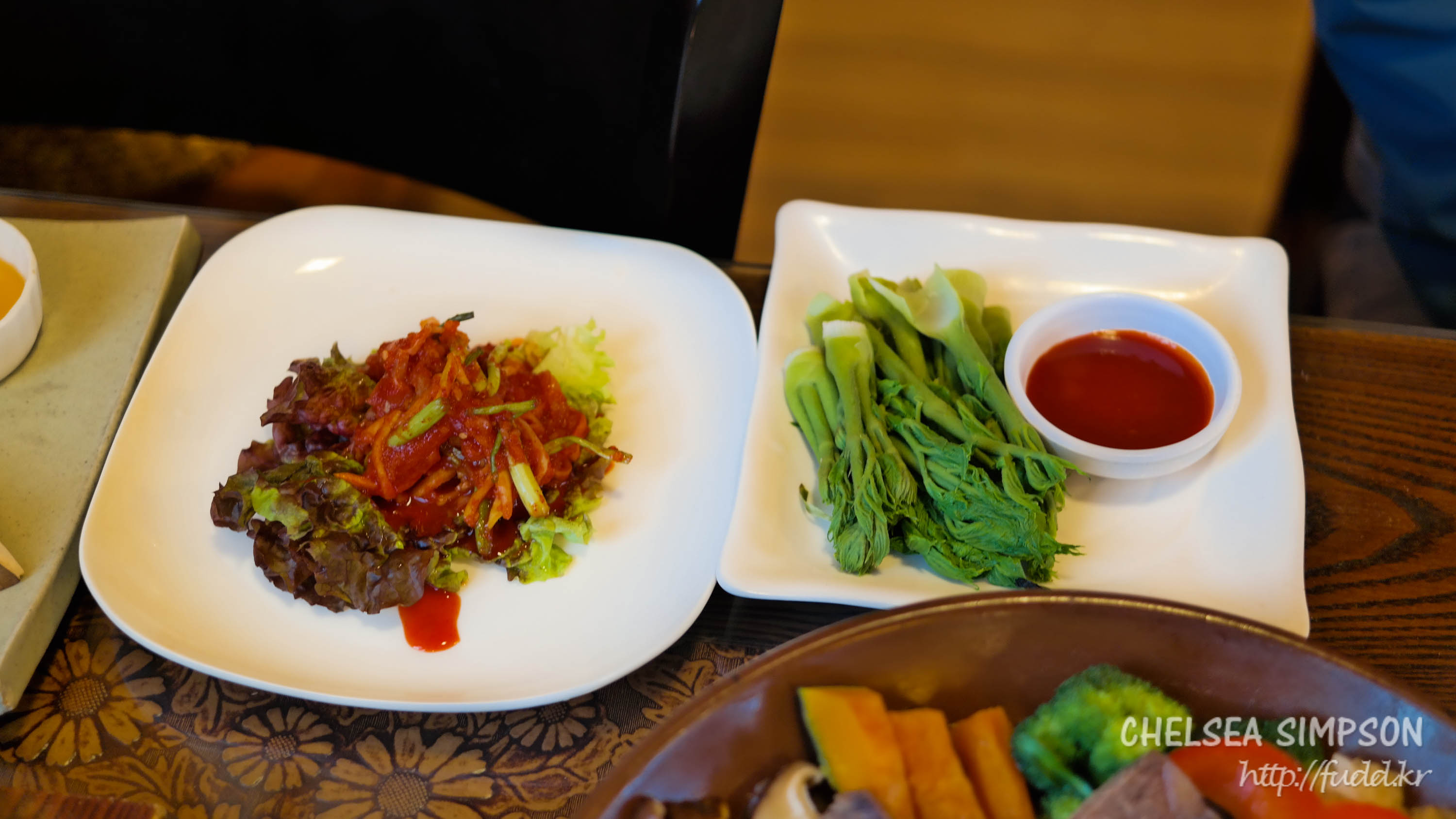 샐러드는 초장 비슷한 양념을 넣었는데 정도가 과하지 않아서 산뜻했고, 무와 당근 정과는 뭉근한 단맛이 은근했다.
