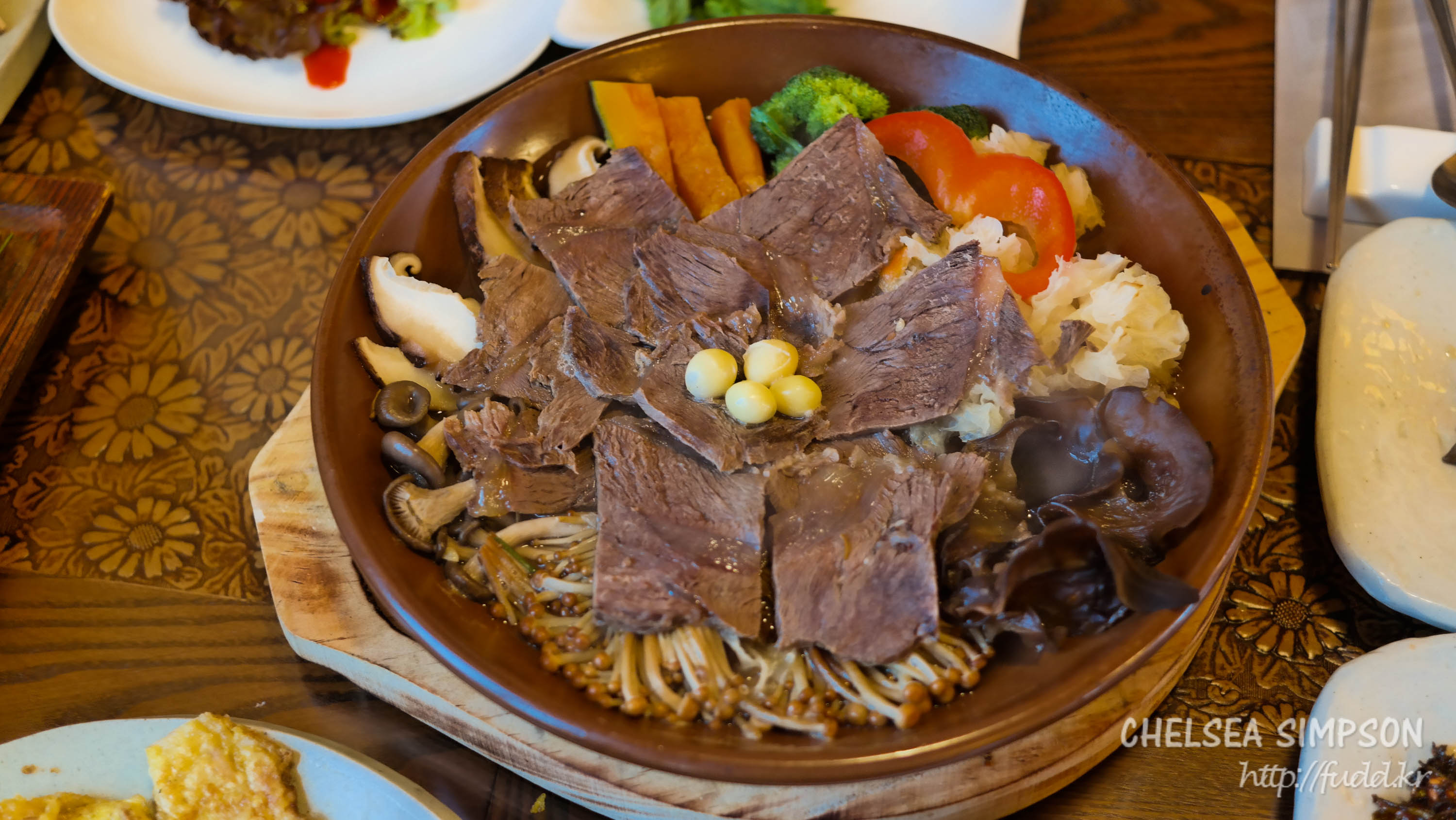 소고기 수육에 검은 목이, 흰 목이, 황금팽이, 표고 등 다양한 버섯을 곁들였다.