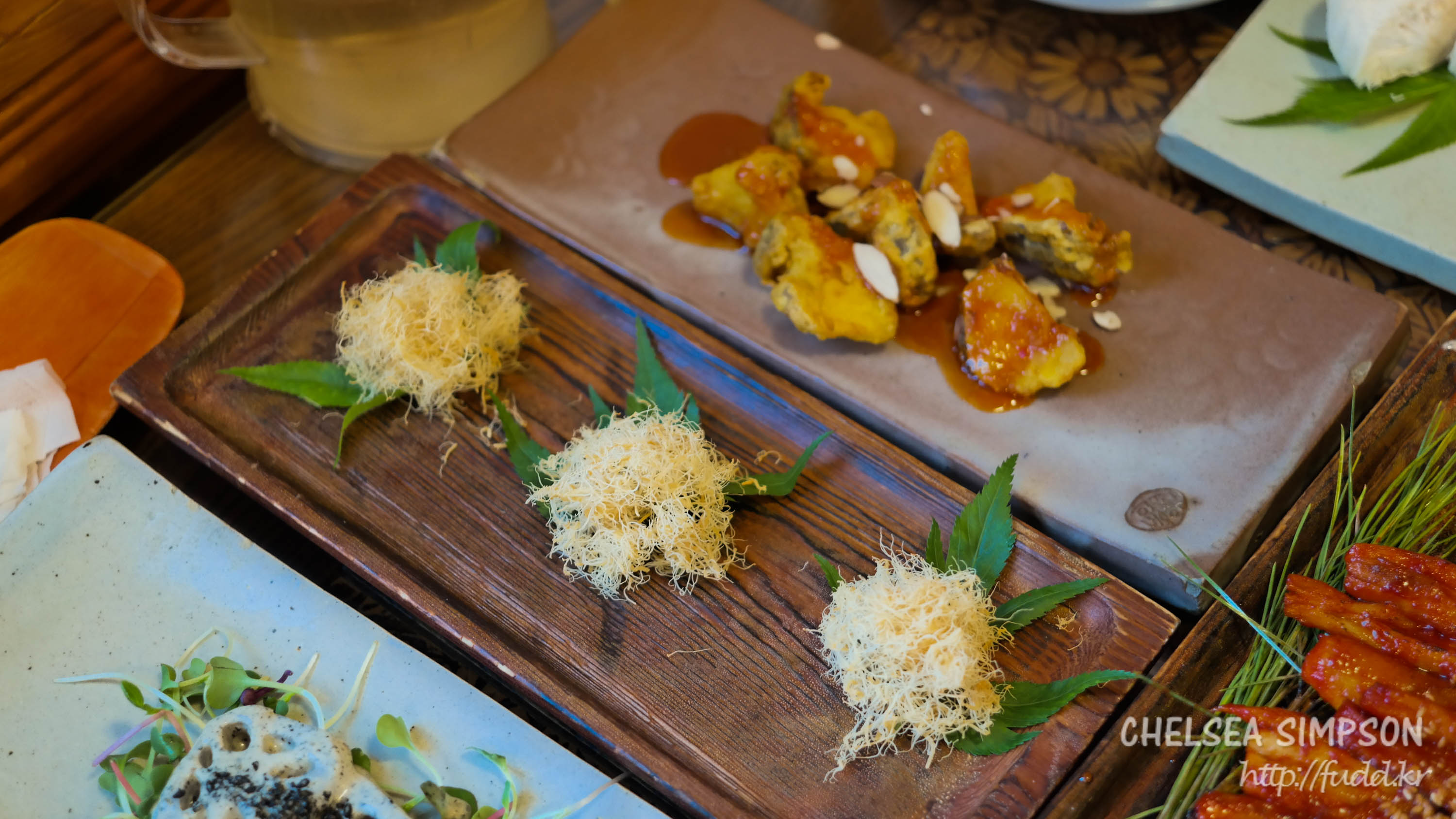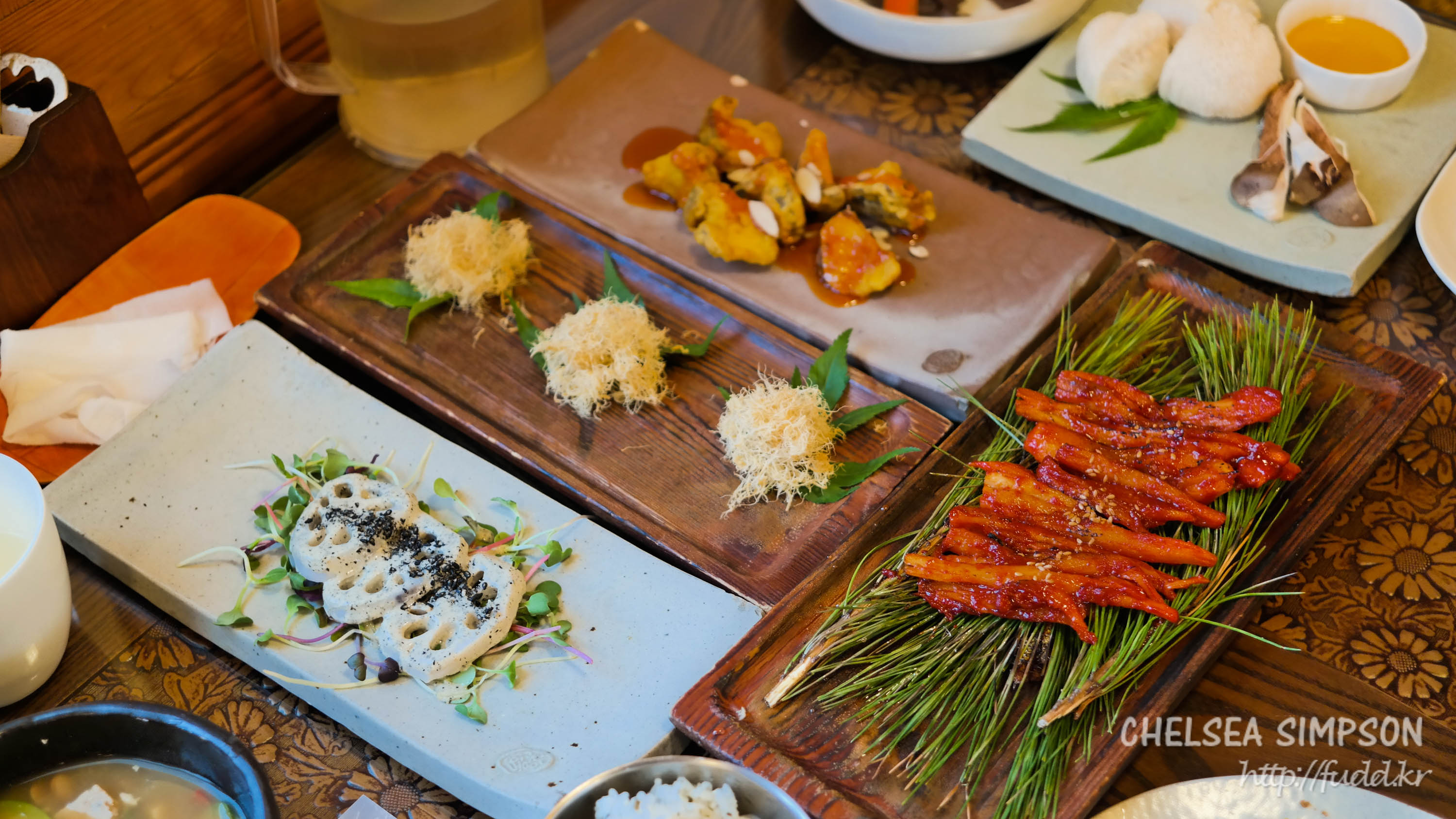 참깨 드레싱과 버무려 낸 연근 샐러드, 당귀잎에 올린 삼채, 버섯 강정, 더덕구이.