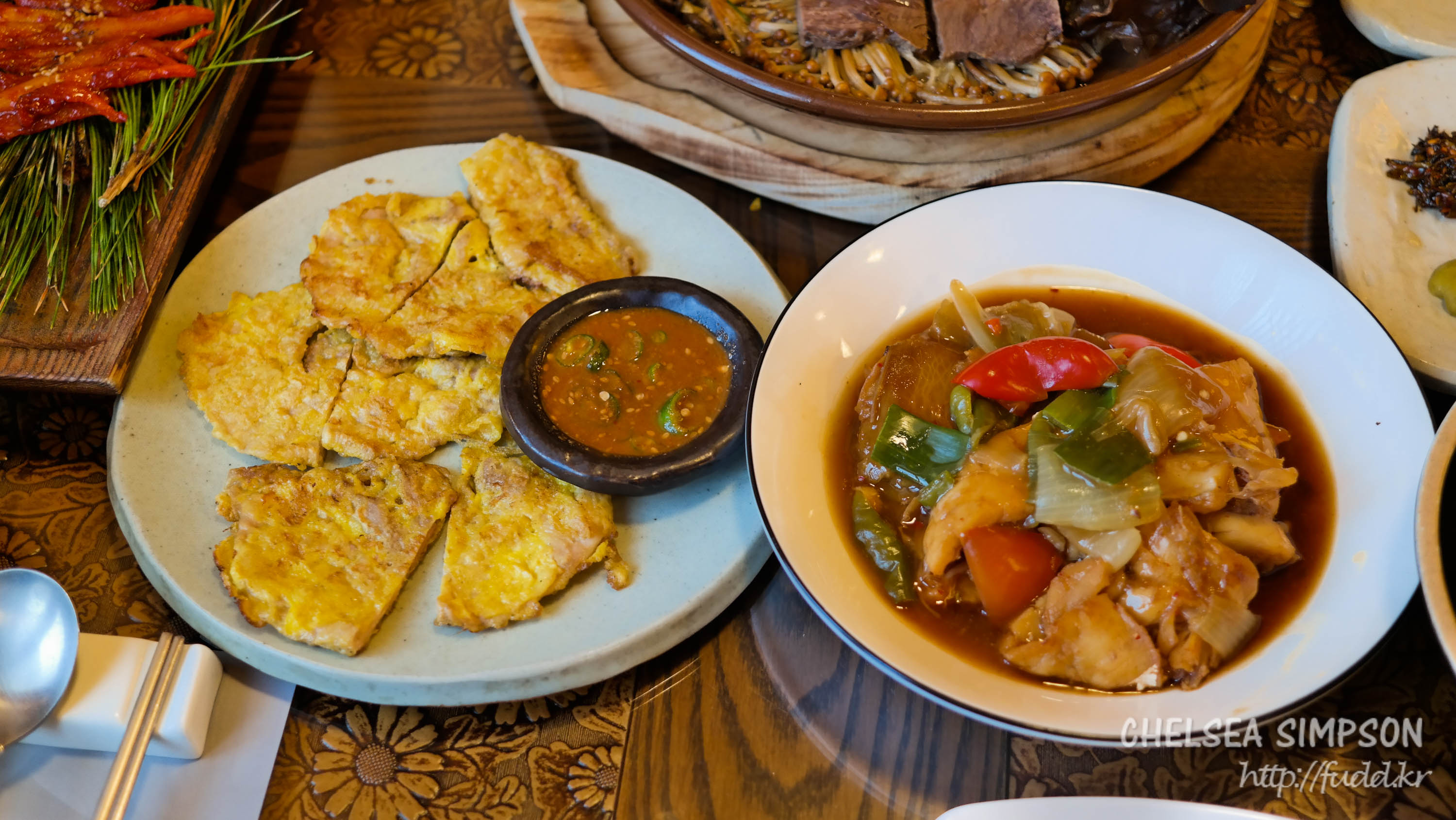 육전은 바로 부쳐내서 따끈하고 고소했고, 생선 조림은 달콤짭짤한 간장 양념과 생선살이 잘 어우러졌다.