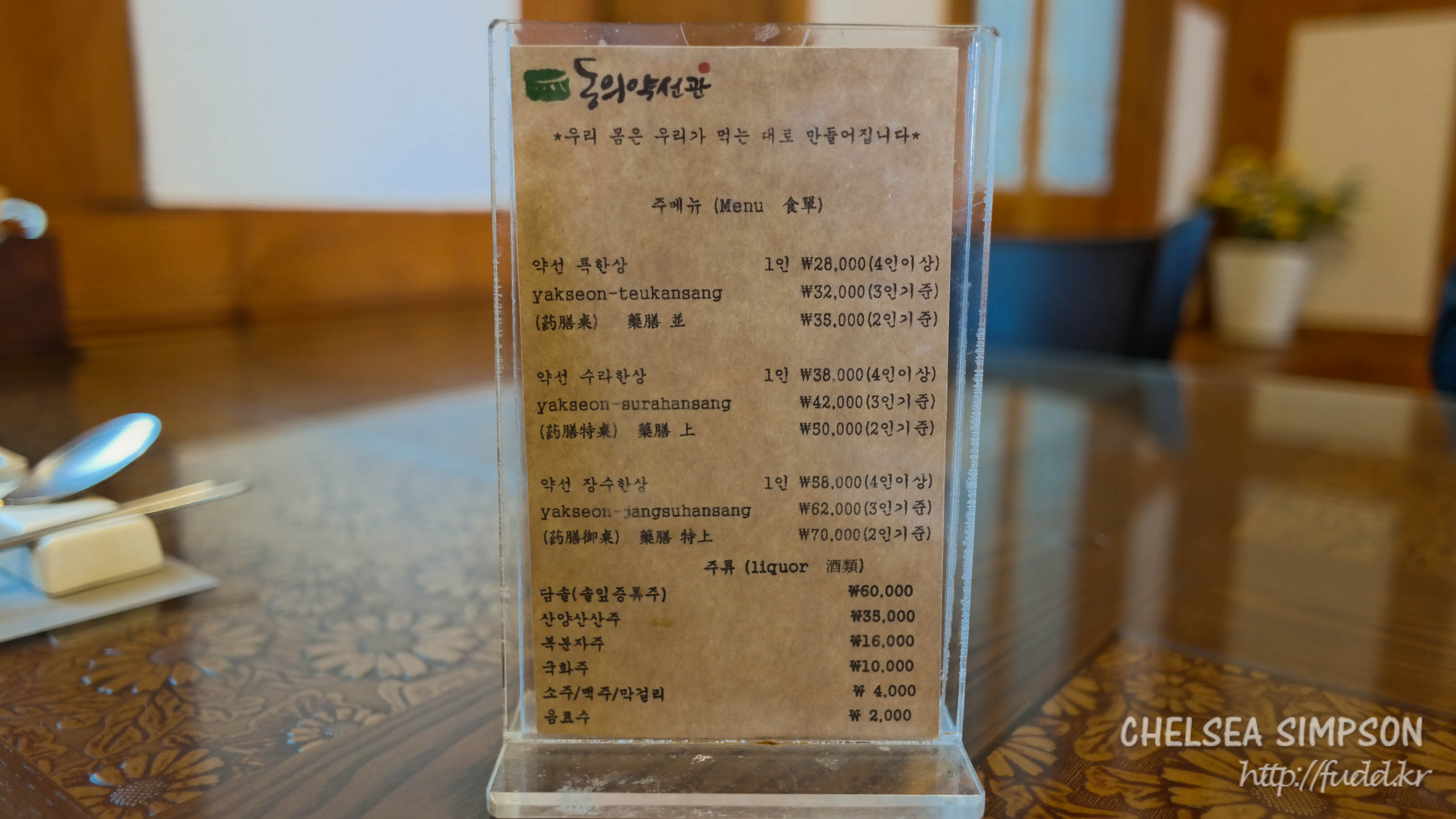 약선 특한상(2인 총 70,000원), 약선 수라한상(2인 총 100,000원), 약선 장수한상(2인 총 140,000원) 순으로 비싸진다.