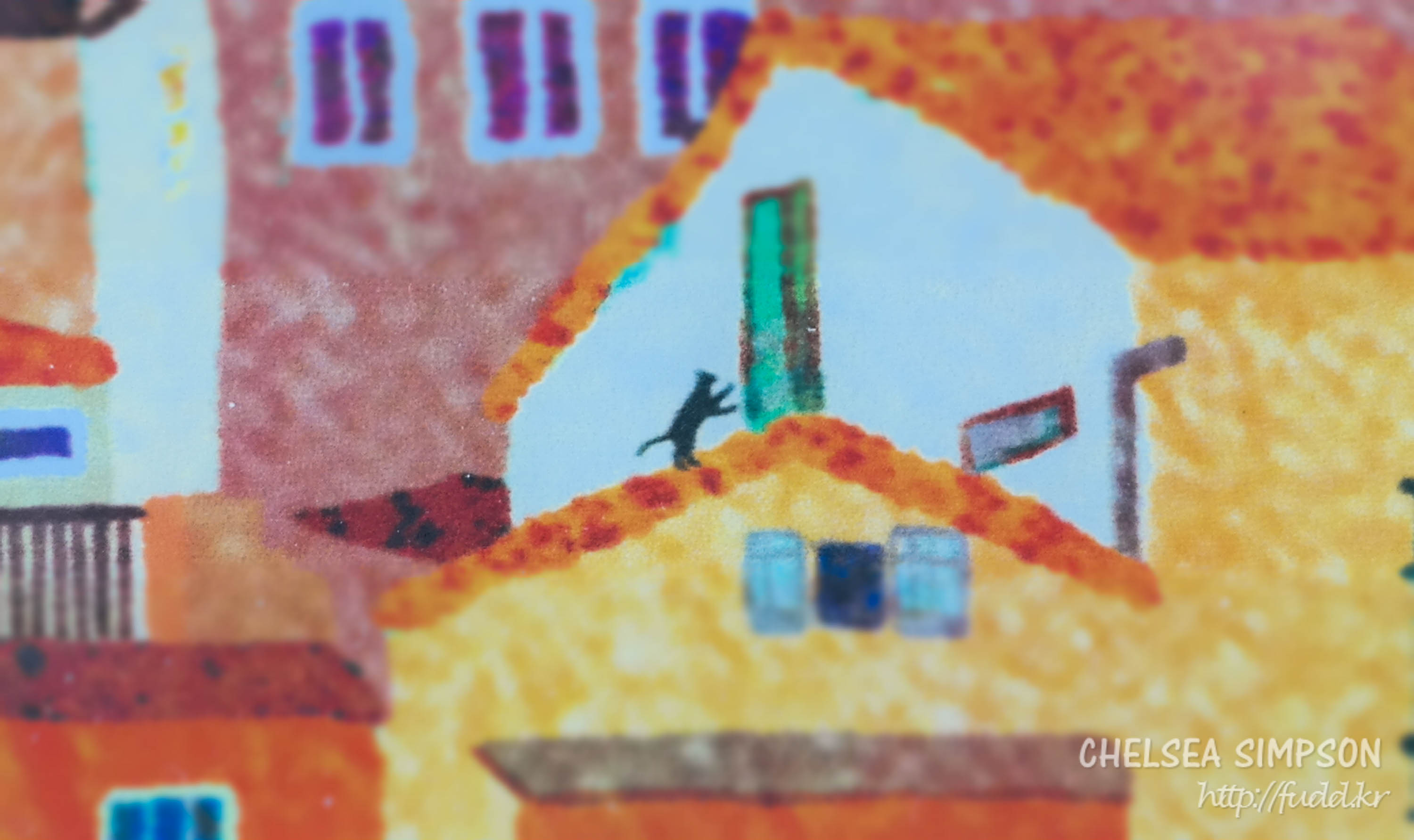 전체 그림 속 고양이 위치는 노란 점선 동그라미로 표시해두었다.