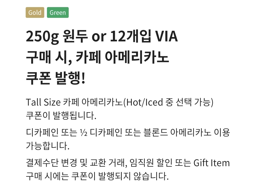 스타벅스 골드/그린 회원은 250g 원두 주문시 아메리카노 무료 쿠폰이 증정된다.