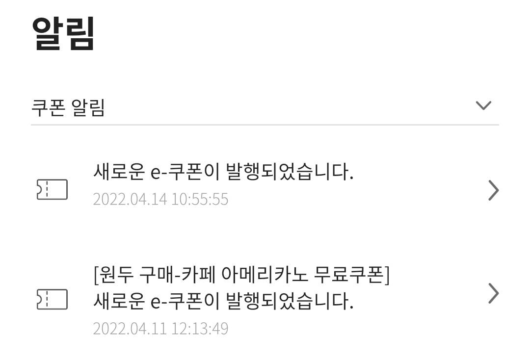 스타벅스 어플을 통해 위 이미지와 같이 [원두 구매-카페 아메리카노 무료쿠폰]이 발행되었다는 알림이 온다.